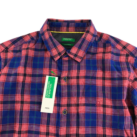 Benetton adult S blue red checked long sleeve buttoned shirt