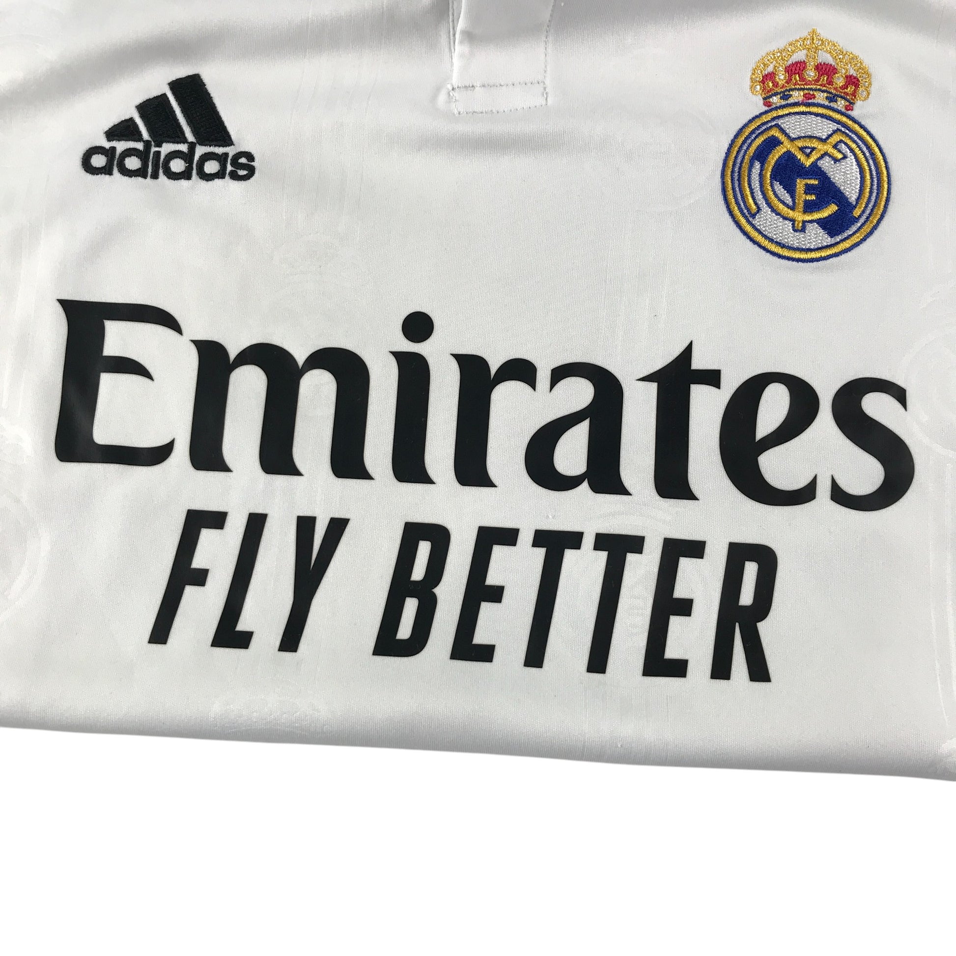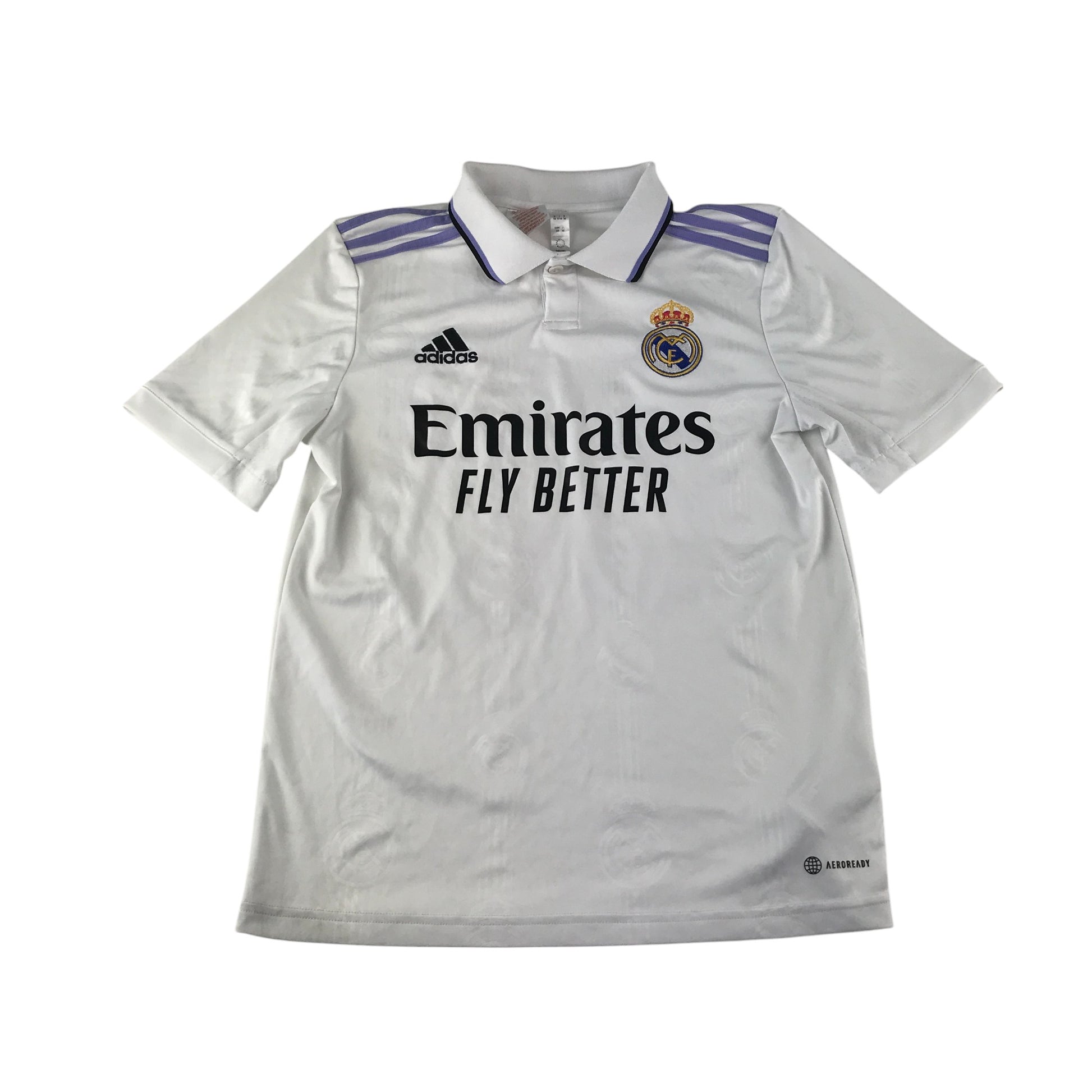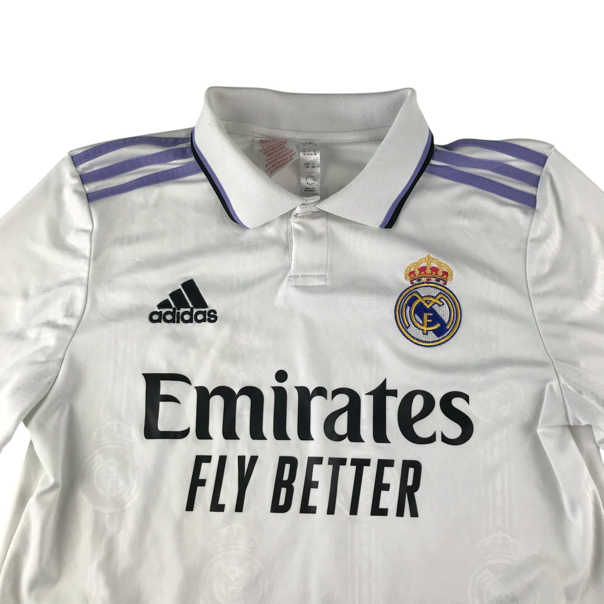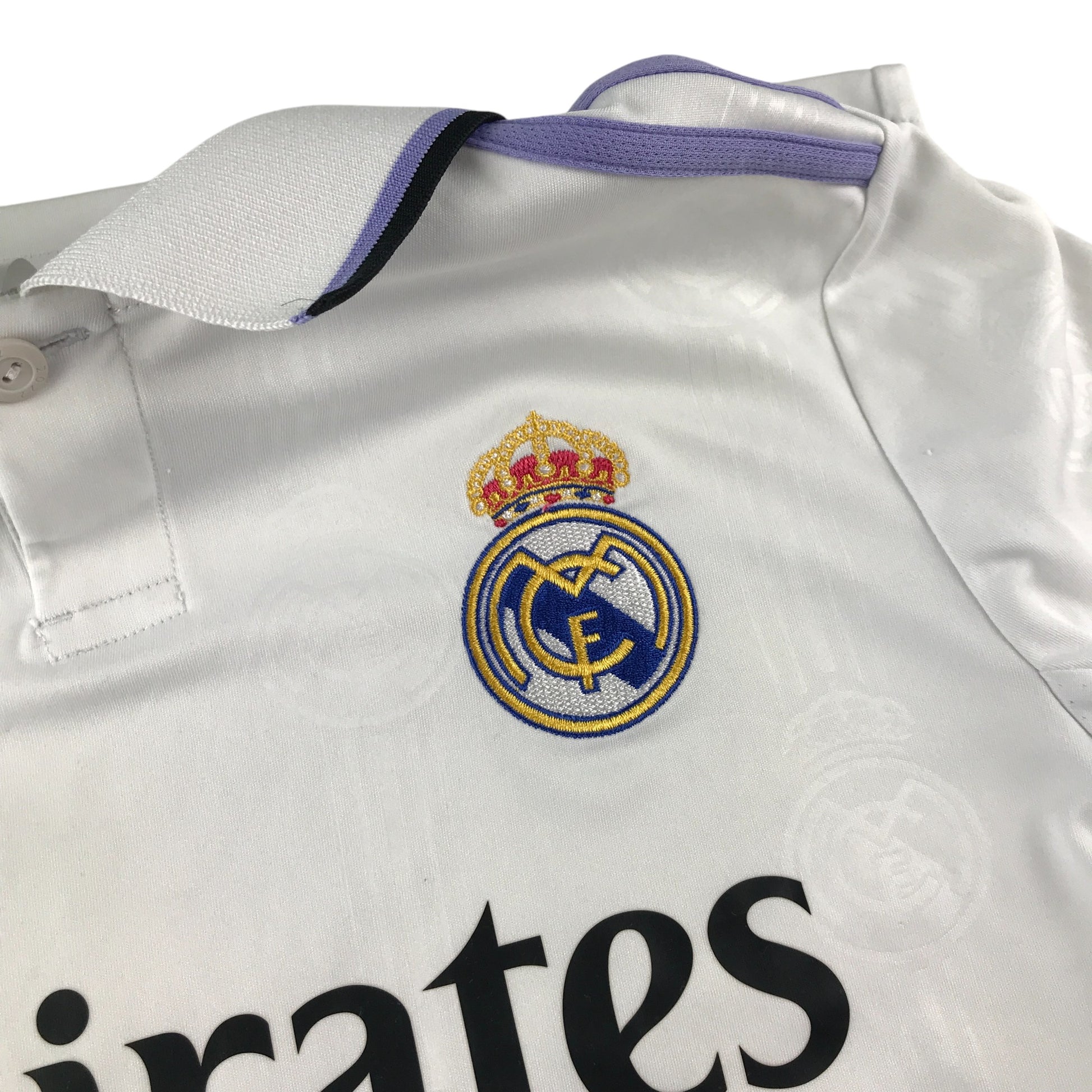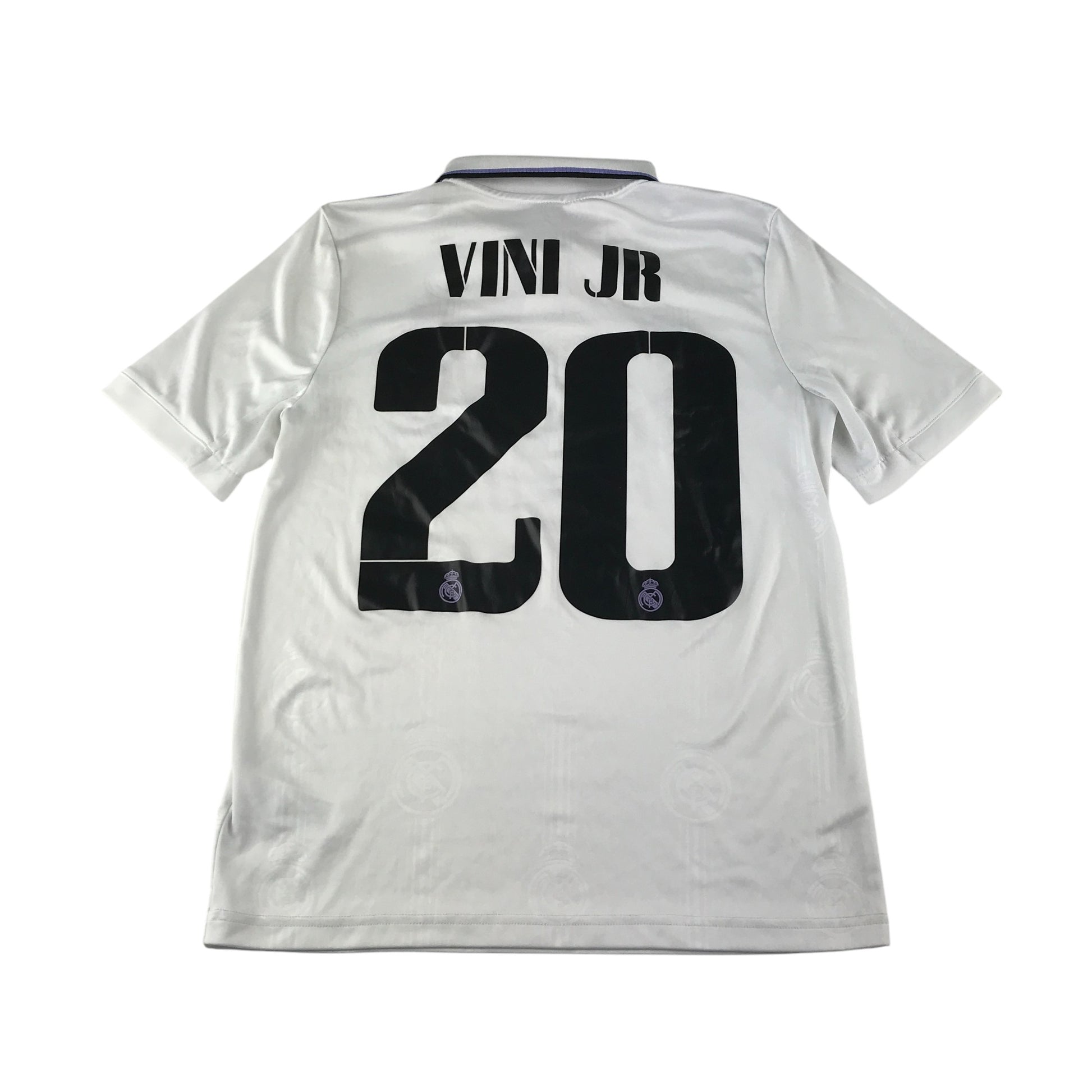 - Clothing features: short sleeve Real Madrid football strip home 2022-2023, number 20 Vini Junior, lilac shoulder stripes and Emirates sponsorship logo, polo shirt collars