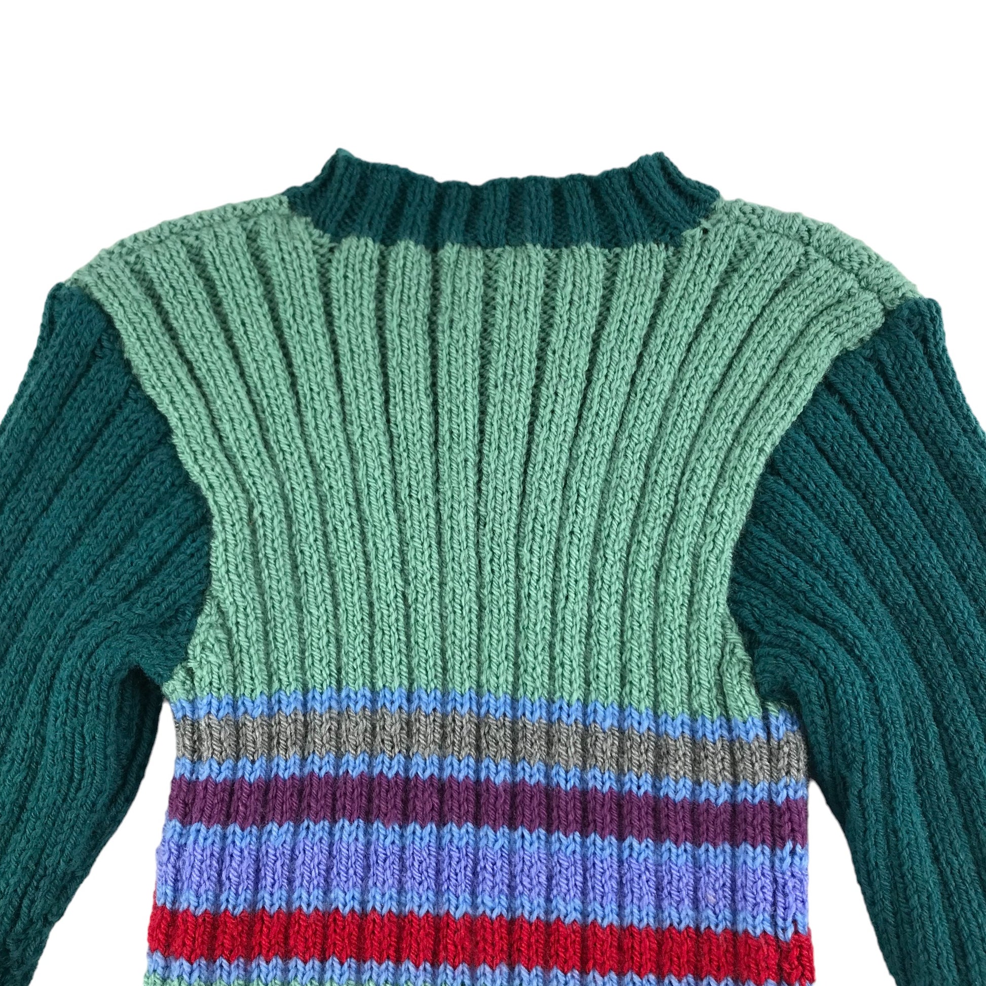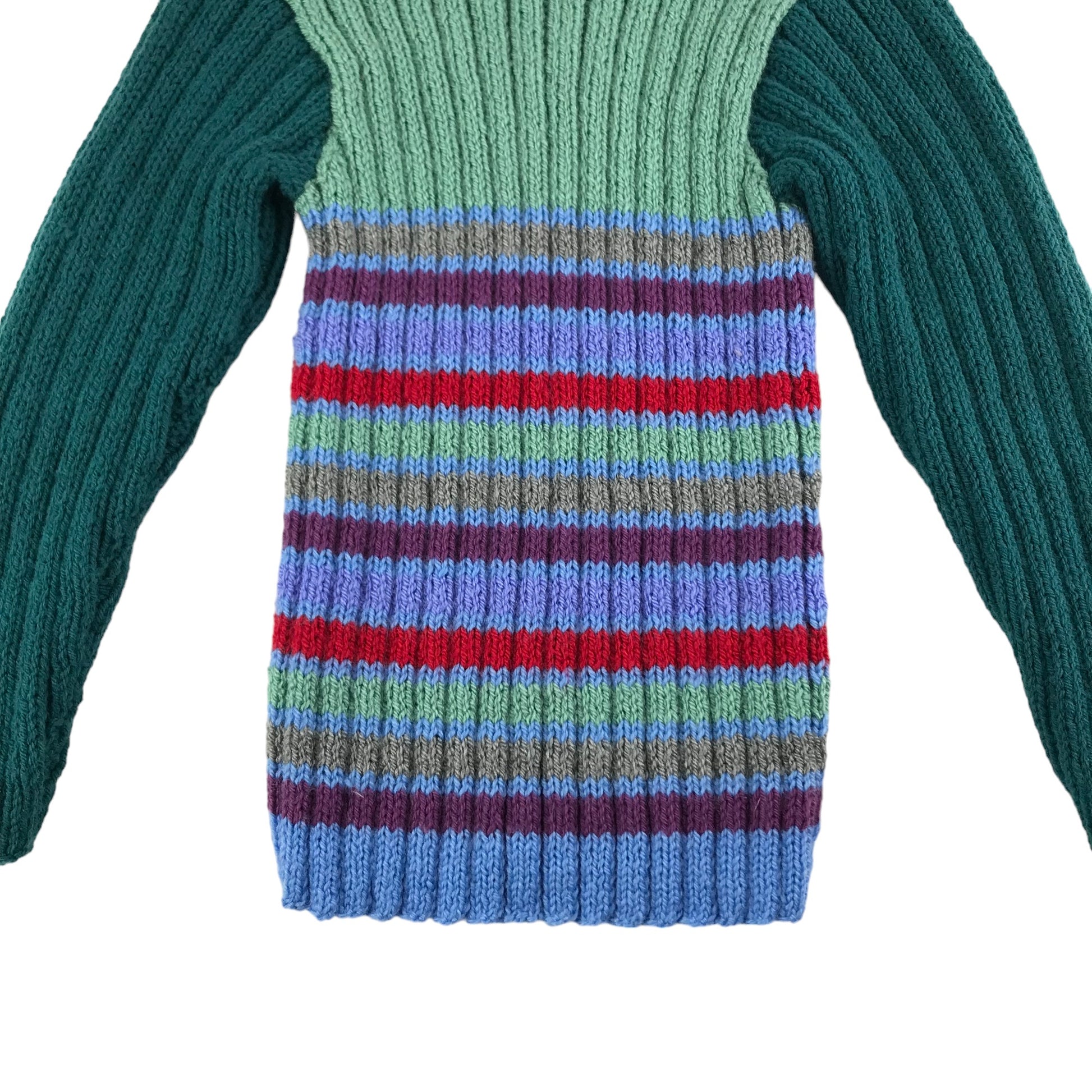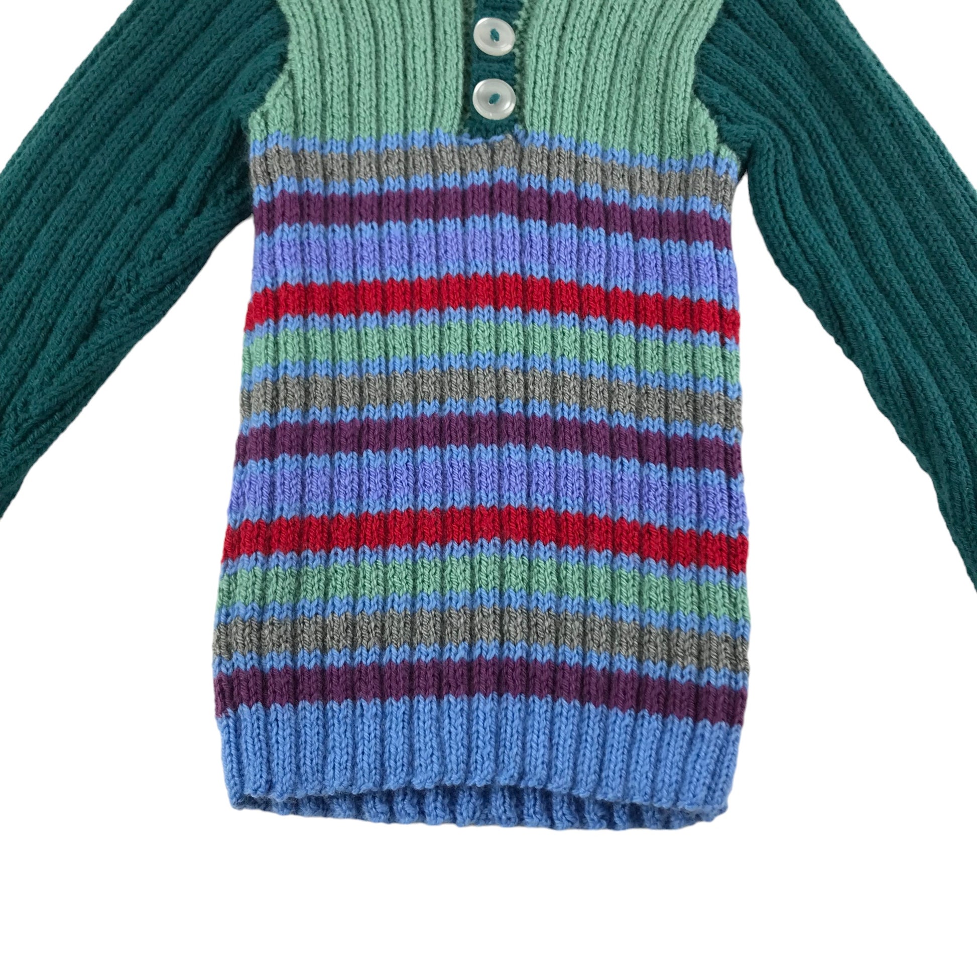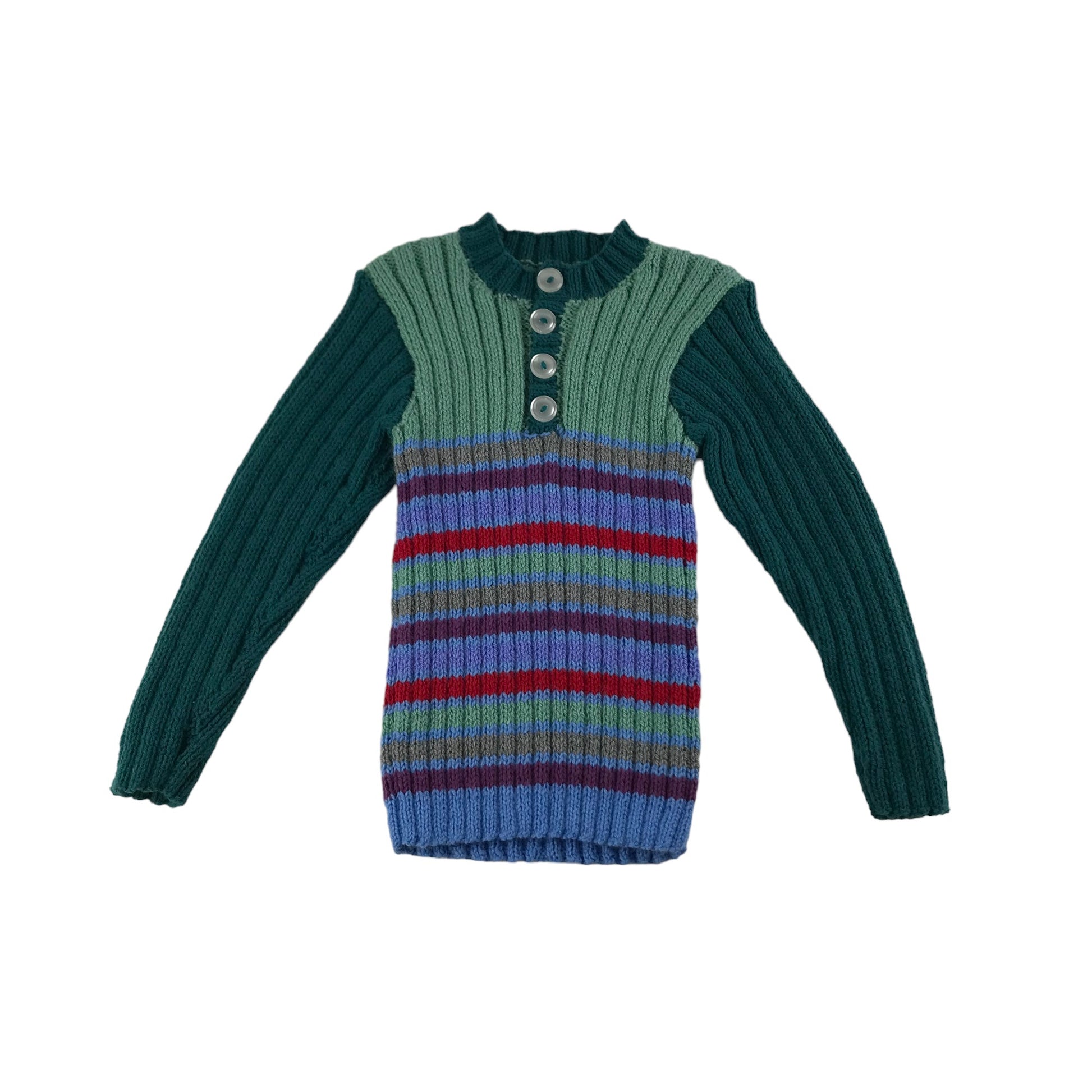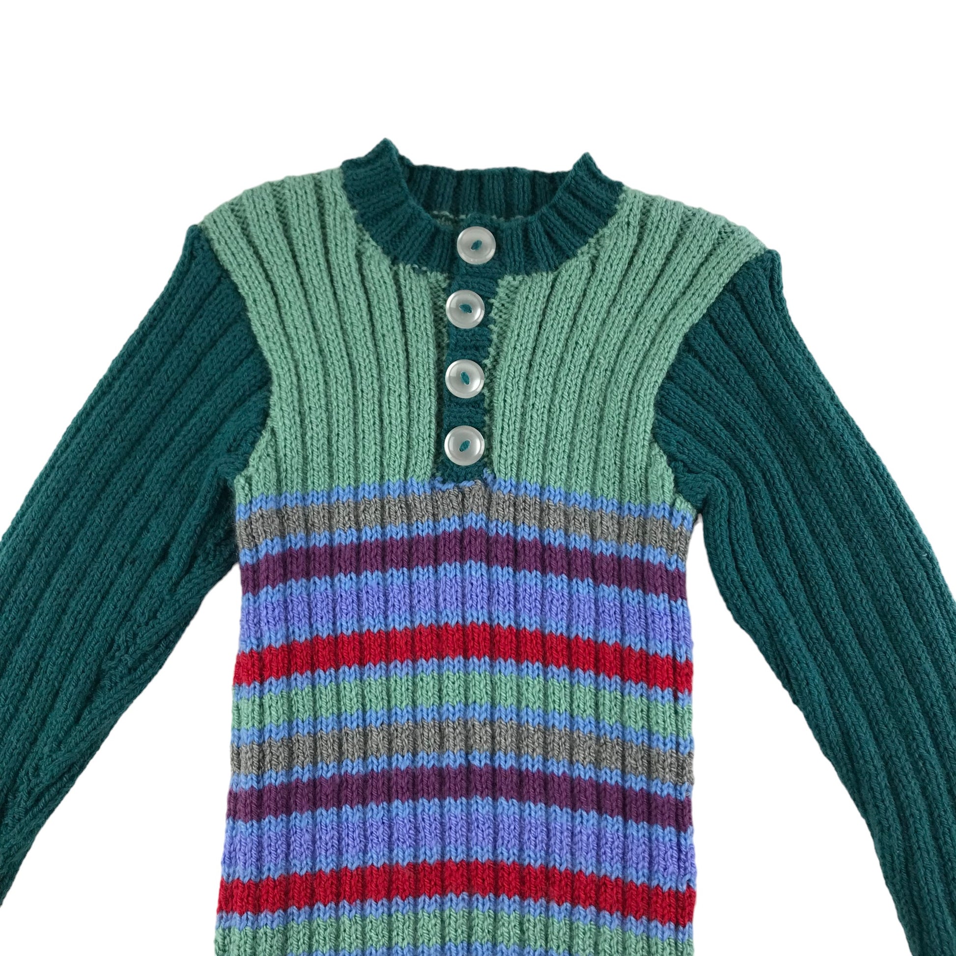 Handmade Jumper Age 5-7 Green Stripy Stretchy Knit with Buttons