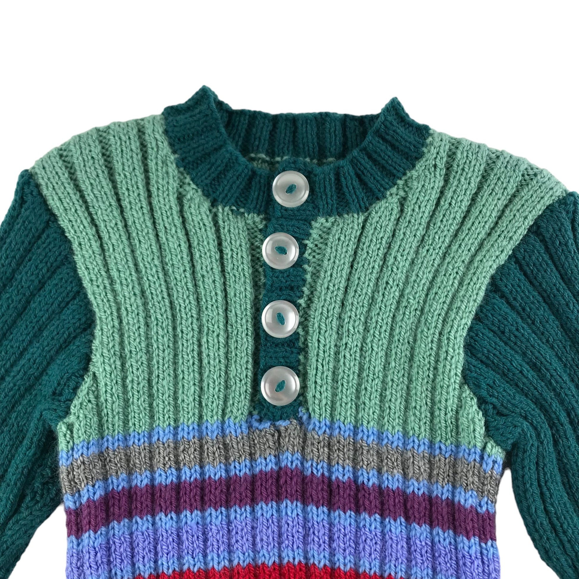- Description: Hand knitted stripy and panelled jumper with long sleeves, crew neck and buttons