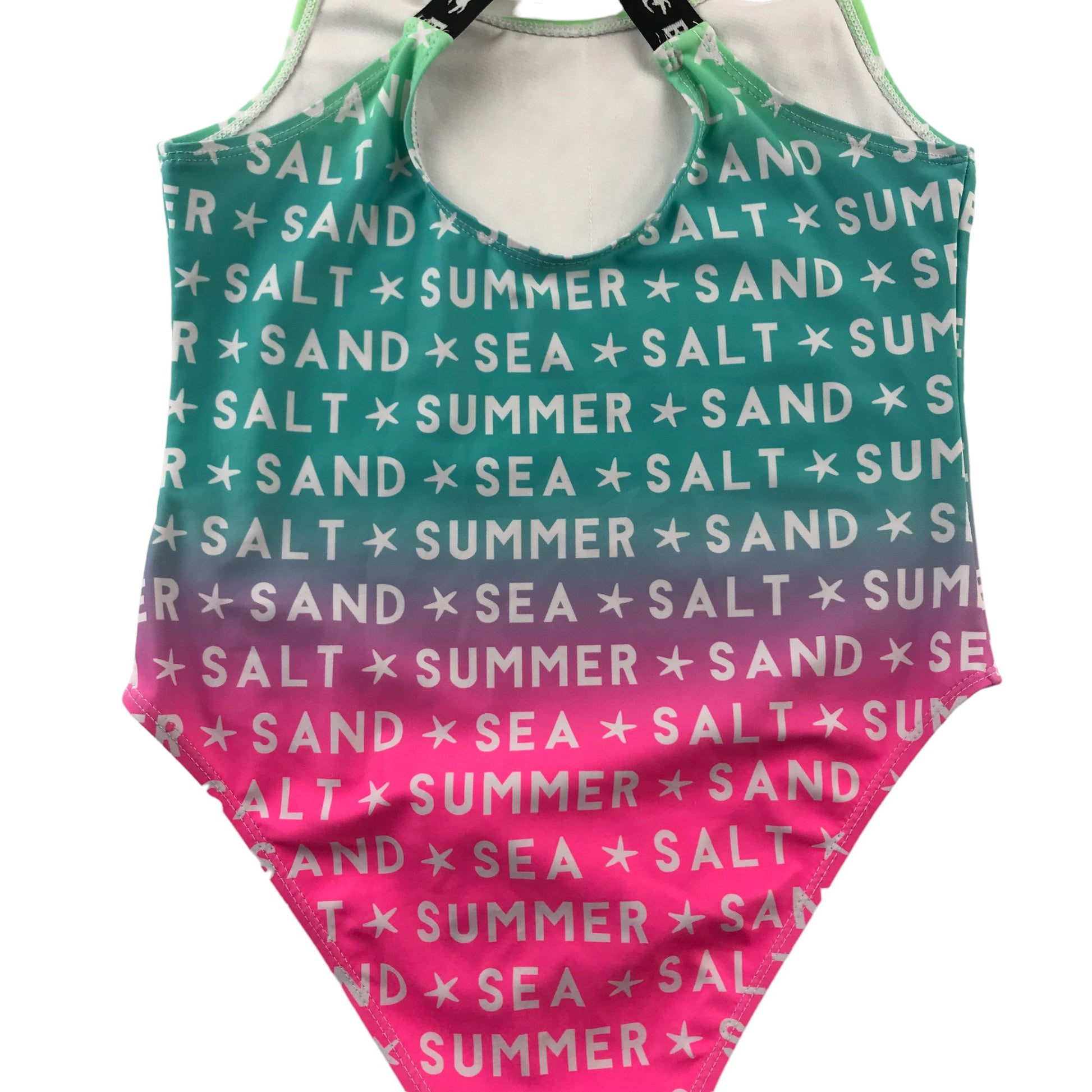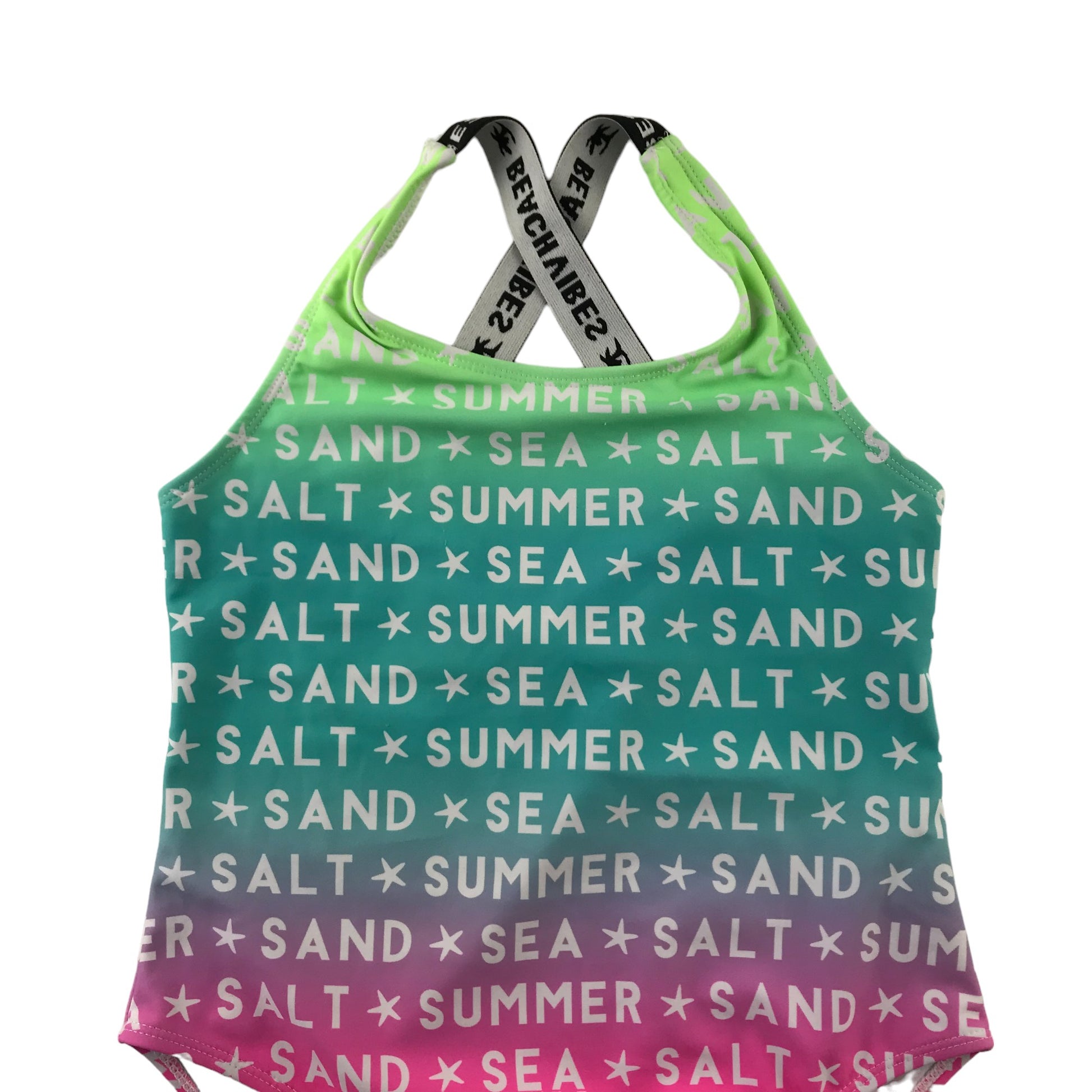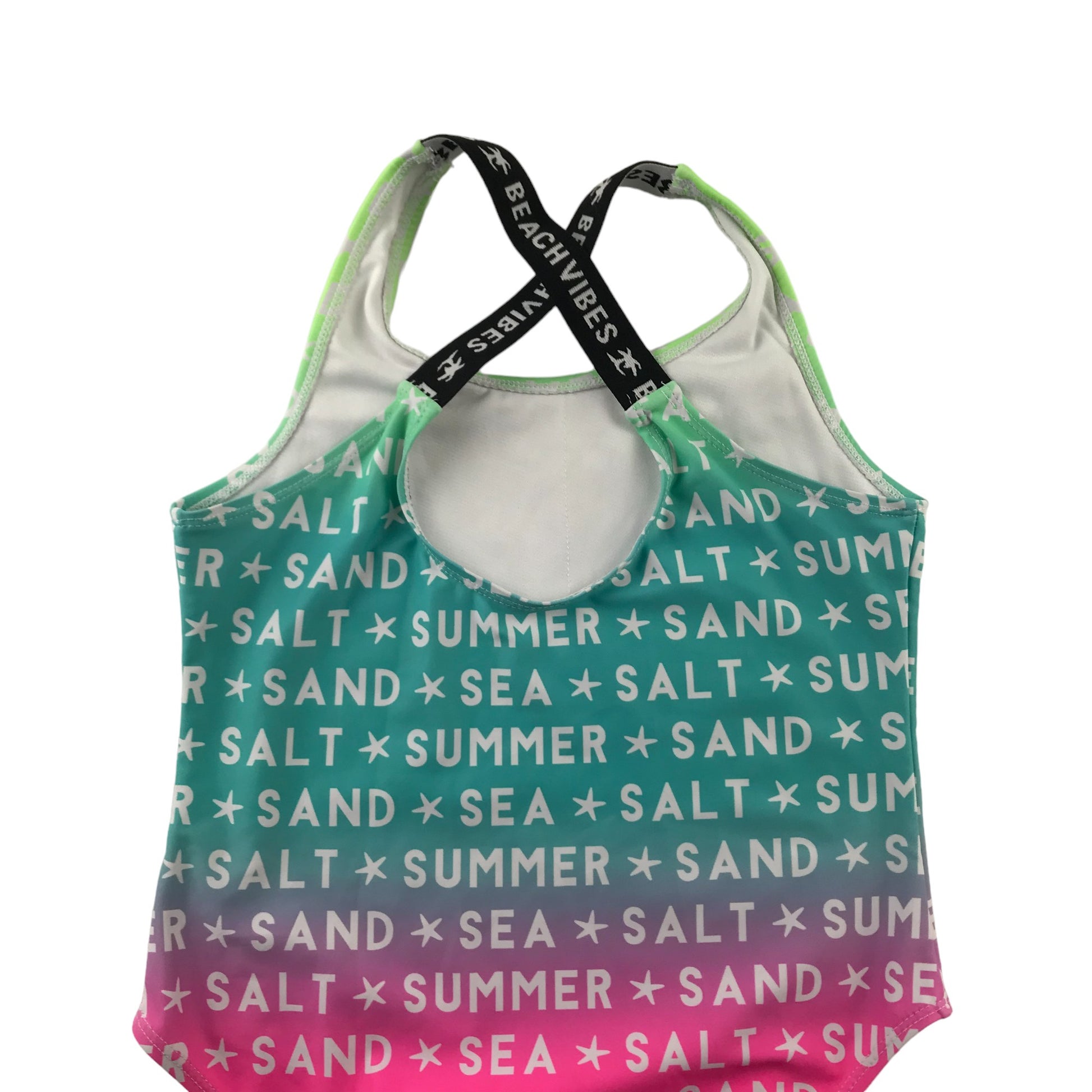Preloved second hand Shein Swimsuit Age 9-10 Blue Pink Green Text Graphic Print One Piece Cossie