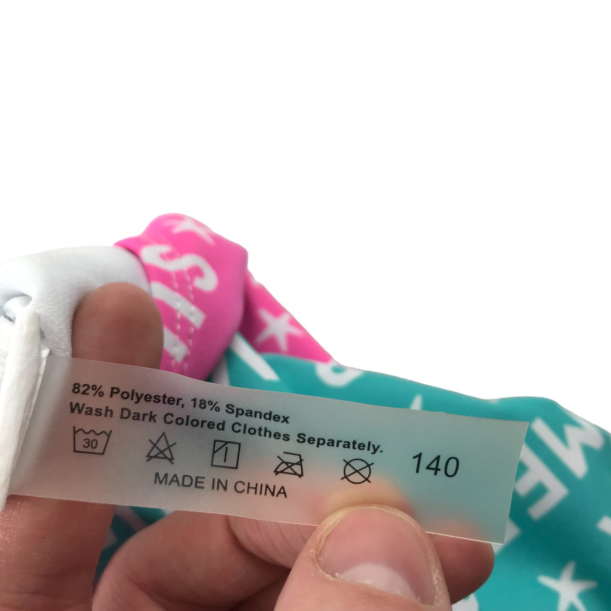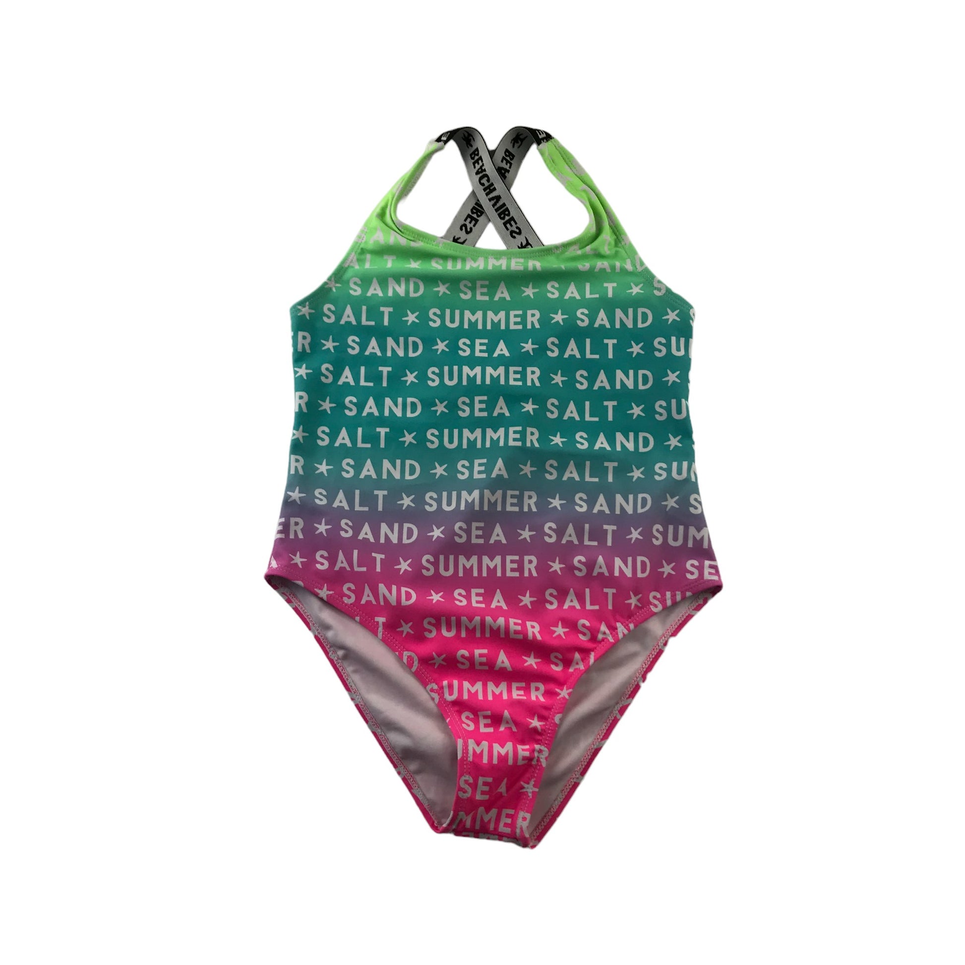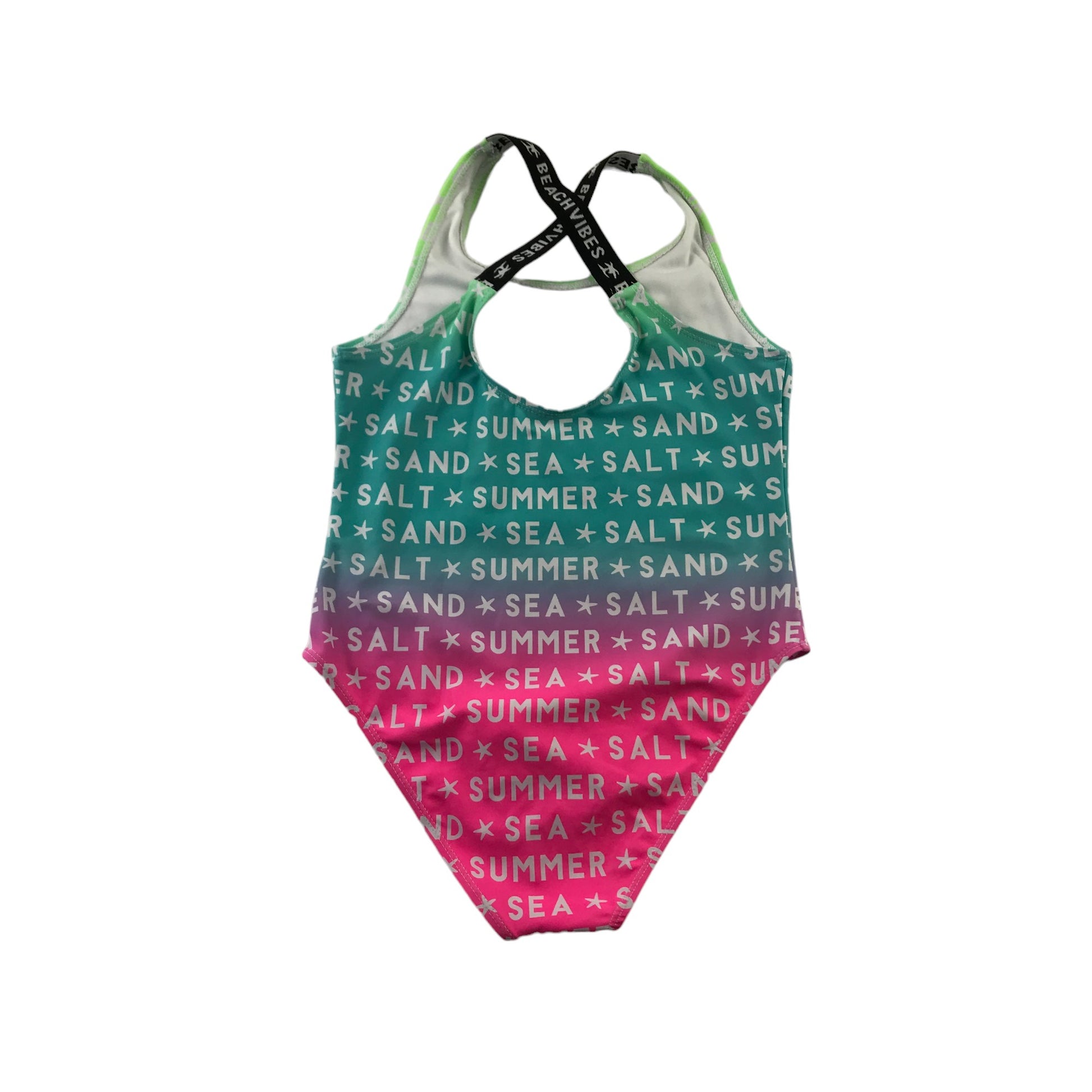 Preloved second hand Shein Swimsuit Age 9-10 Blue Pink Green Text Graphic Print One Piece Cossie