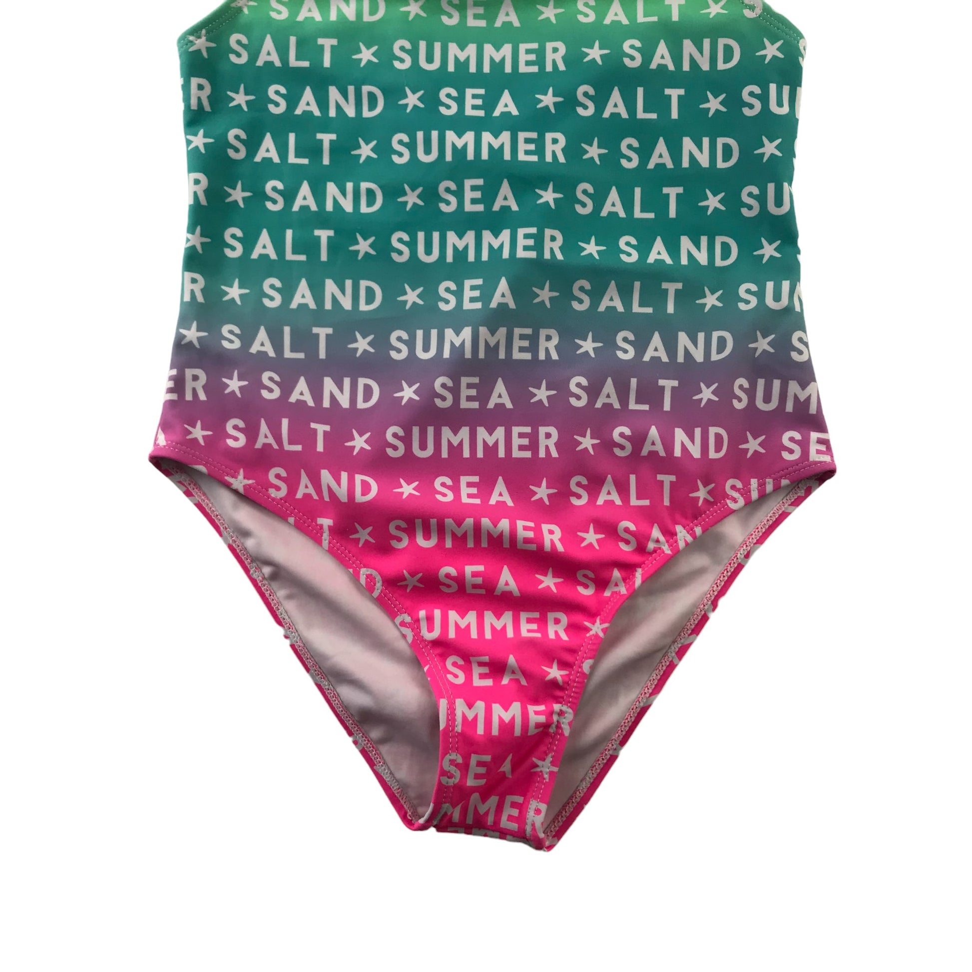 Shein Swimsuit Age 9-10 Blue Pink Green Text Graphic Print One Piece Cossie