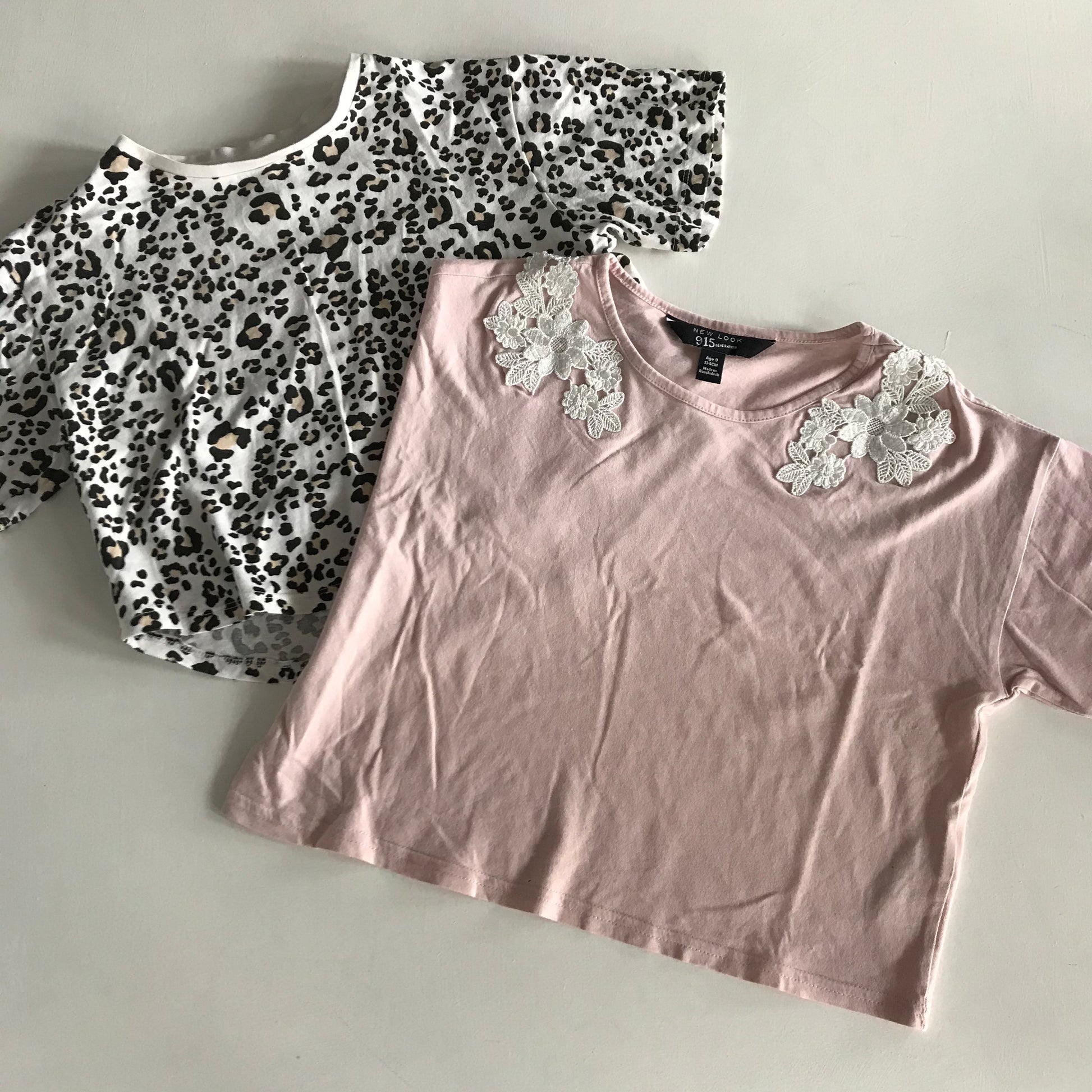 Preloved bundle of 2 tops. Pink crop with lace flower applique and leopard print crop top.