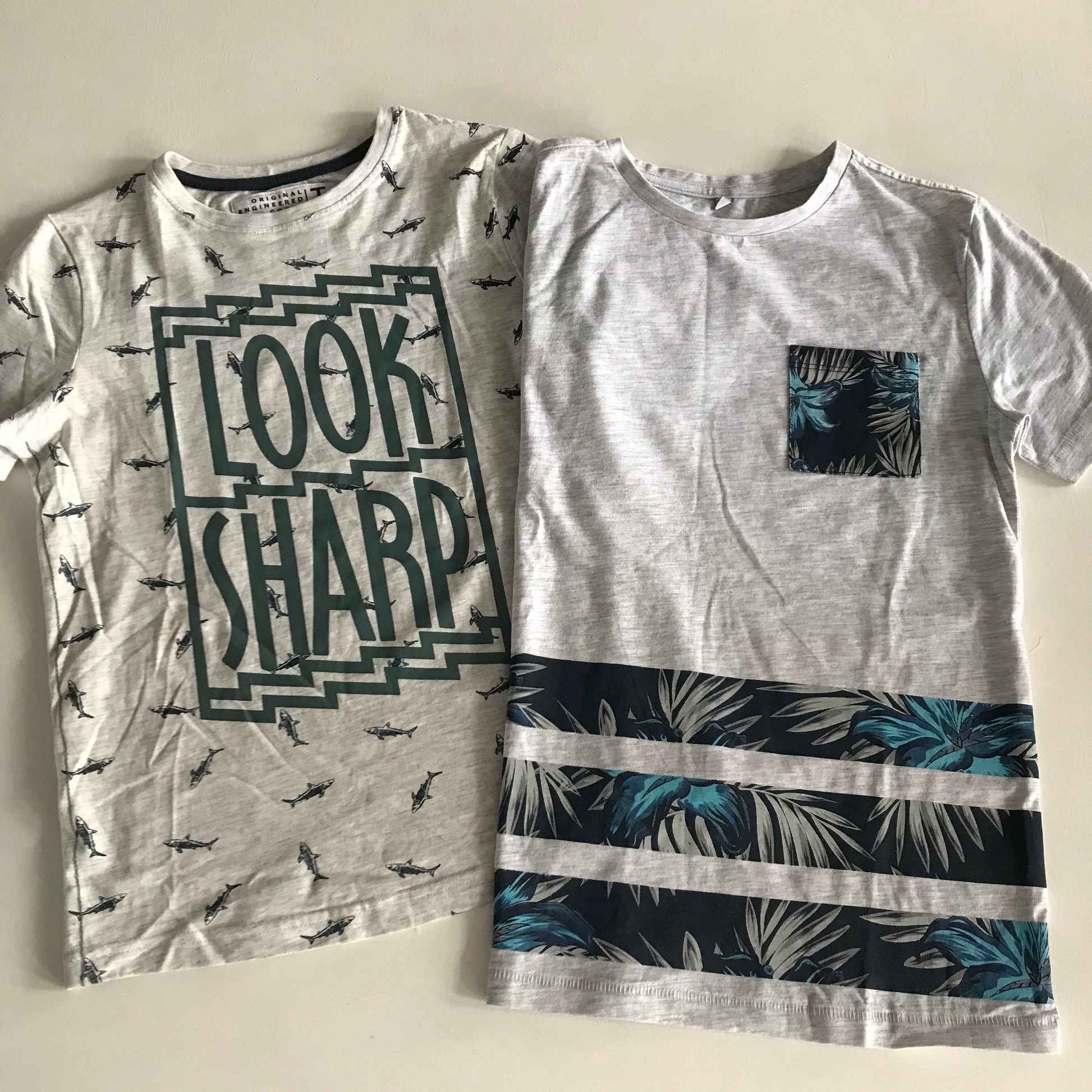 Preloved bundle of 2 tops. Palm tree pattern t-shirt and 'Look Sharp' shark pattern t-shirt.