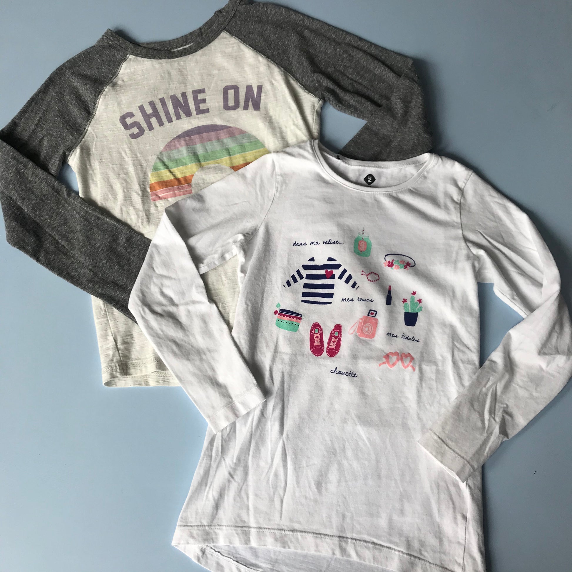 Preloved bundle of 2 tops. White long sleeve tops with 'Shine On' message and French themed design.
