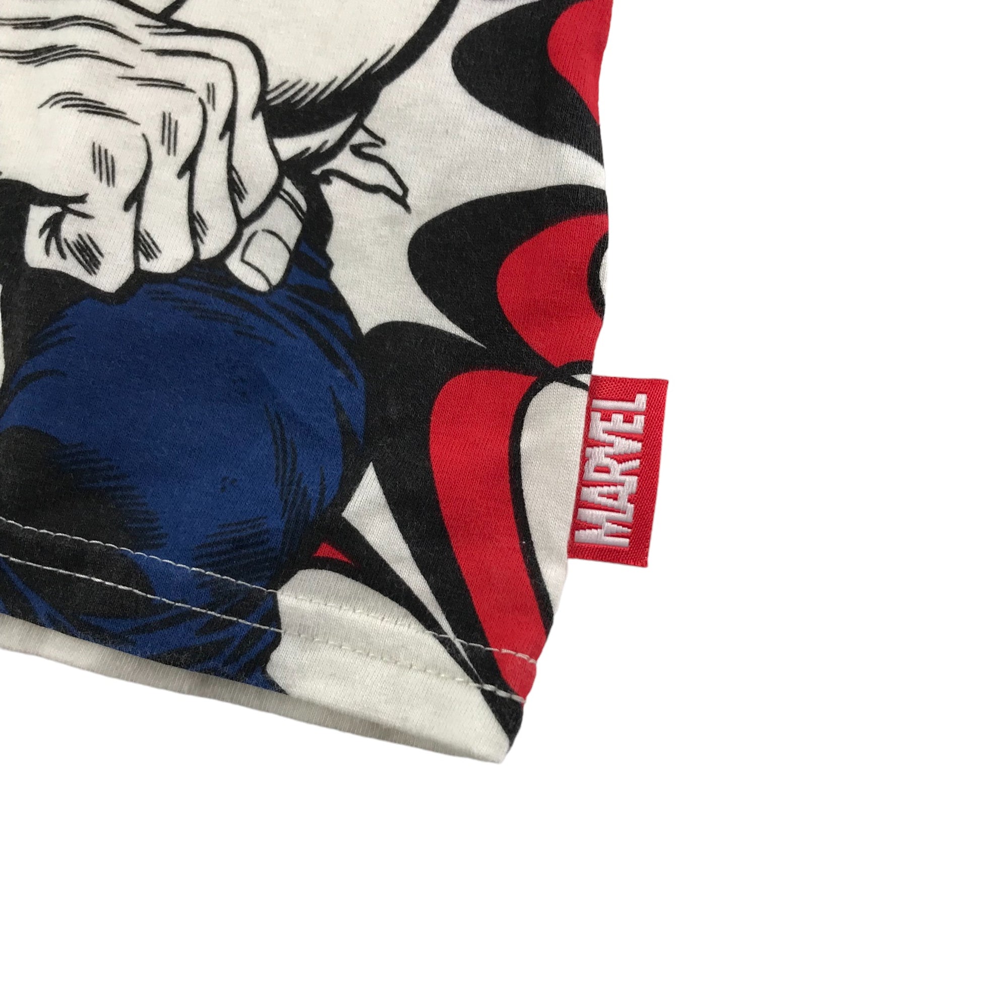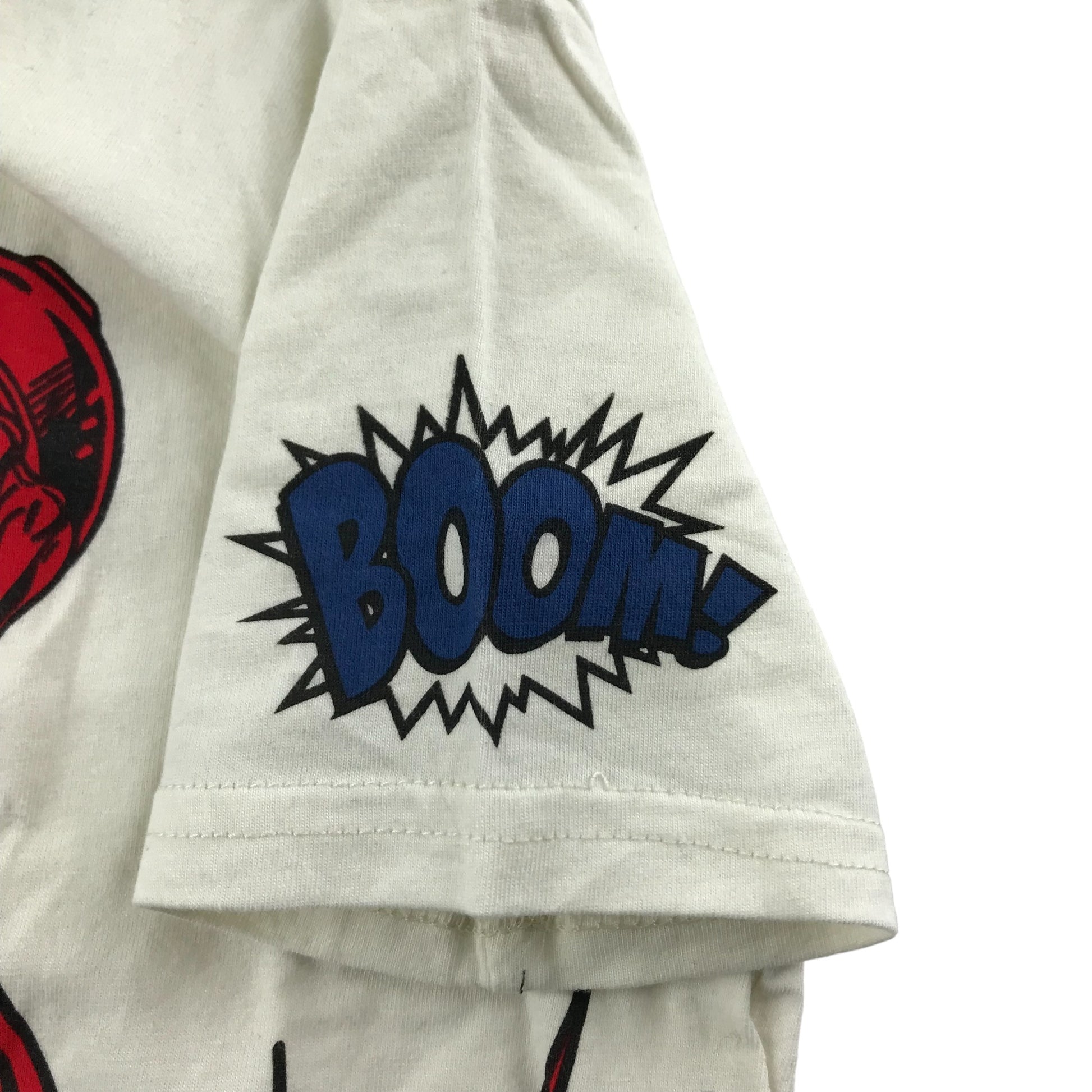 - Description: White comic book style Ironman and Hulk Graphic Short sleeve boom on the sleeve with crew neck