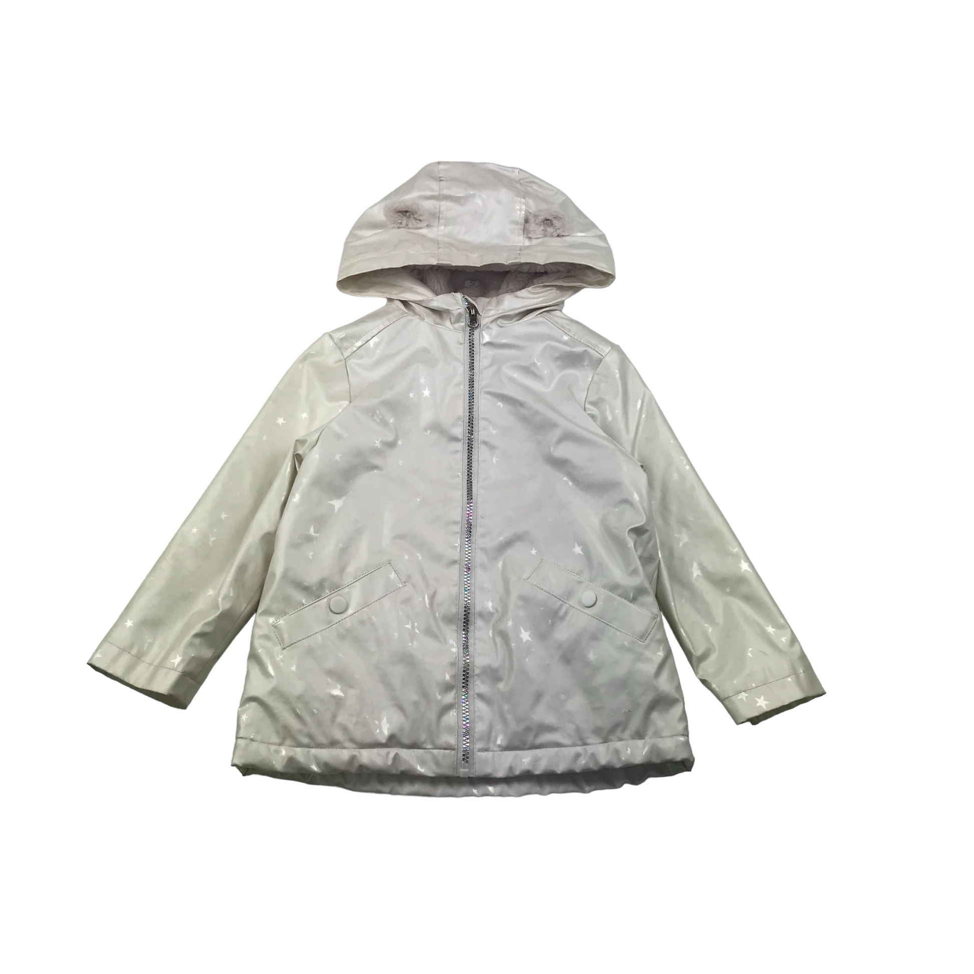 - Description: Pearl effect white cream colour faux fur lined rain coat with hood and zipper, little star patterns