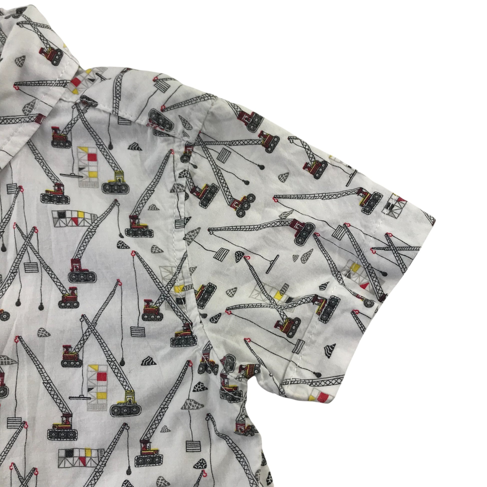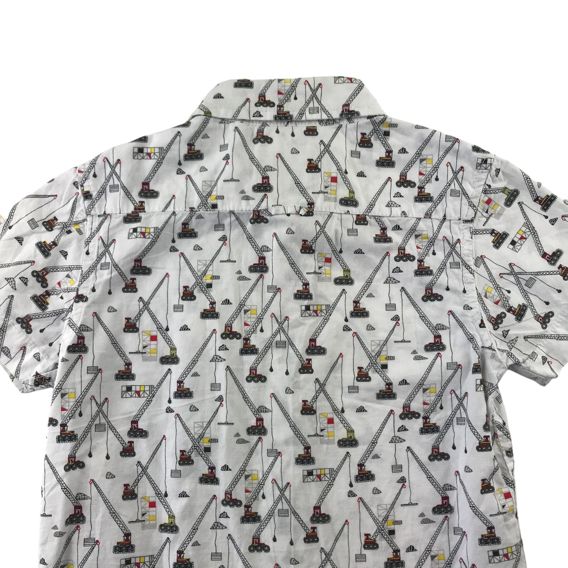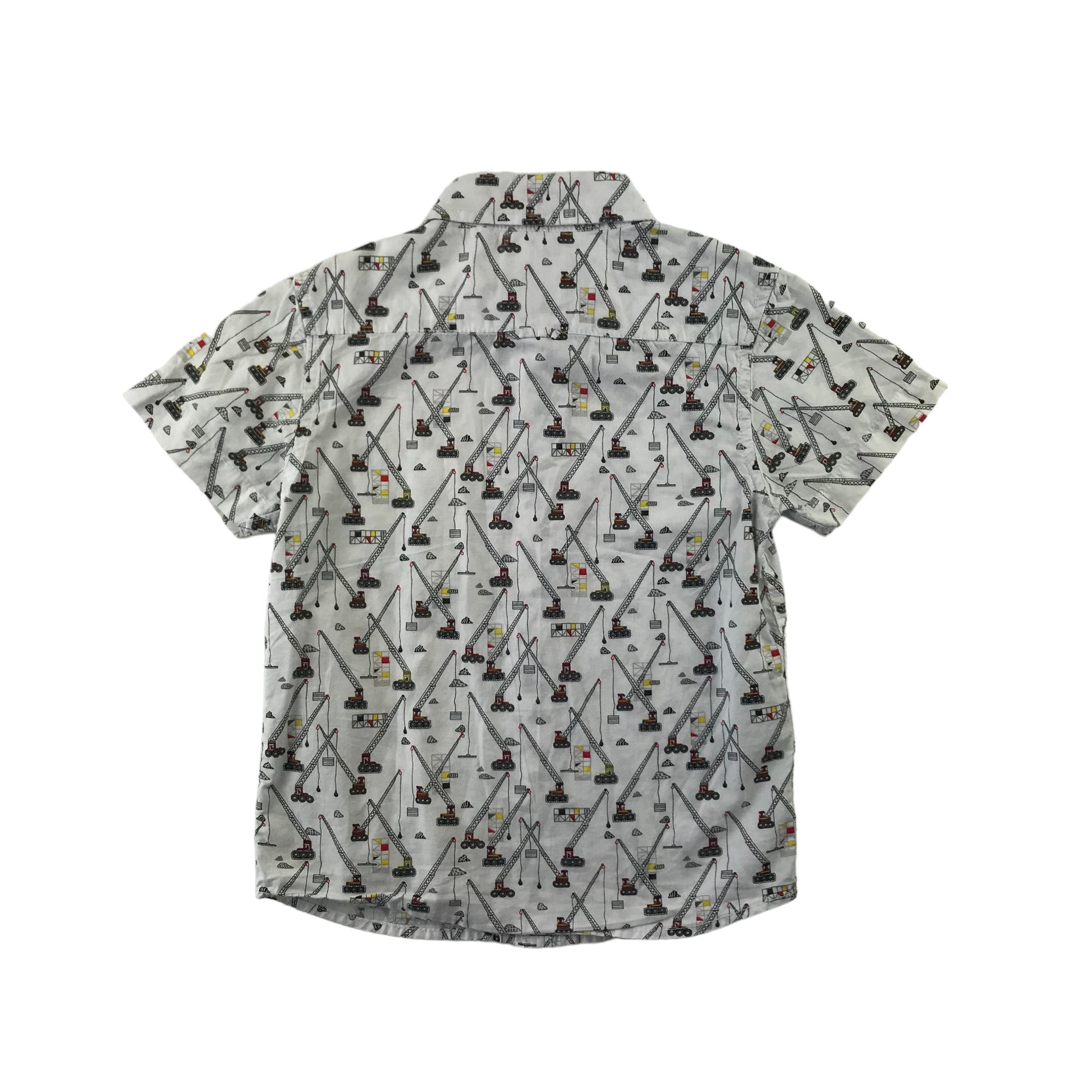 Preloved second hand Tu Shirt Age 4 White Crane Construction Print Short Sleeve Button Up Cotton