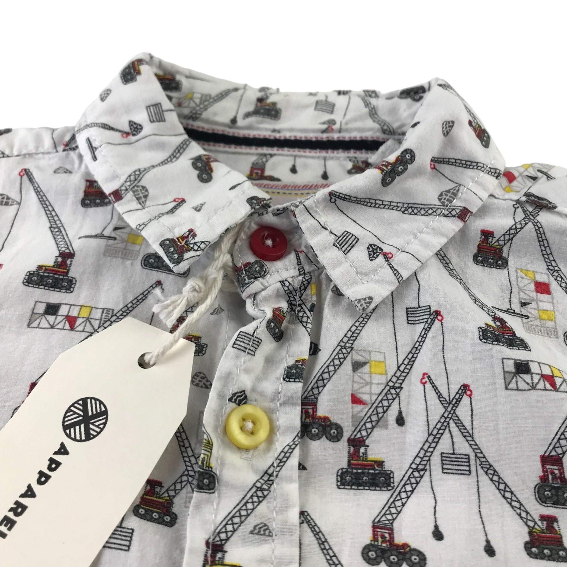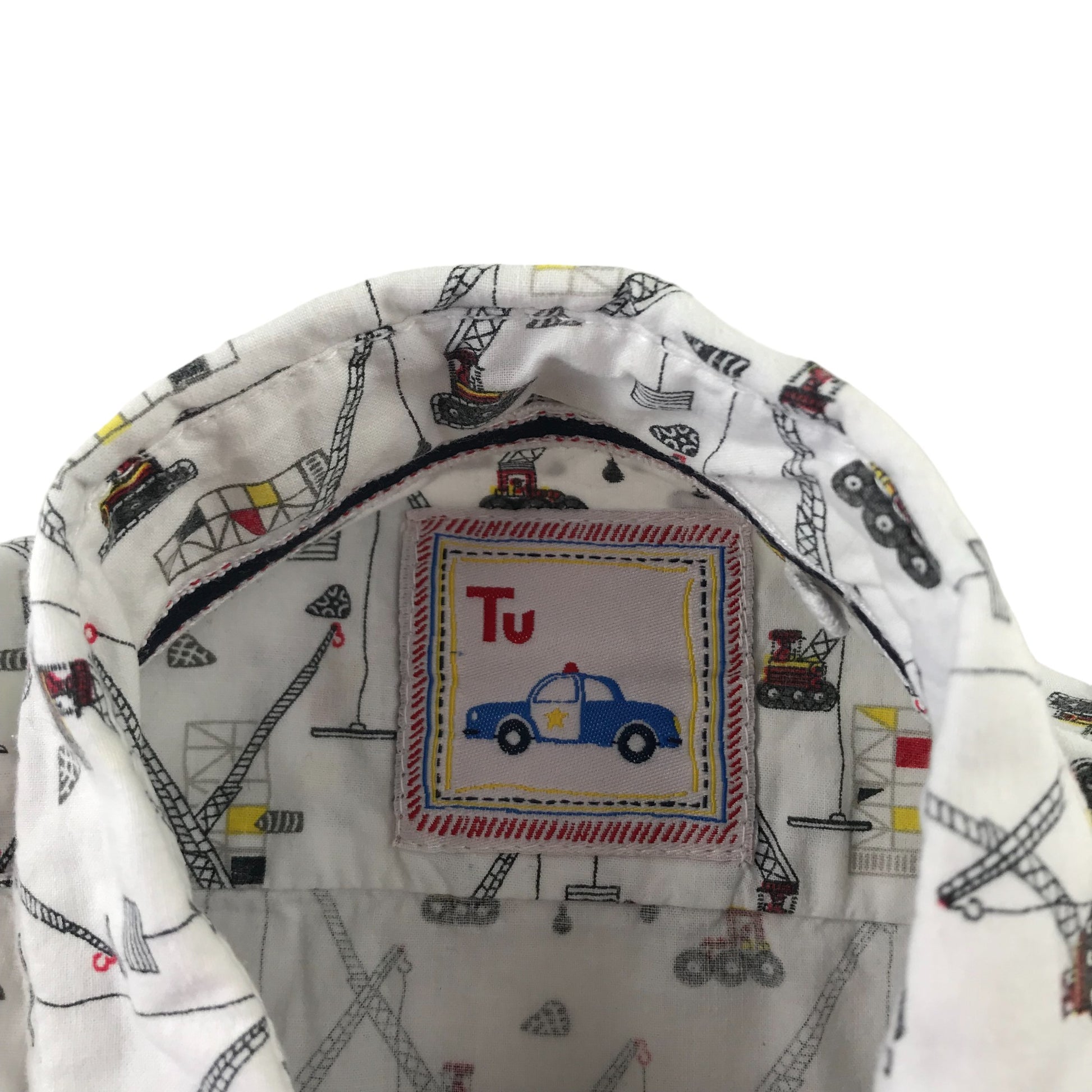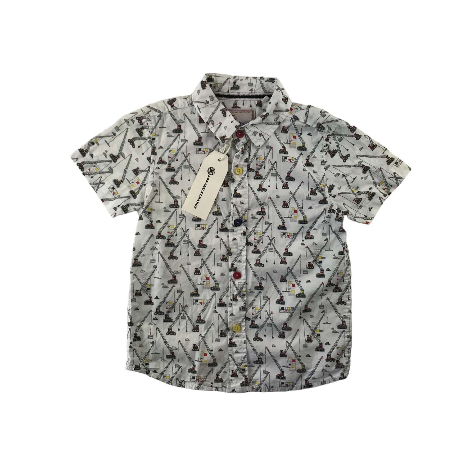 Preloved second hand Tu Shirt Age 4 White Crane Construction Print Short Sleeve Button Up Cotton