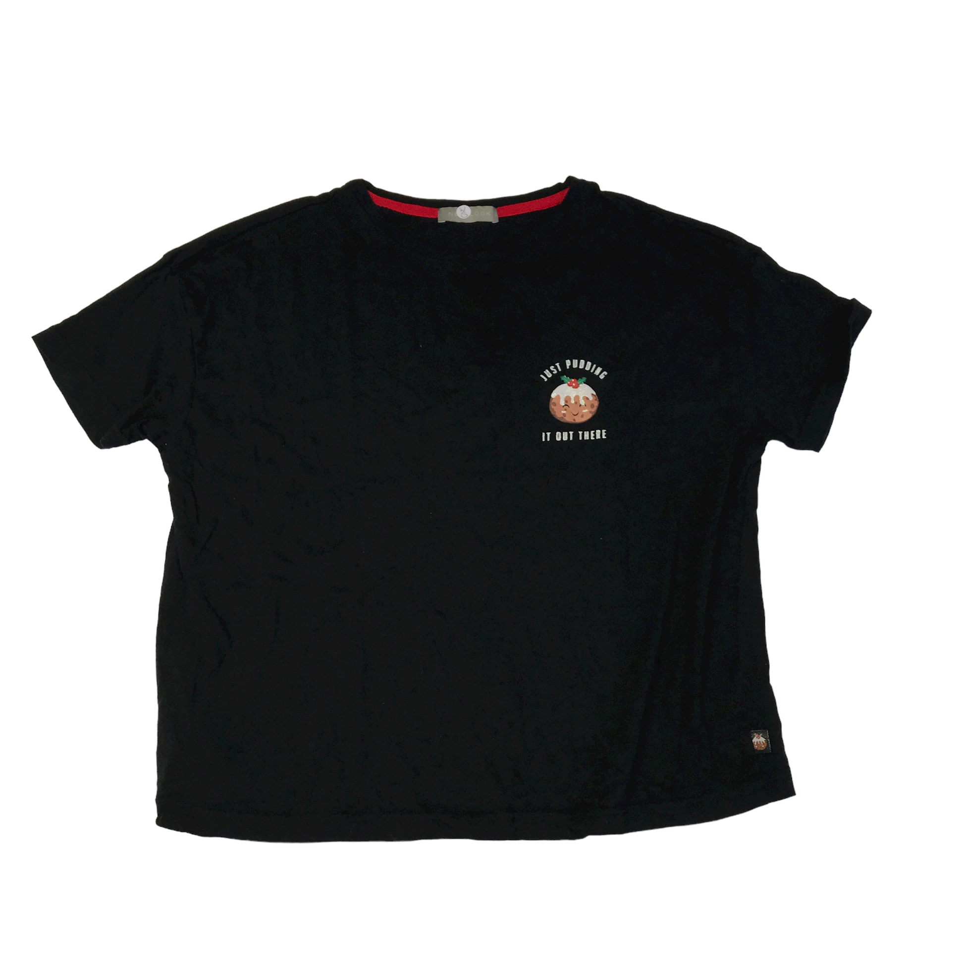 Preloved Second hand New Look Black Pudding Oversized Cropped Christmas T-shirt Size Women's S