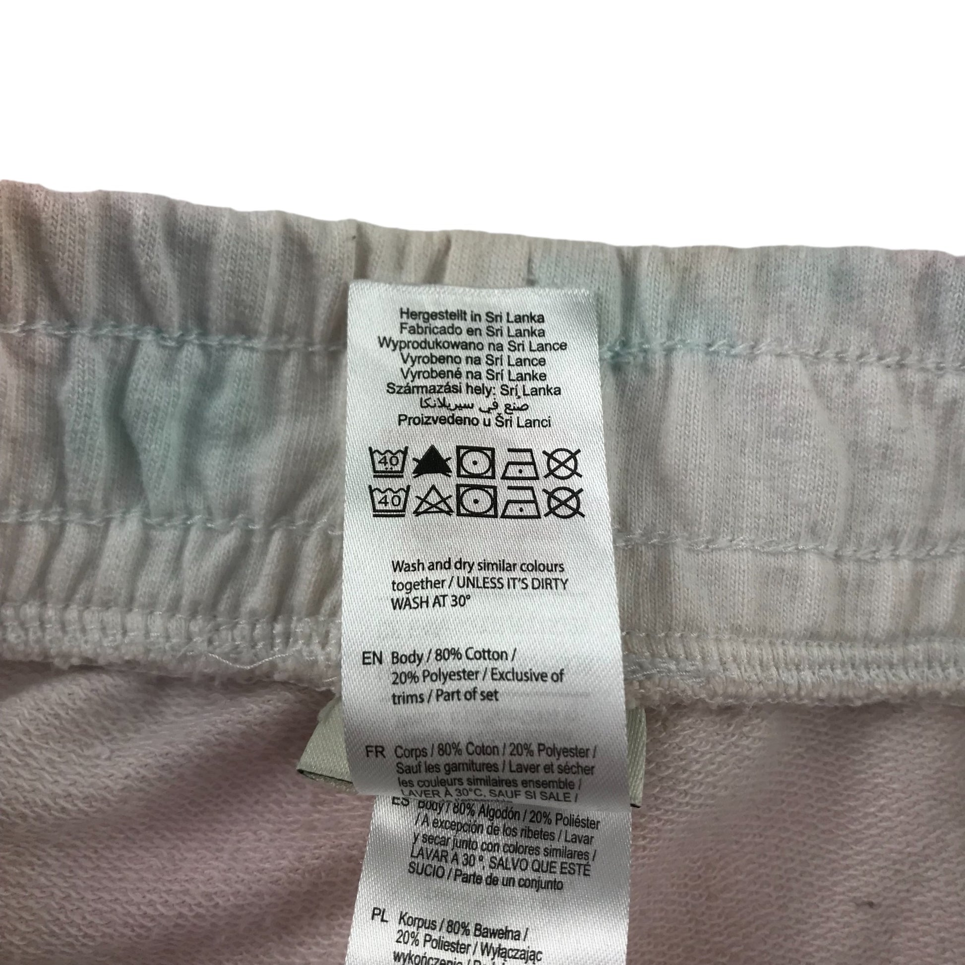 - Description: pull up elasticated waistband with pale pink drawstring and piping along the seam and hems