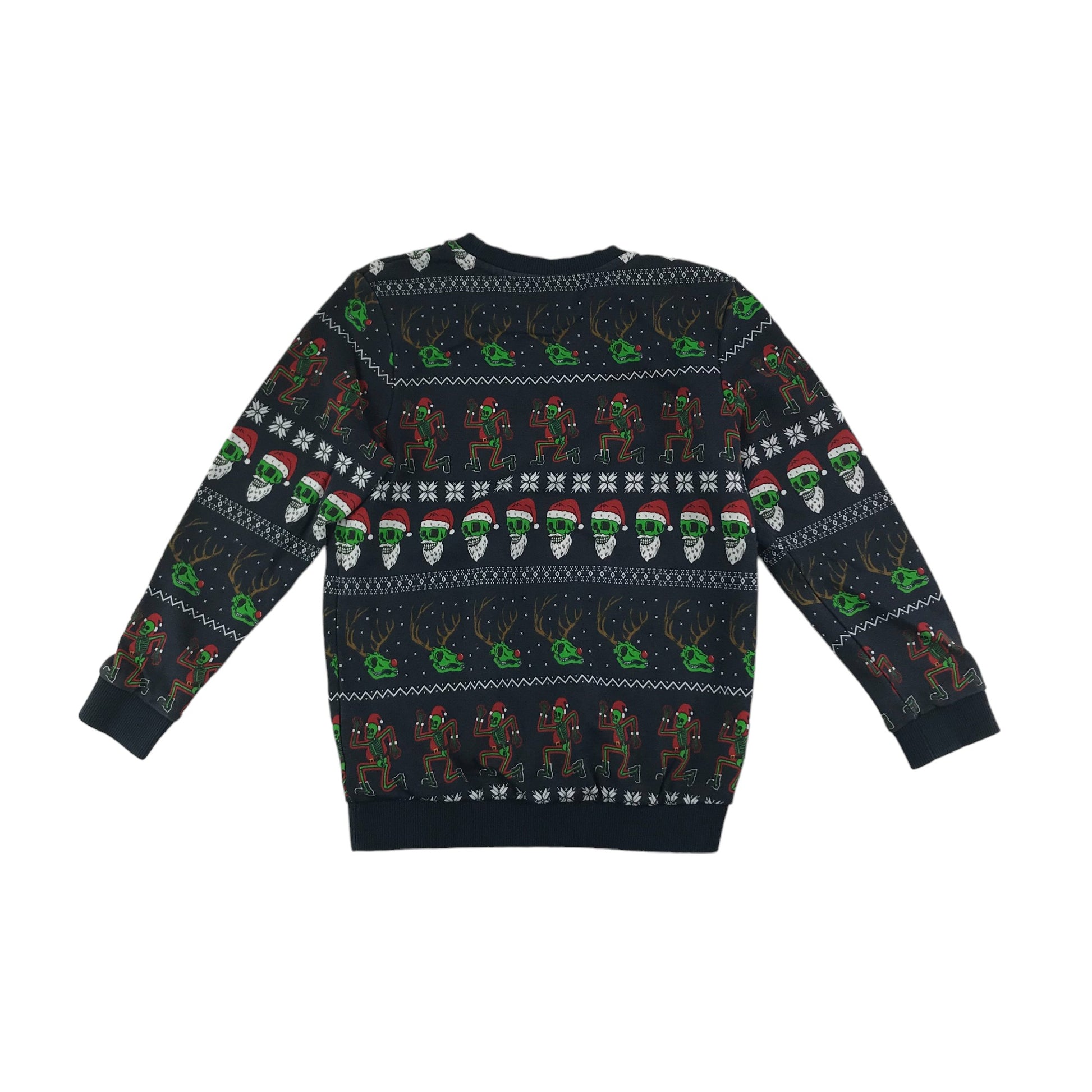 Preloved second hand Tu Christmas Jumper Age 7 Navy Festive Skull and skeleton Santa Reindeer Pattern Jersey Long Sleeve