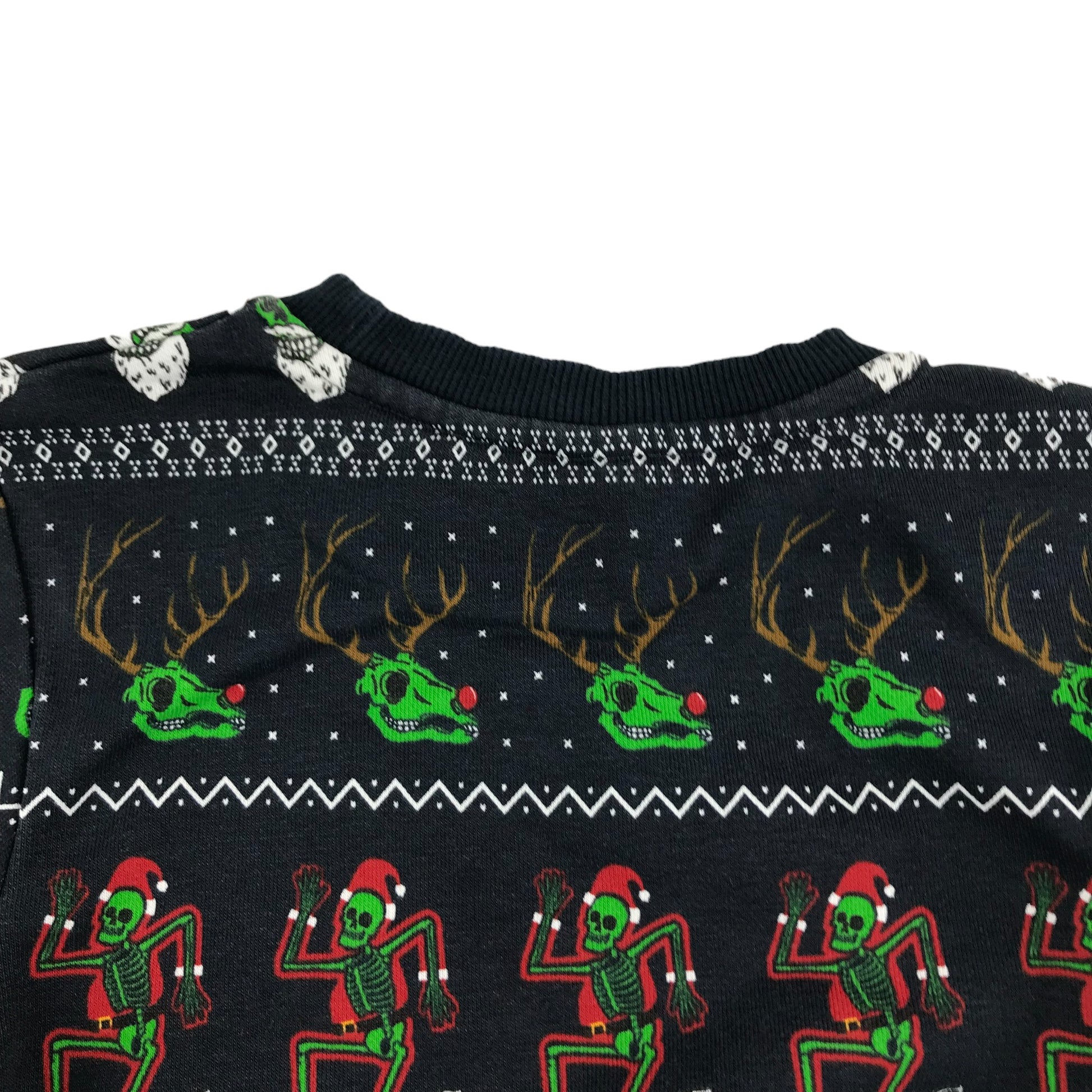 - Description: long sleeve crewneck navy festive jumper with skull Santa and reindeer
