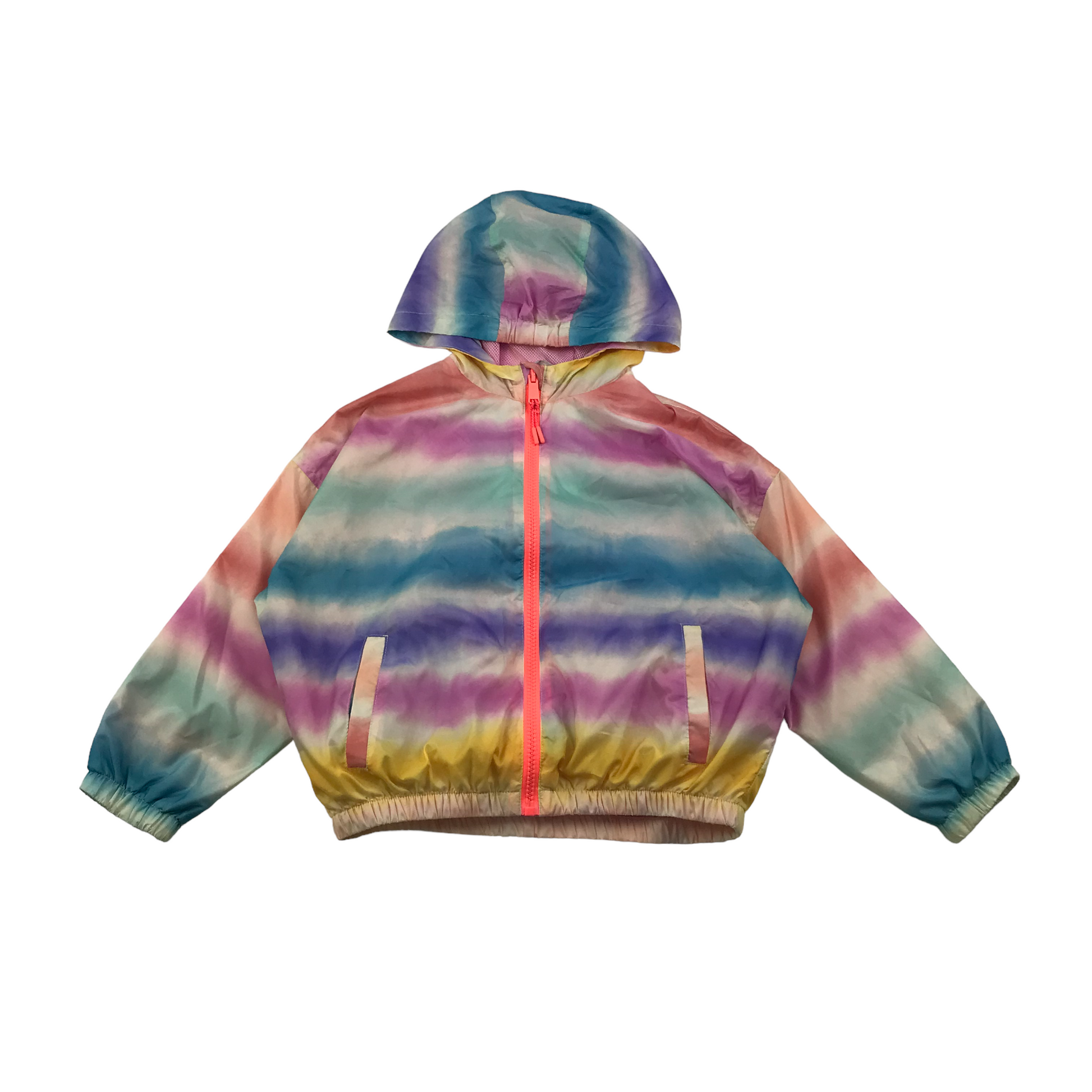 - Description: Light bomber jacket with multicoloured gradient stripe pattern. Cuffed hem and arms, hood, zipper fastening, great for mild summer weather or spring
