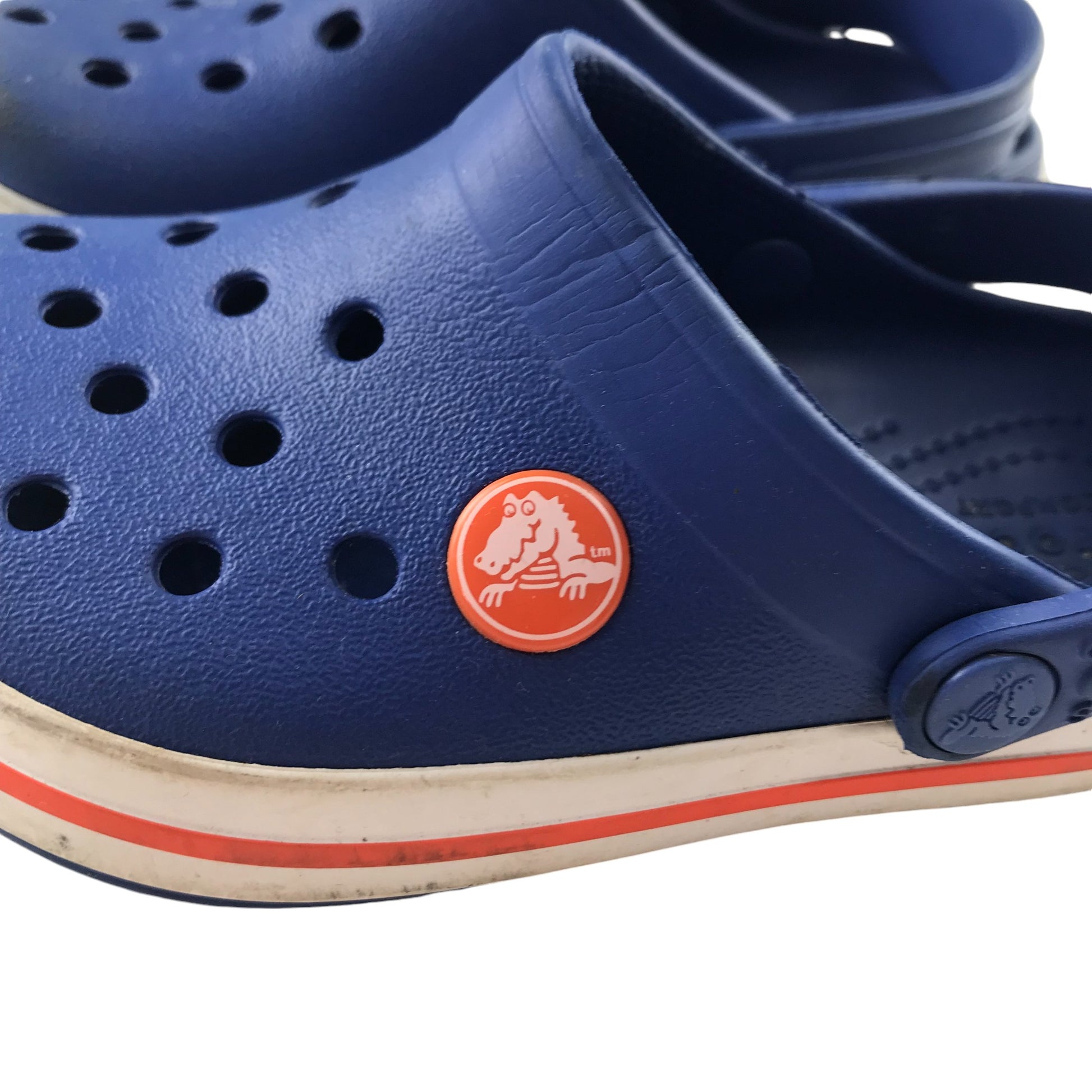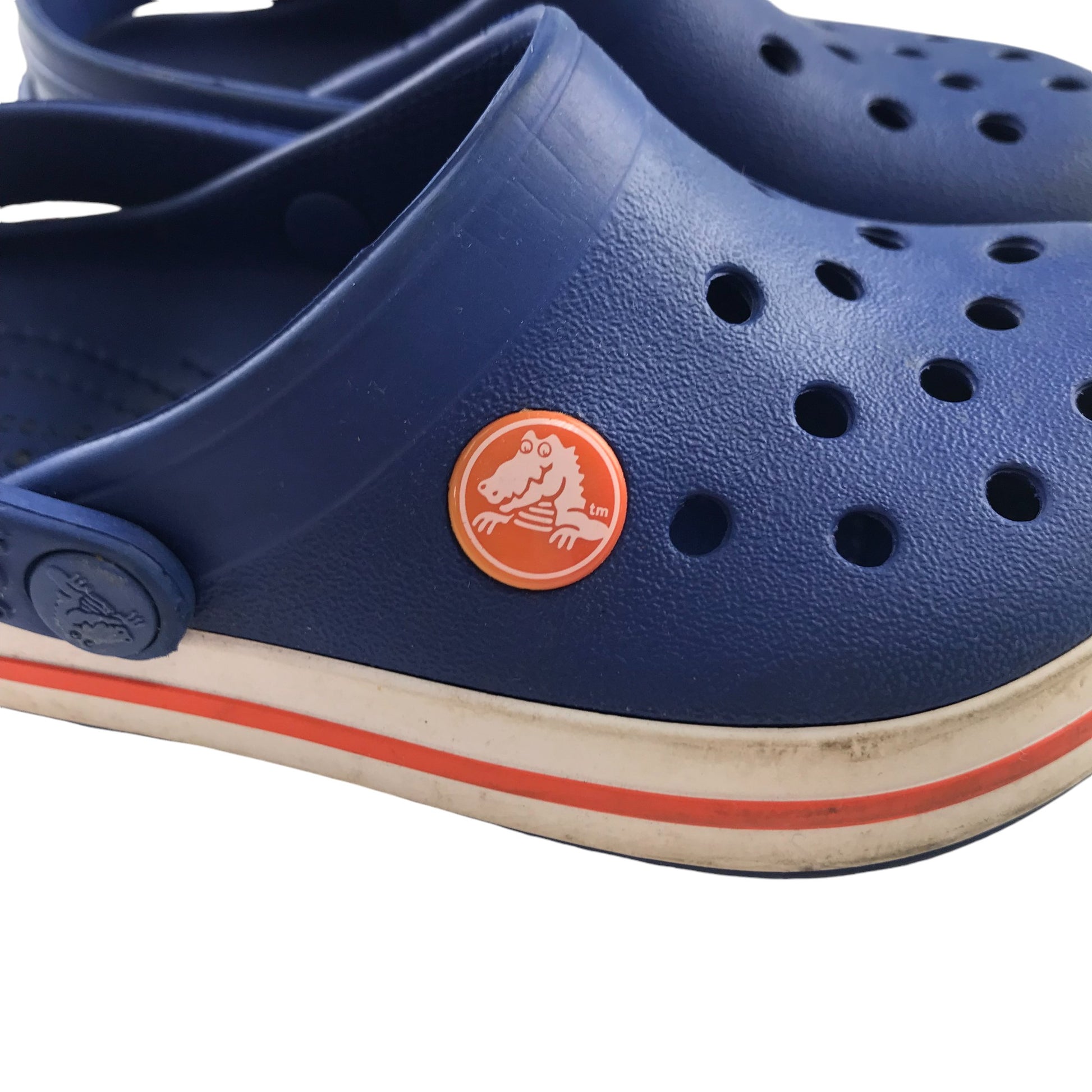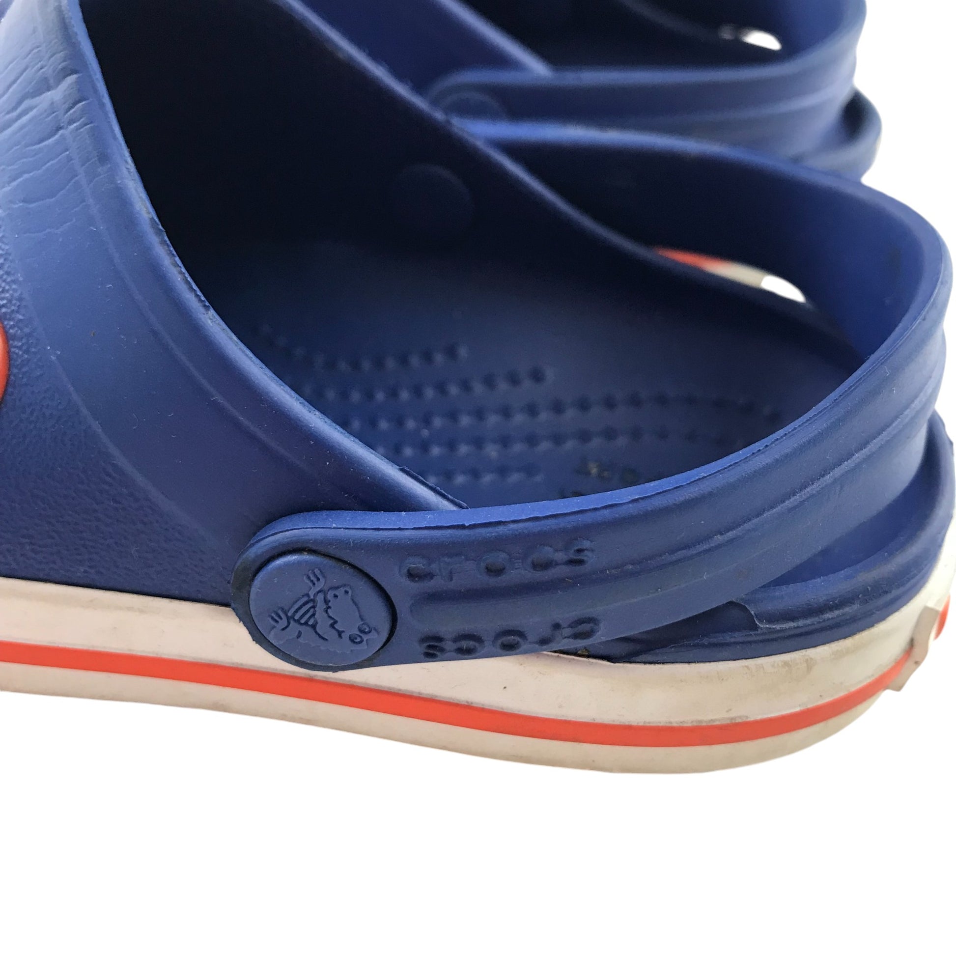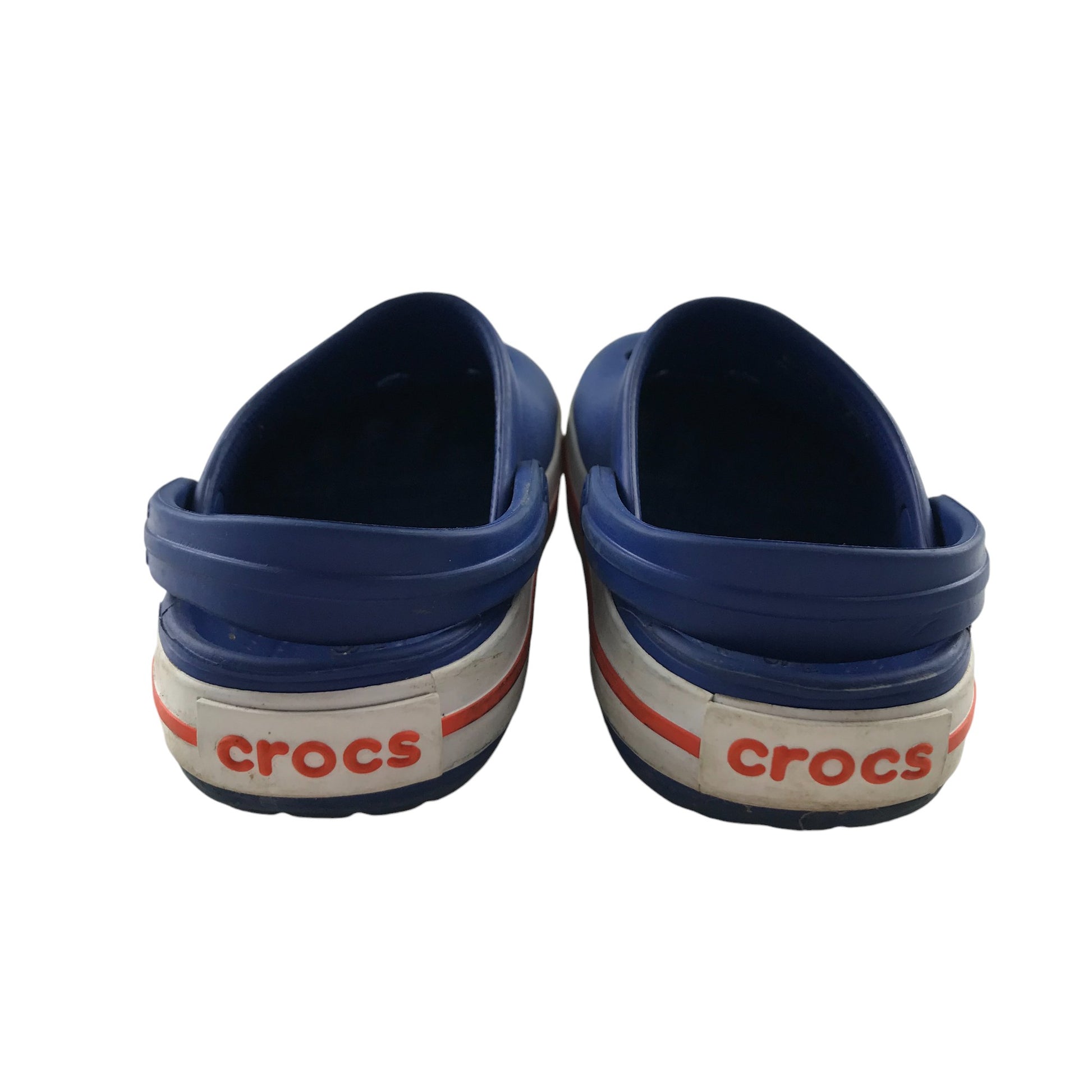 Preloved second hand Crocs Shoe Size 9 Junior Blue with Logo and White and Red Trim Detailing