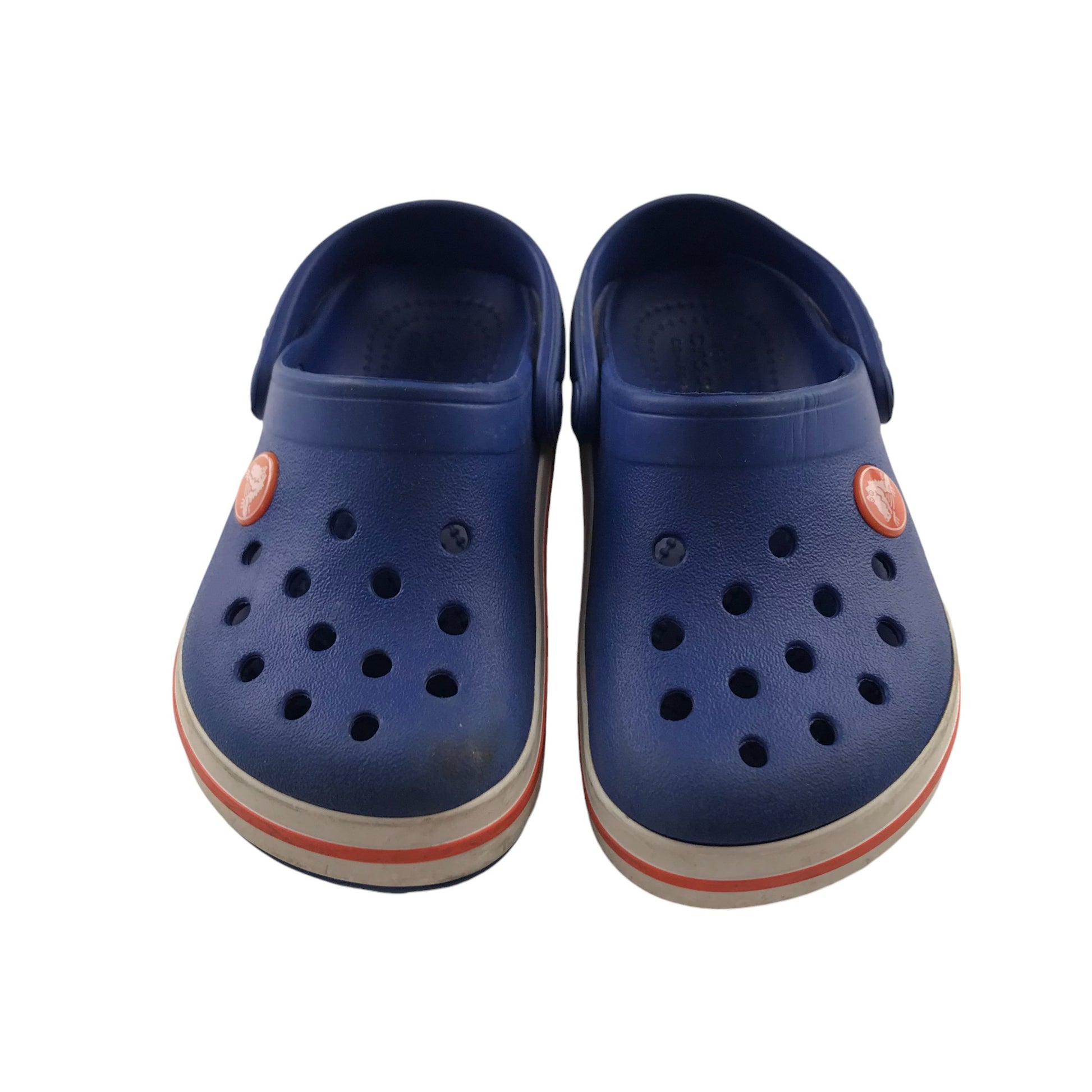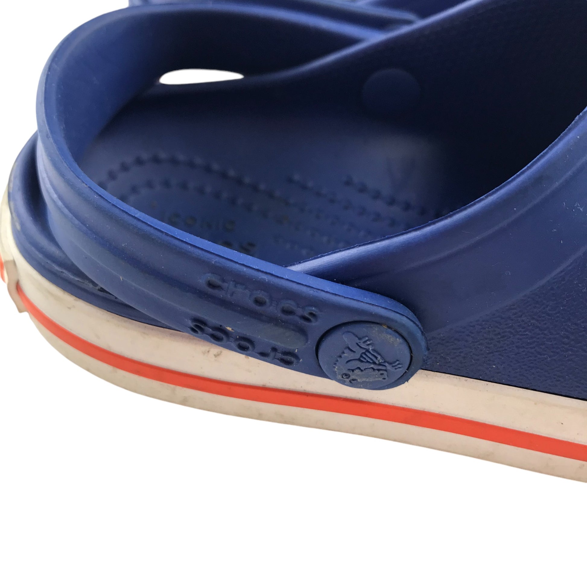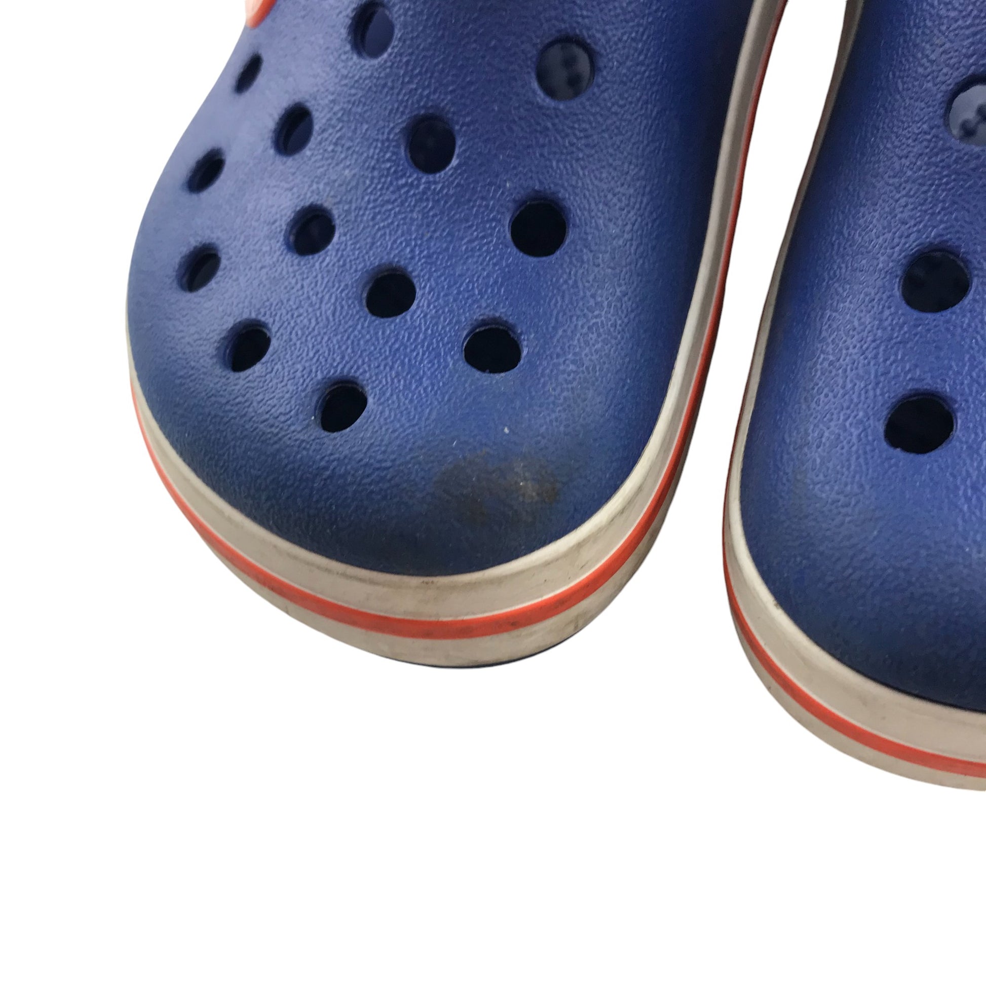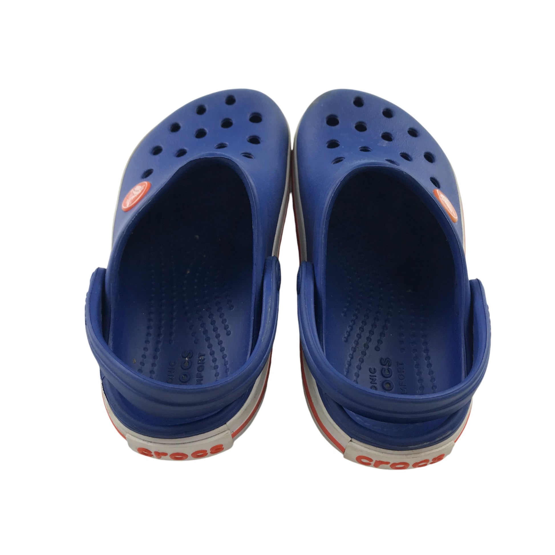 Preloved second hand Crocs Shoe Size 9 Junior Blue with Logo and White and Red Trim Detailing