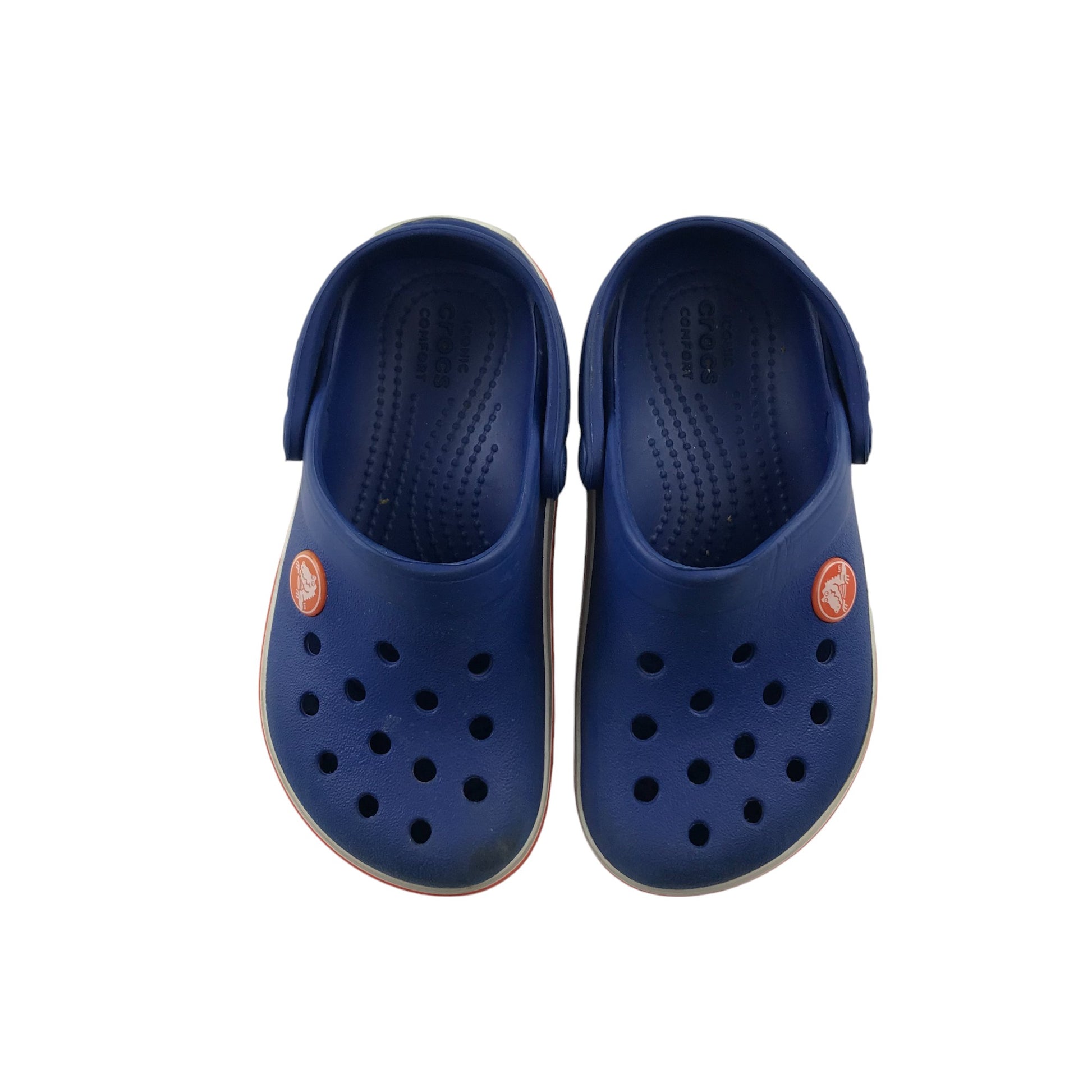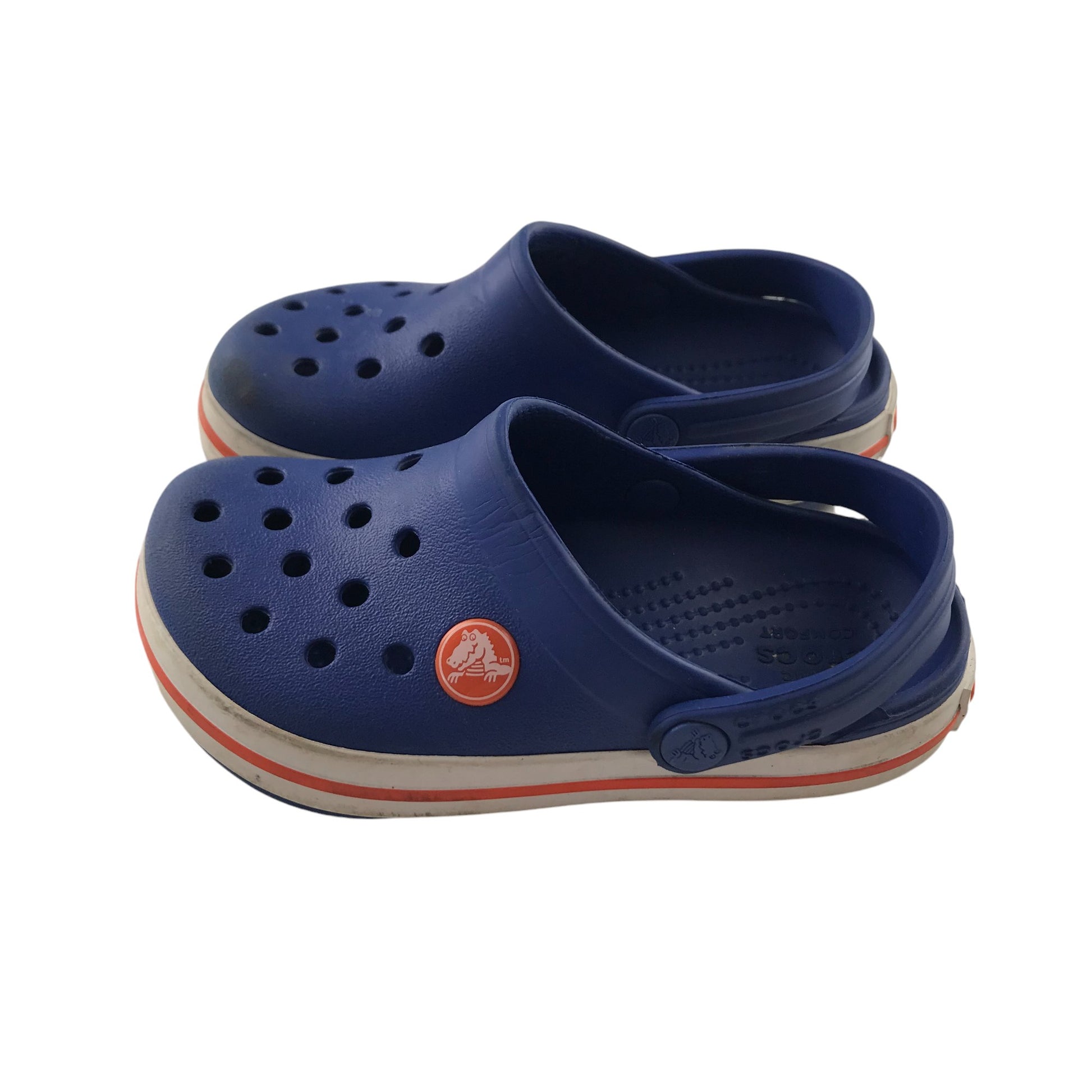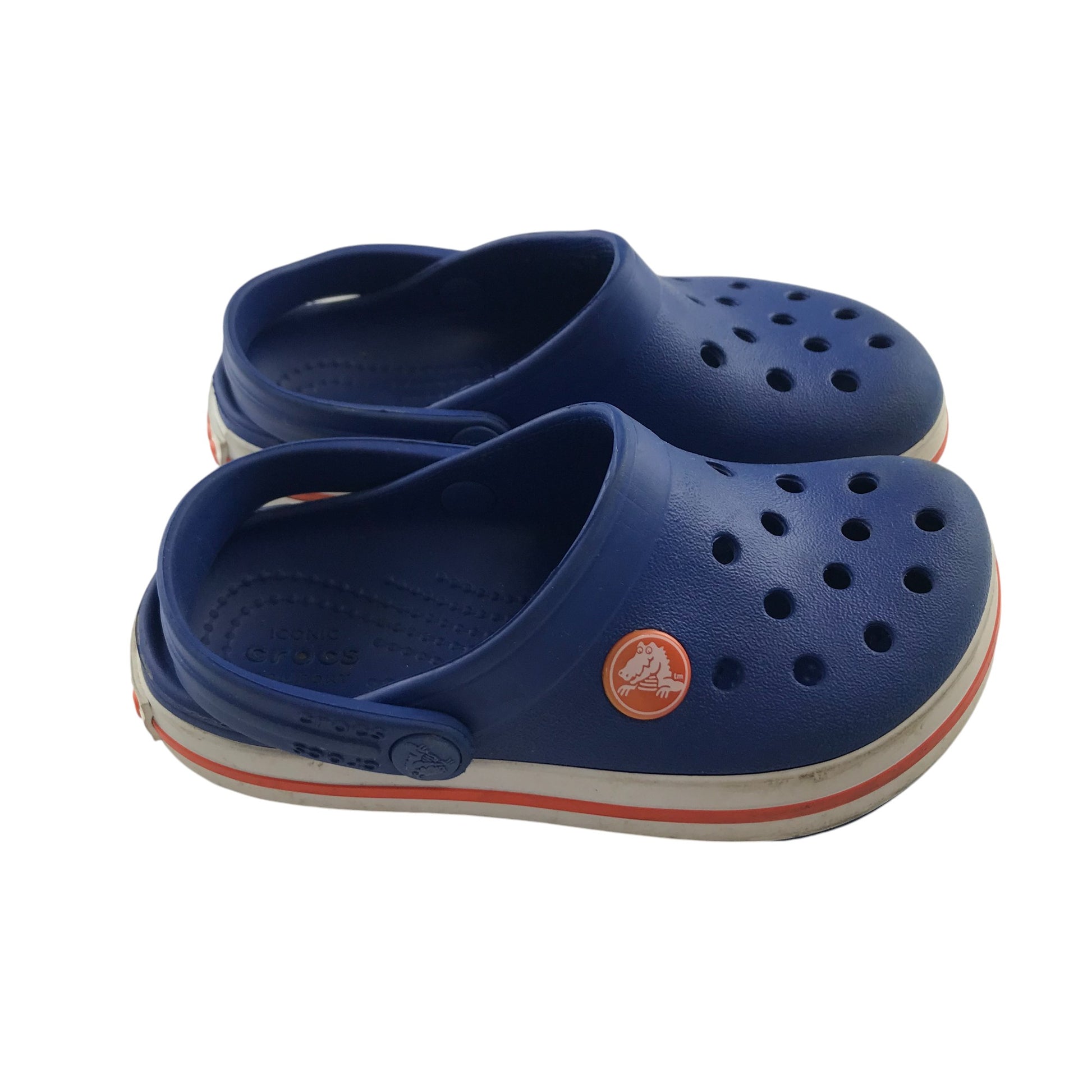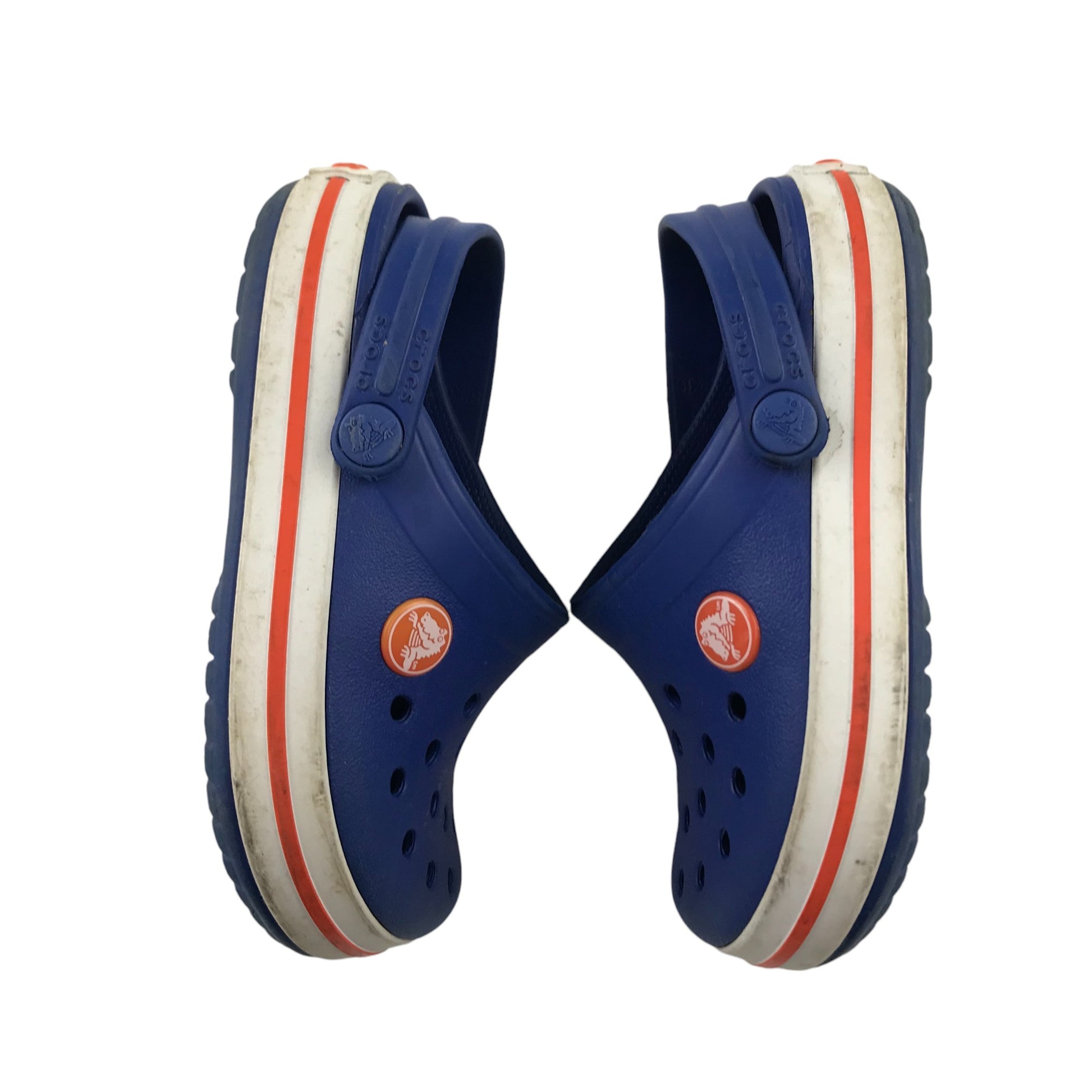 Preloved second hand Crocs Shoe Size 9 Junior Blue with Logo and White and Red Trim Detailing