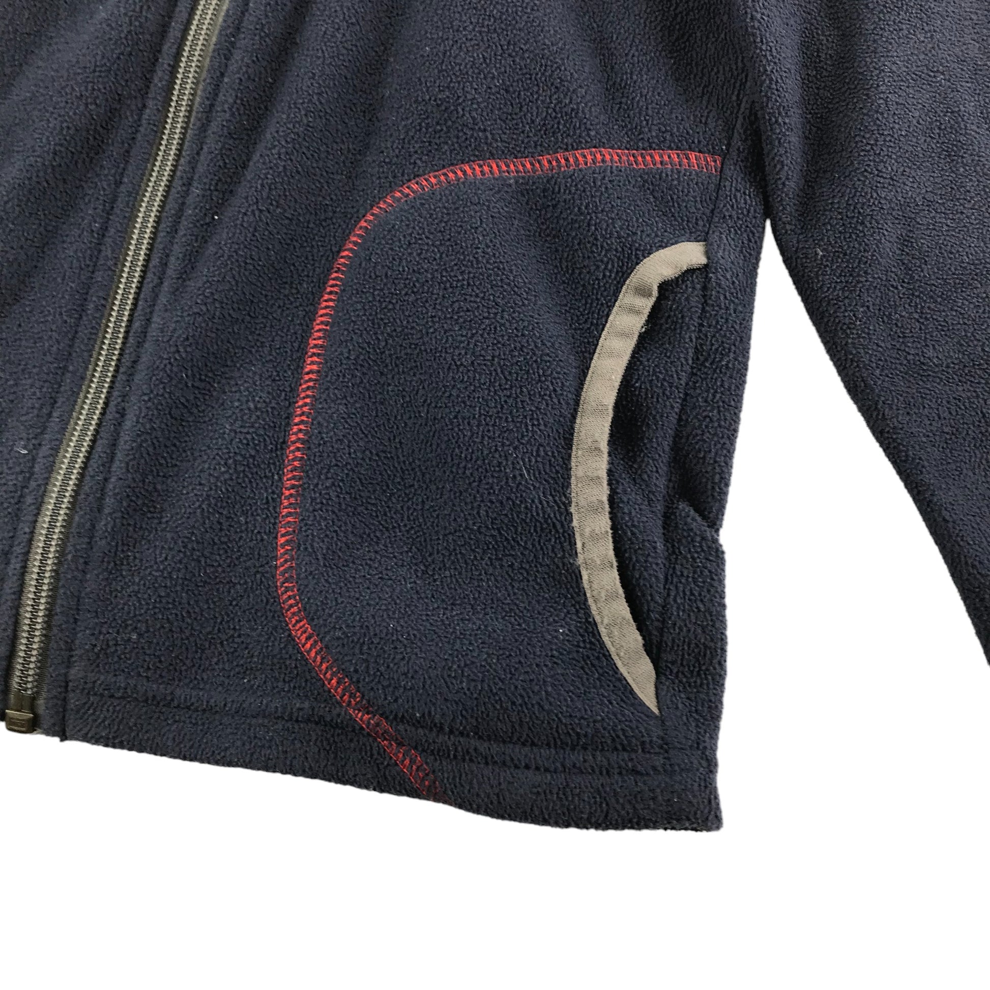 - Description: Long sleeve full zipper fleece with navy blue base and red seam detailing. Pockets