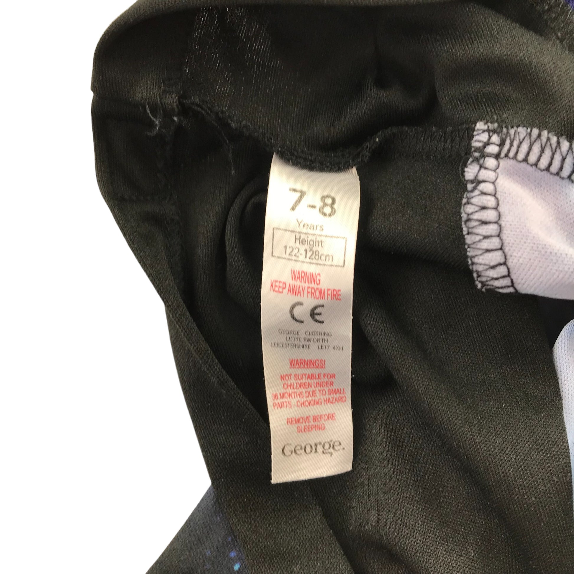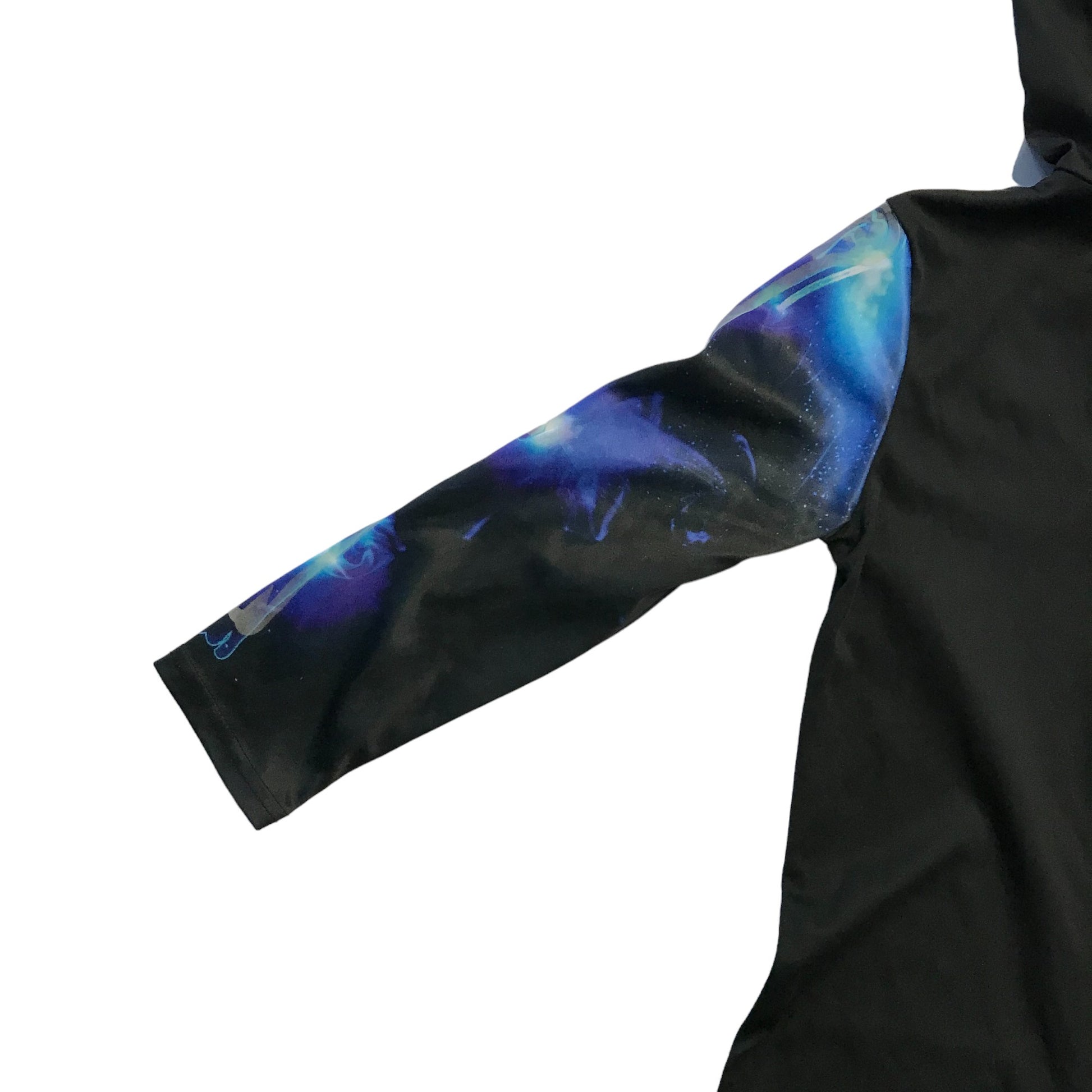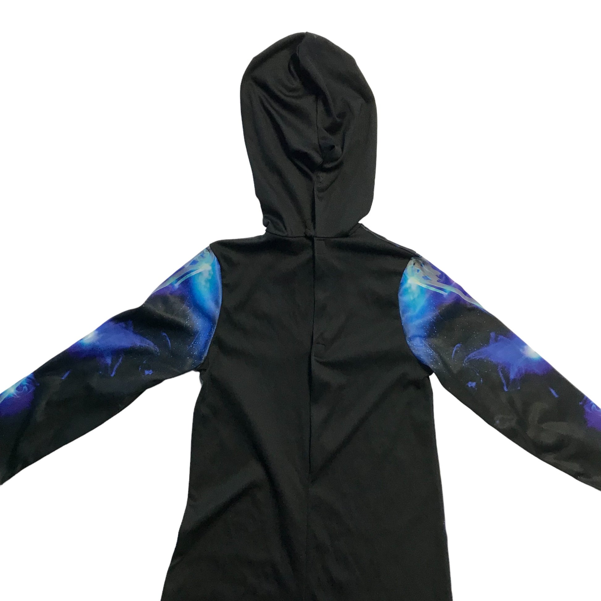 • Description: onesie with hood and loop and hoop straps back, neon blue light effect print