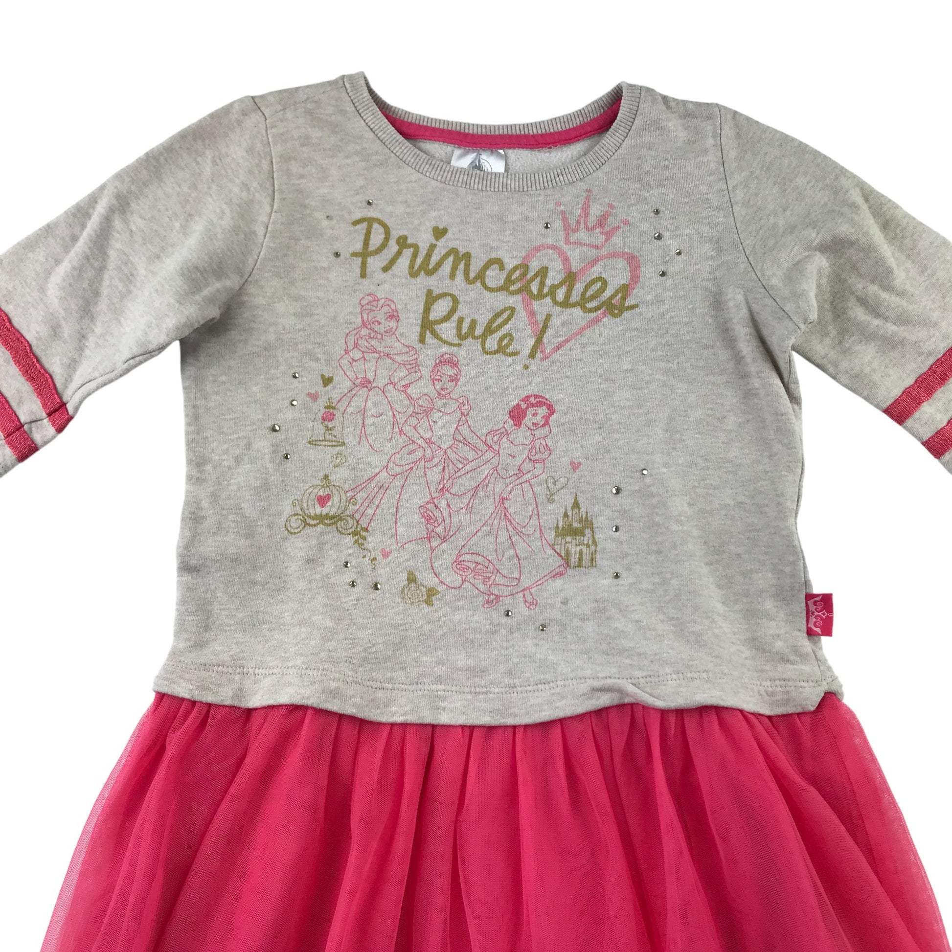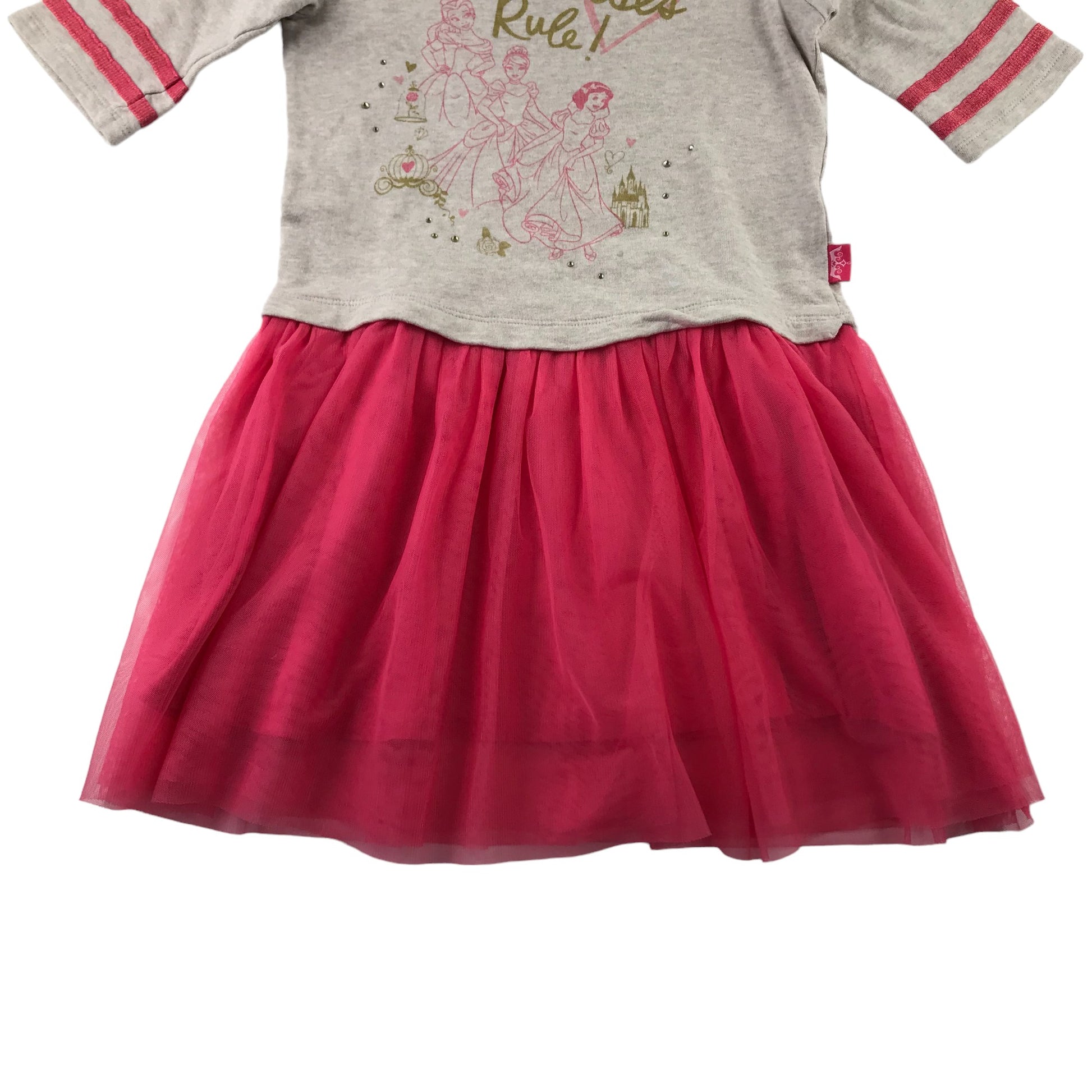 - Description: casual short sleeve t-shirt dress with grey top and Disney princesses print in sparkles, fuchsia pink flared mesh tulle layered skirt