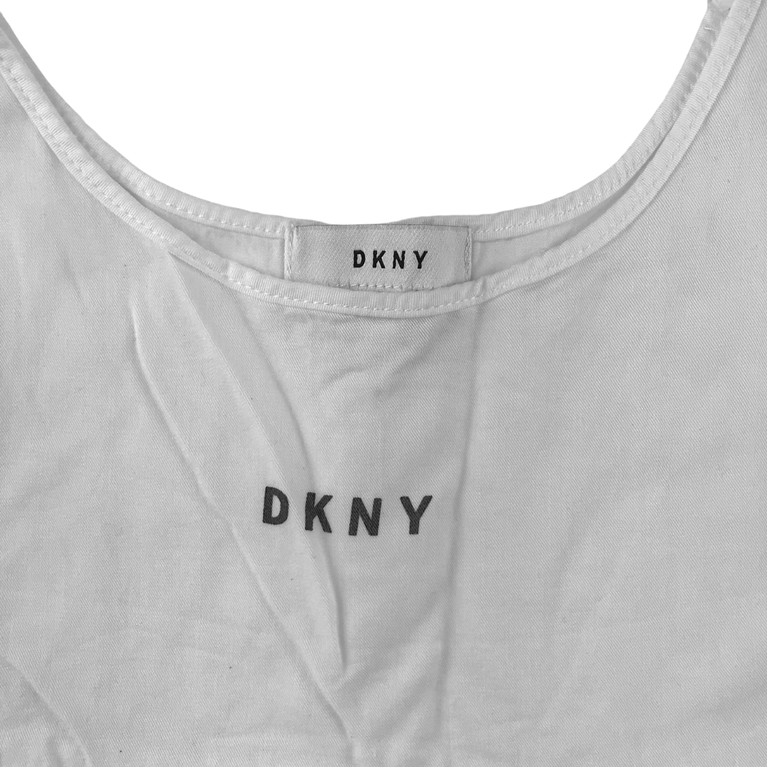 - Description: sleeveless summery top with slightly cropped body, flared hem, DKNY logo