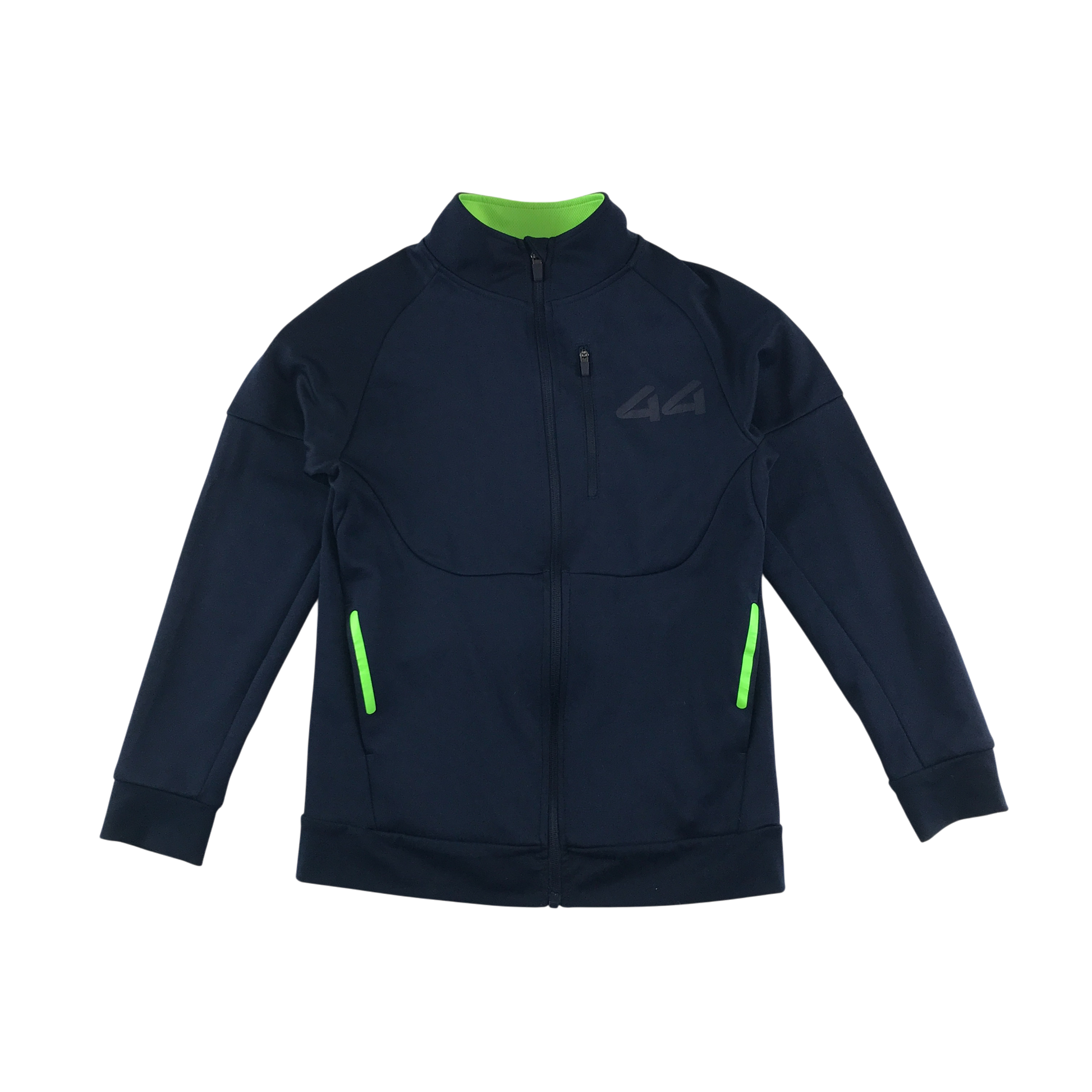 - Clothing features: full zipper fleece, long sleeve, neon green pockets