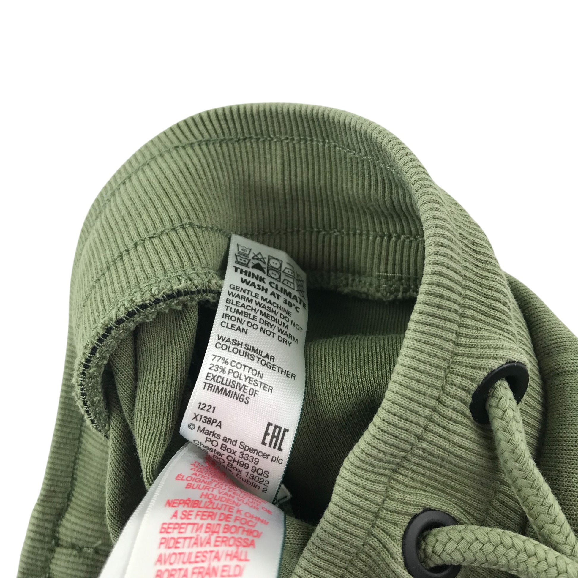 - Clothing features: elasticated waist with draw strings and pockets