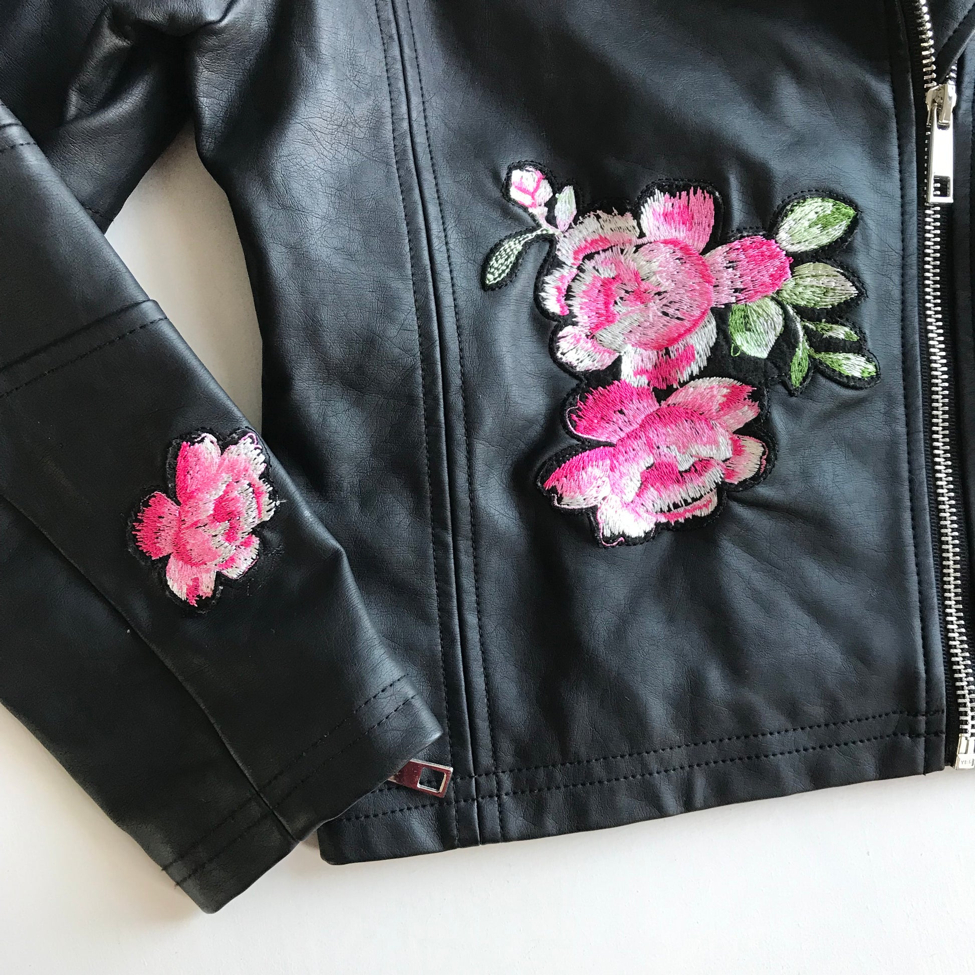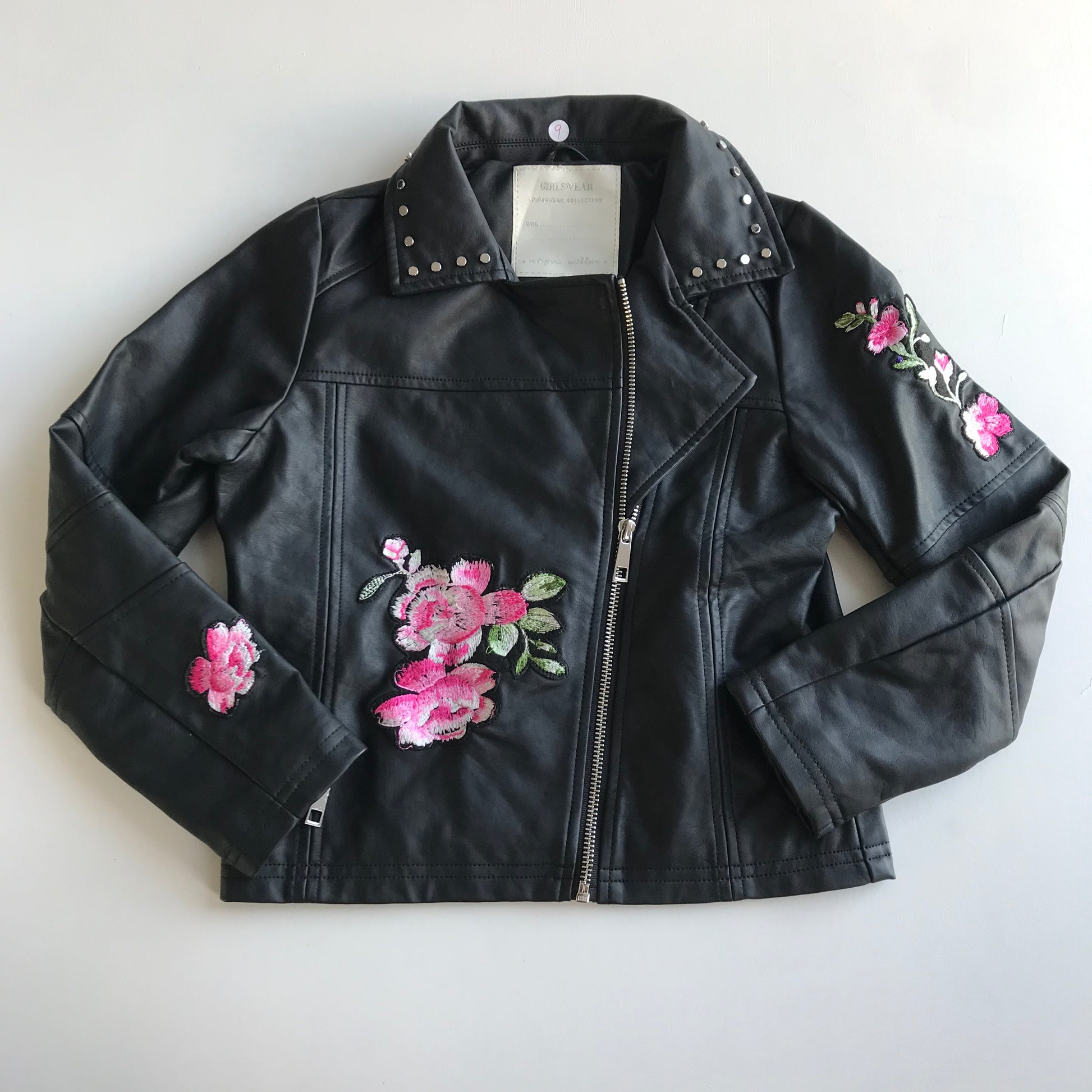Preloved Second hand Girlswear faux leather jacket in black with pink rose embroidery details. Super cool!