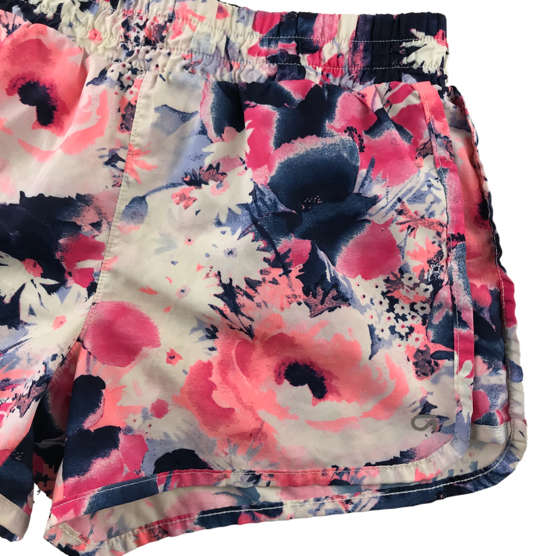 - Description: Pink sports shorts with elasticated waist with floral design