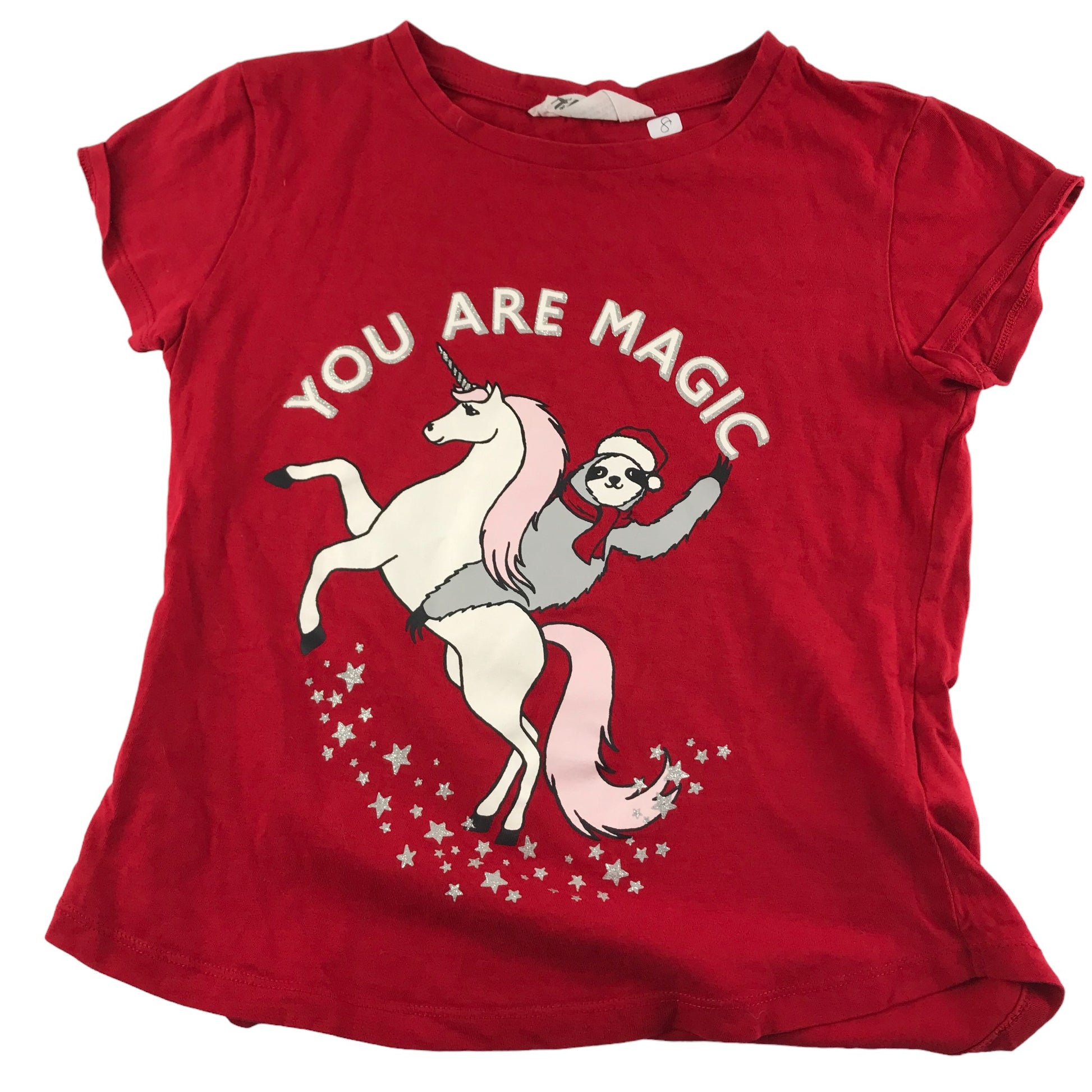 H&M Christmas T-shirt Age 8 Red Short Sleeve Unicorn Sloth