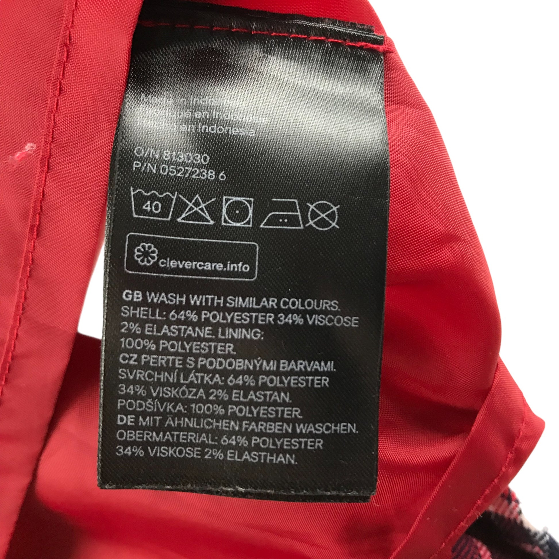 - Materials: shell 64% polyester, 34% viscose, 2% elastane, lining 100% polyester