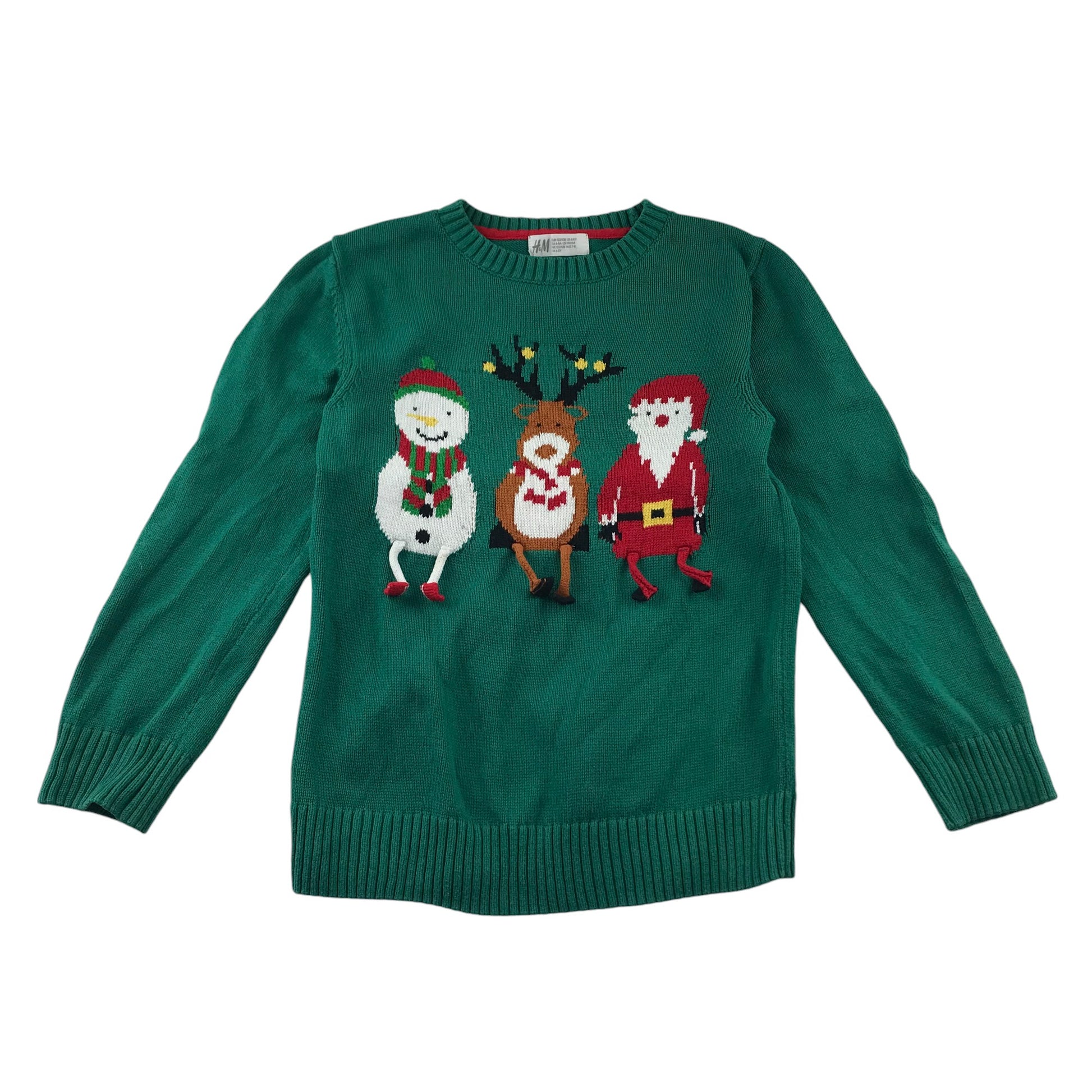H&M Festive Jumper 7-8 Years Green Snowman Reindeer and Santa Graphic Cotton