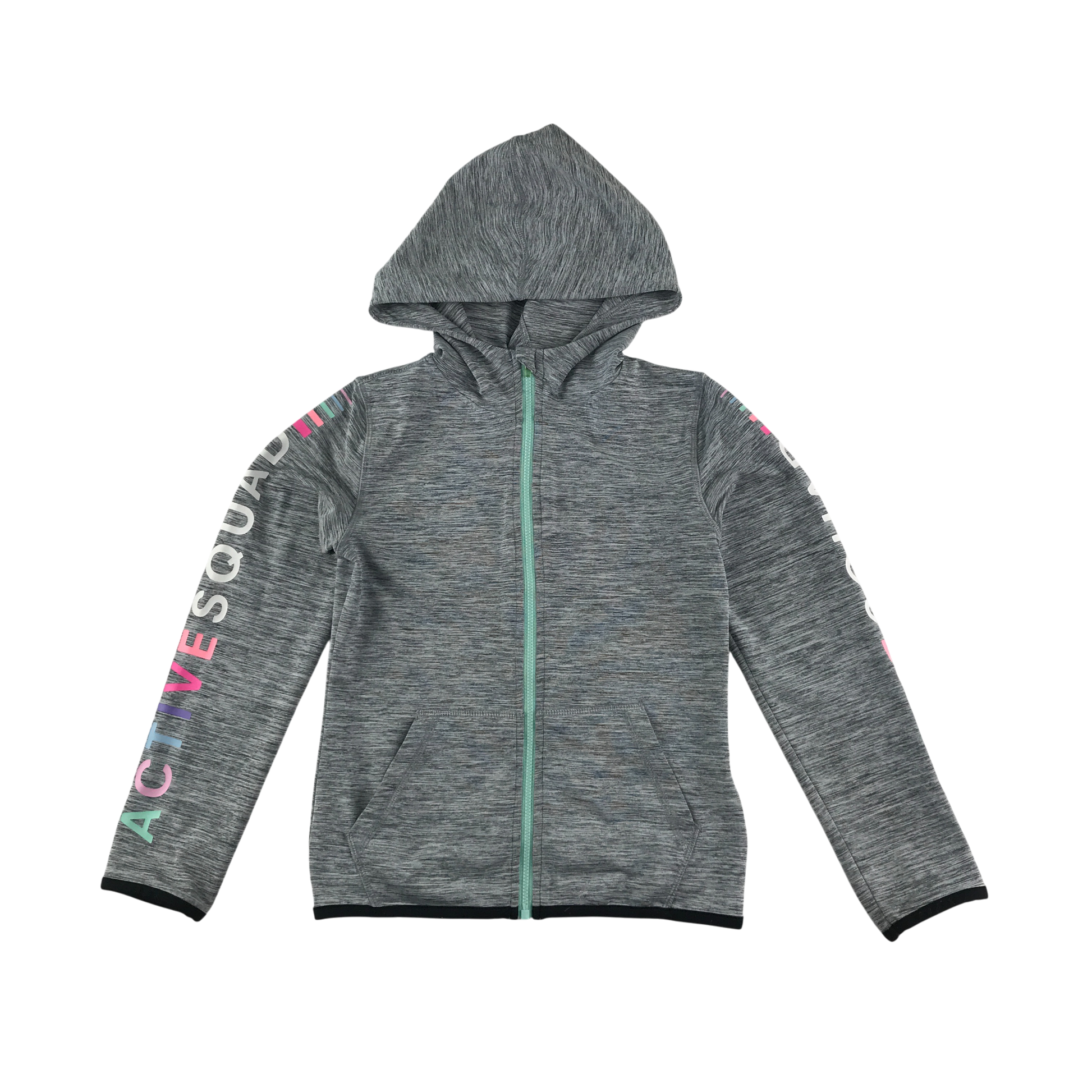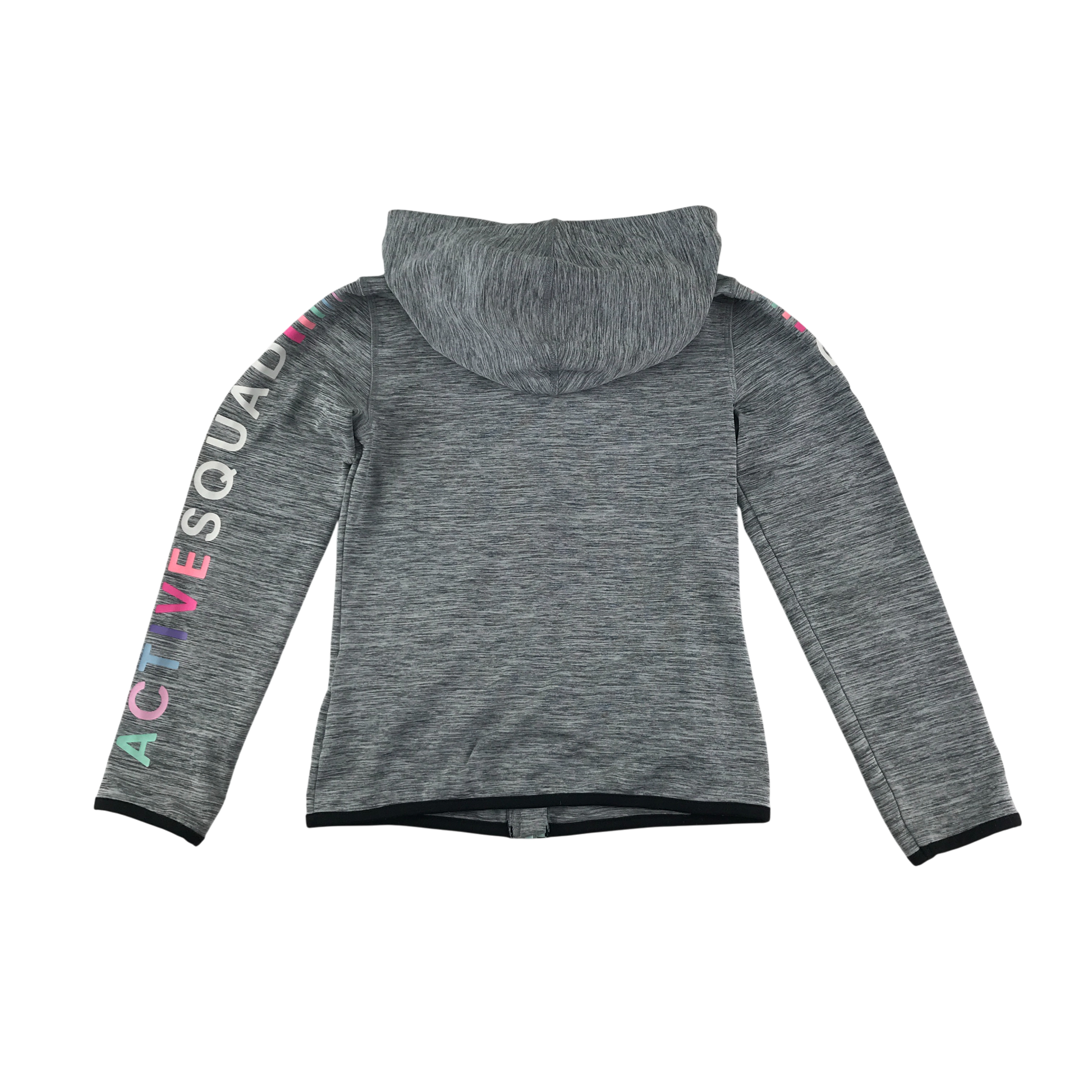 - Clothing features: full zipper jacket, long sleeve, hooded, colourful text on sleeves