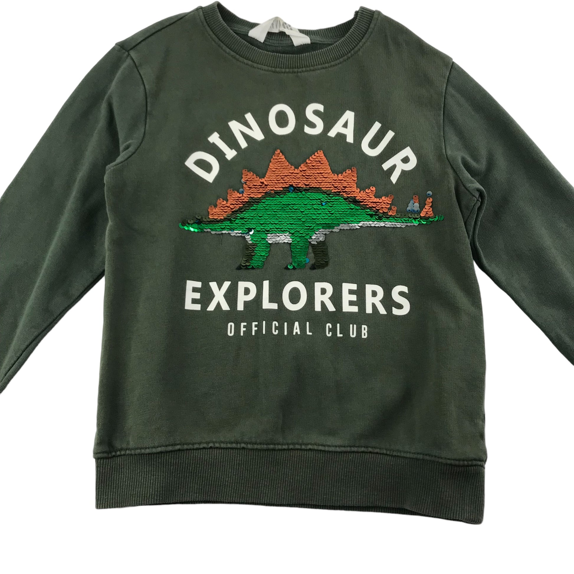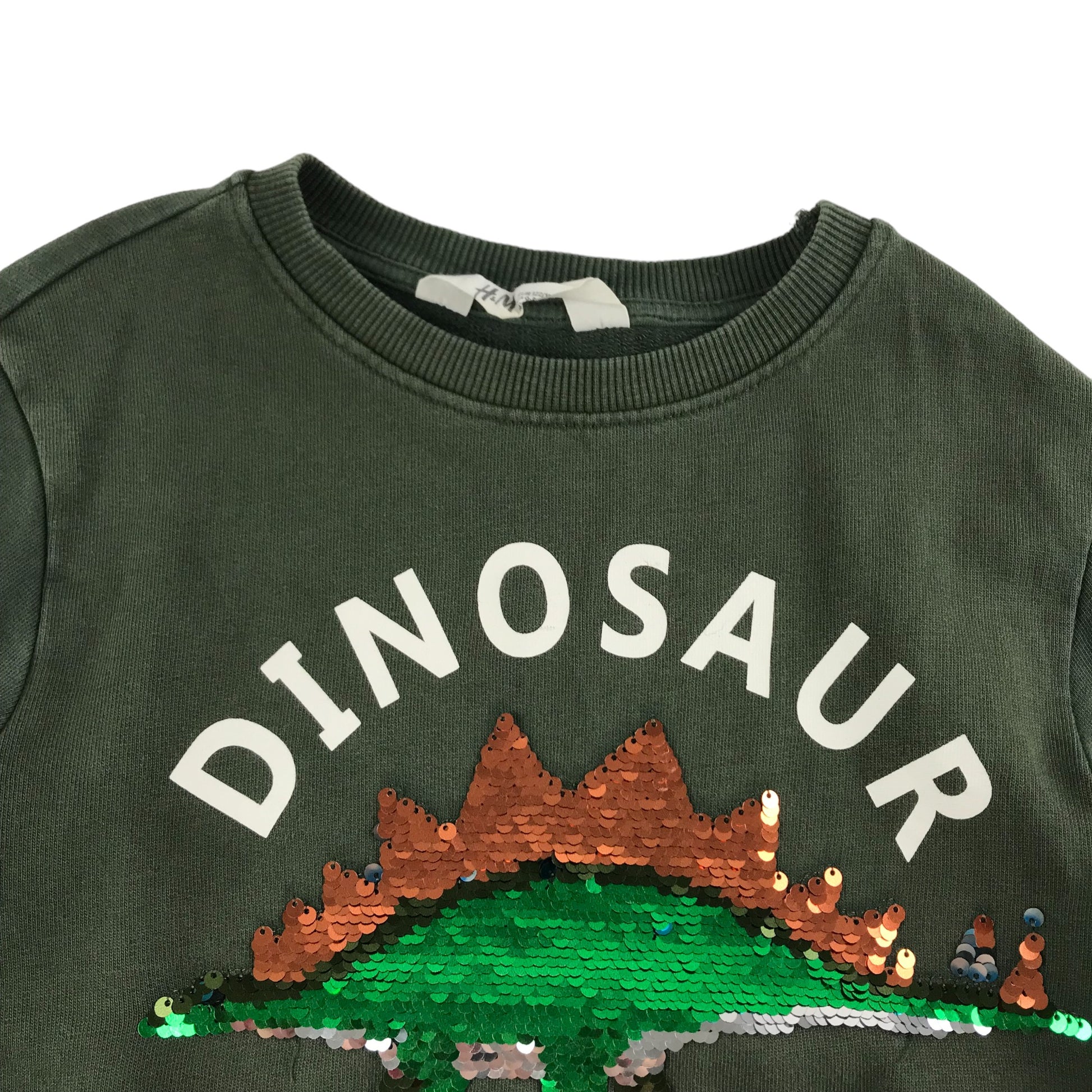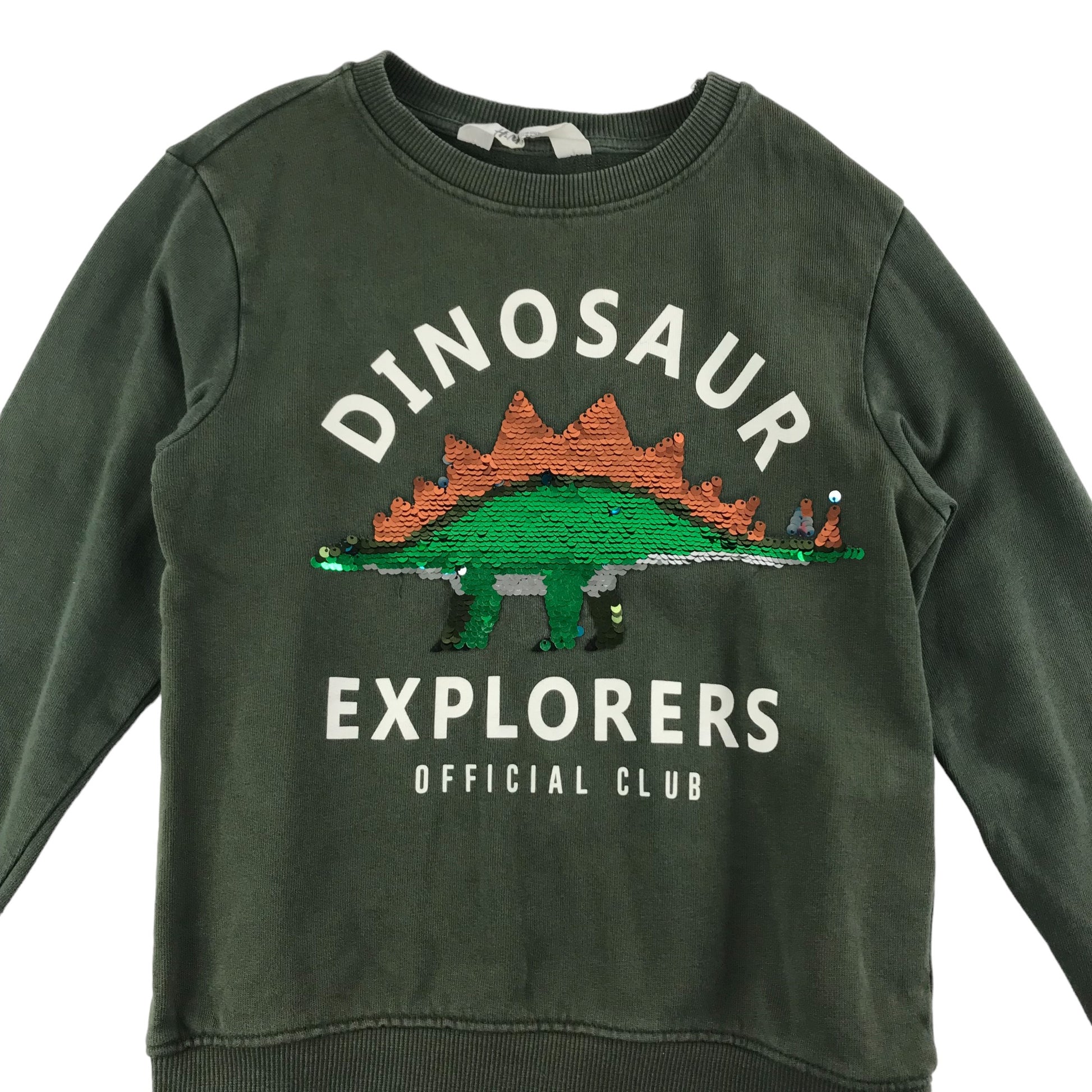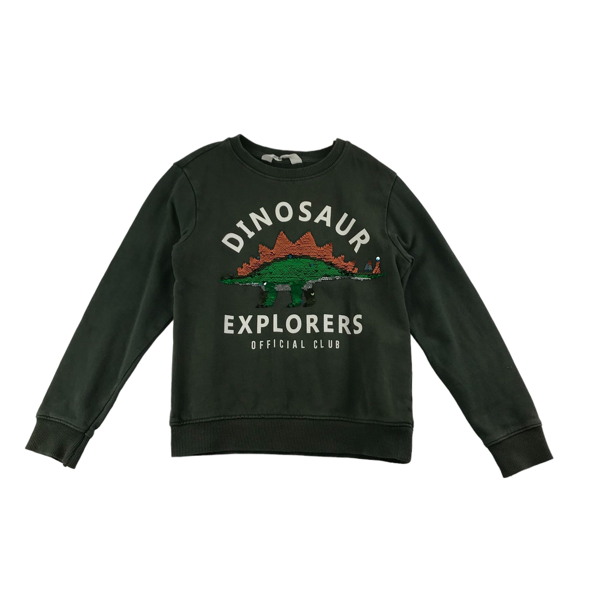 H&M Sweater Age 7 Khaki Green Sequin Dinosaur Jersey Cotton