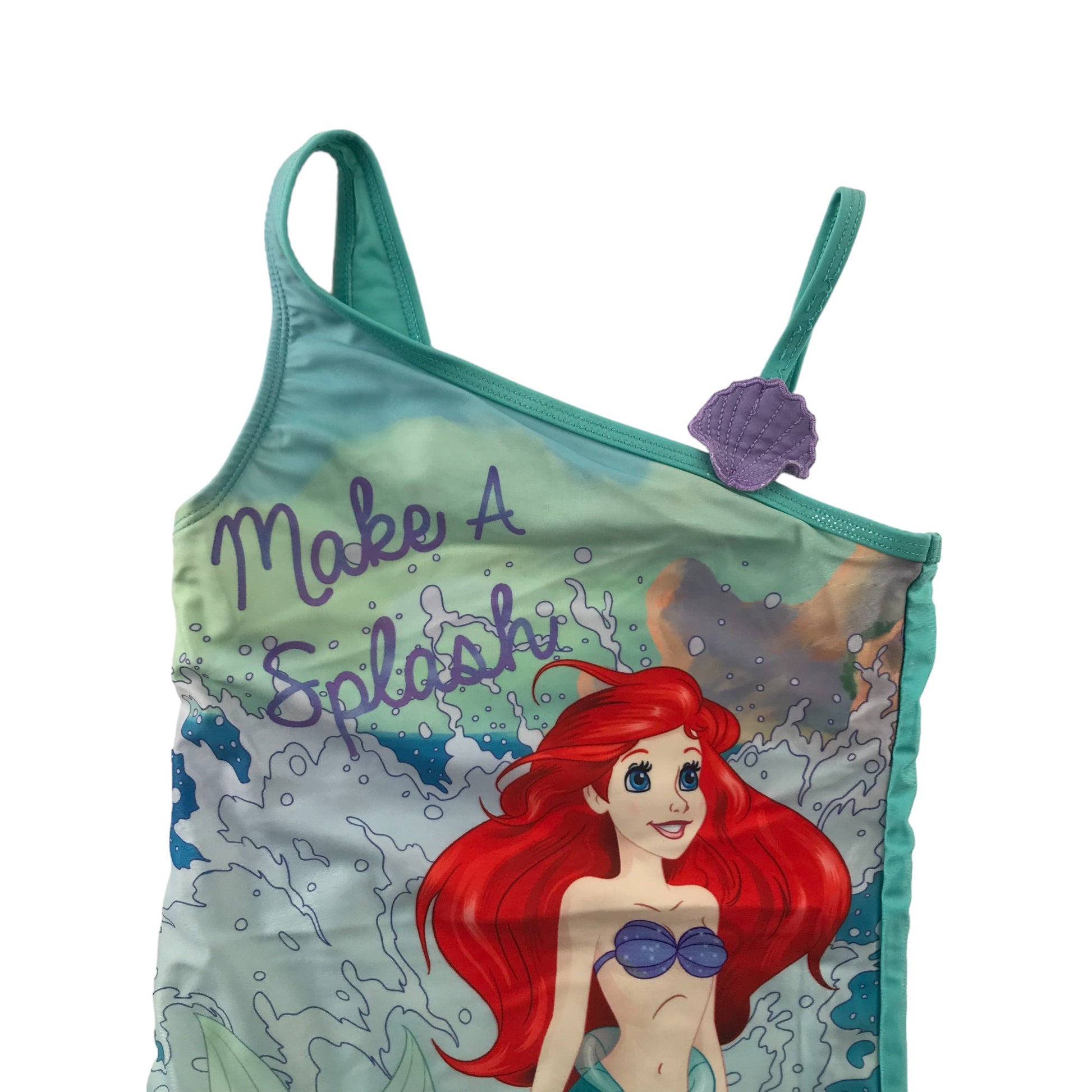- Description: sleeveless one piece swim costume, seashell shoulder strap detail, uneven neckline, Make a Splash print text and Ariel print graphic, frilled detailing on hem