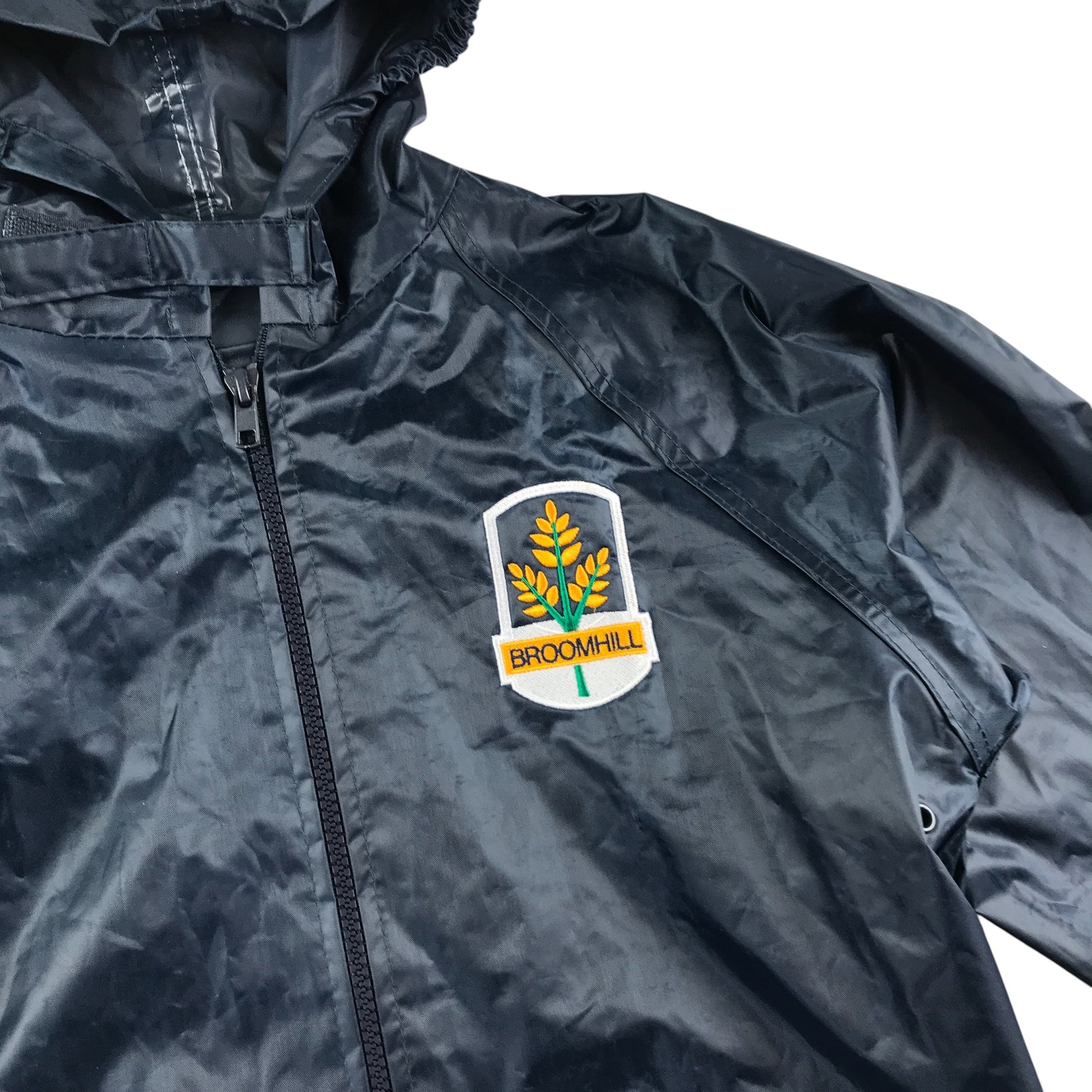 - Description: non lined school jacket with polyester light hood likely showerproof zipper fastening school badge