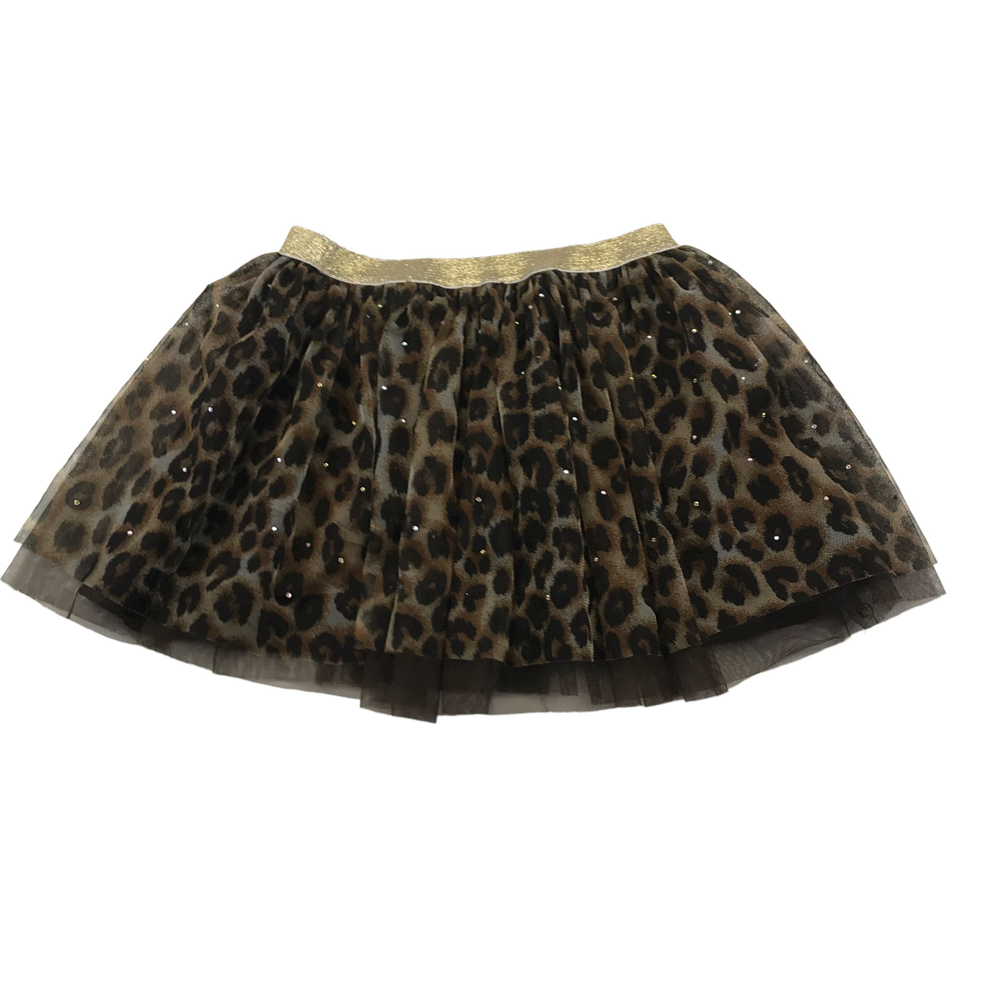 100% polyester, skirt with undershorts. Animal pattern and glittery elasticated waistband