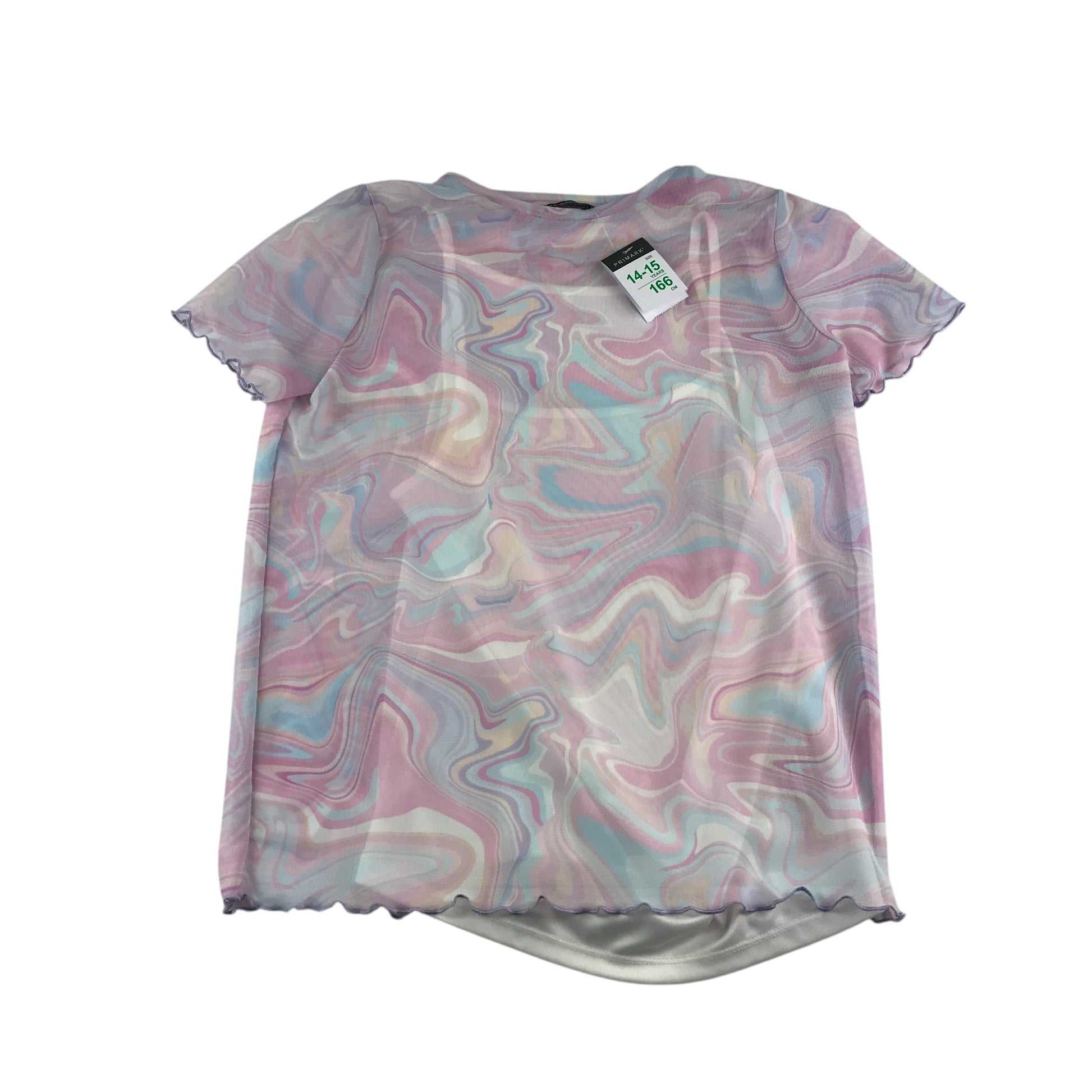 Preloved second hand Primark blouse 14-15 years pink swirly mesh over top with white vest under layer