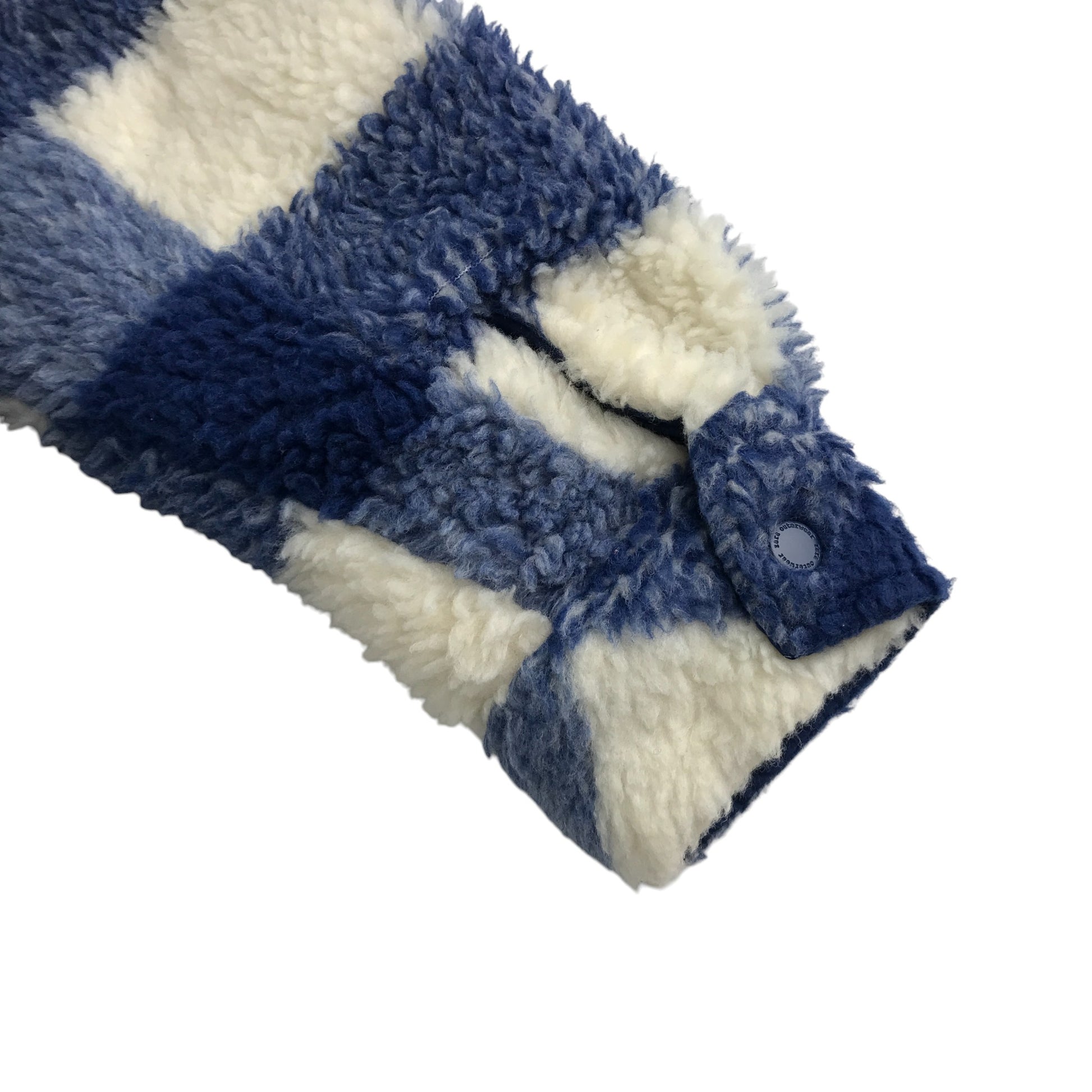 - Clothing features: Blue and white long sleeve shirt coast fuzzy faux fur with pockets and collar