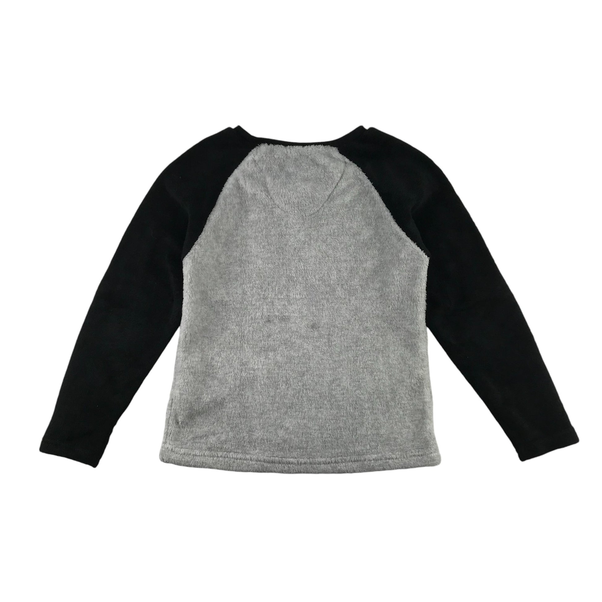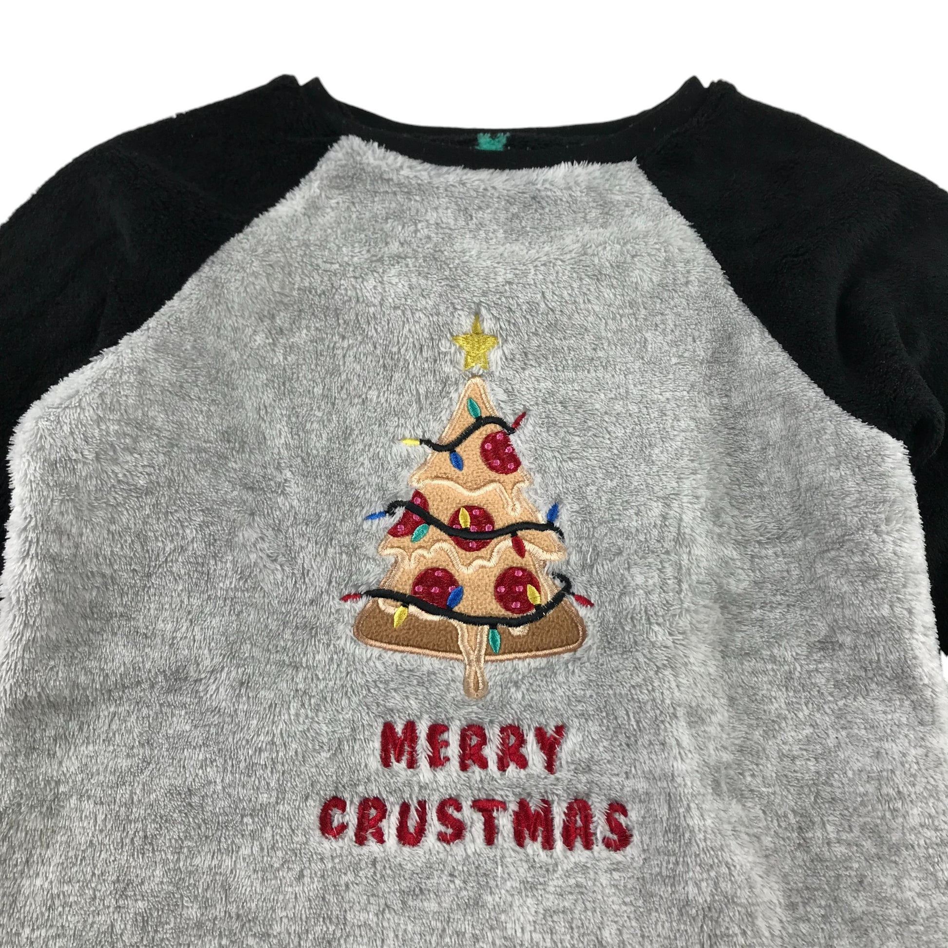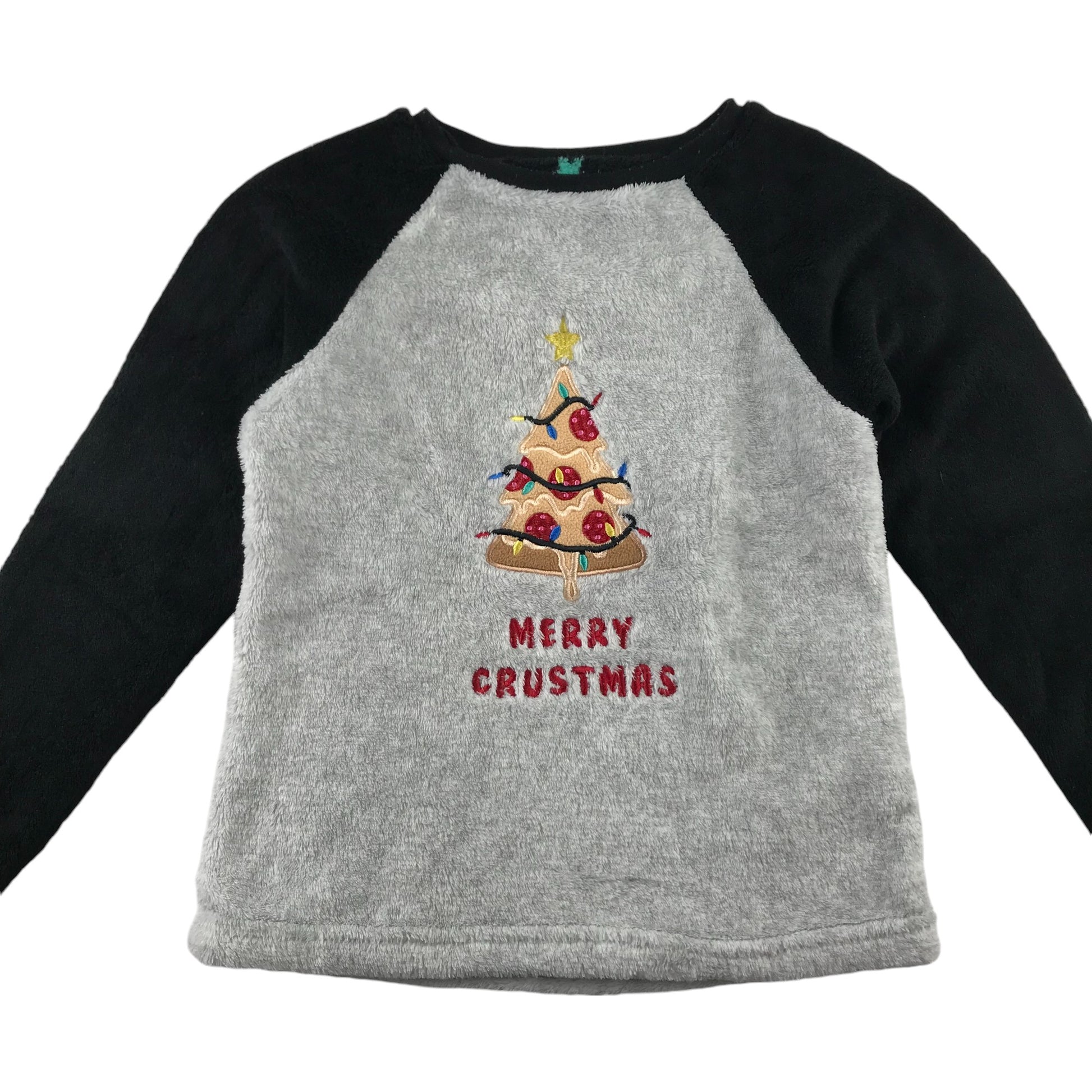 Primark Festive Jumper 7-8 Years Grey with Black Sleeves Fluffy Pizza Tree Graphic