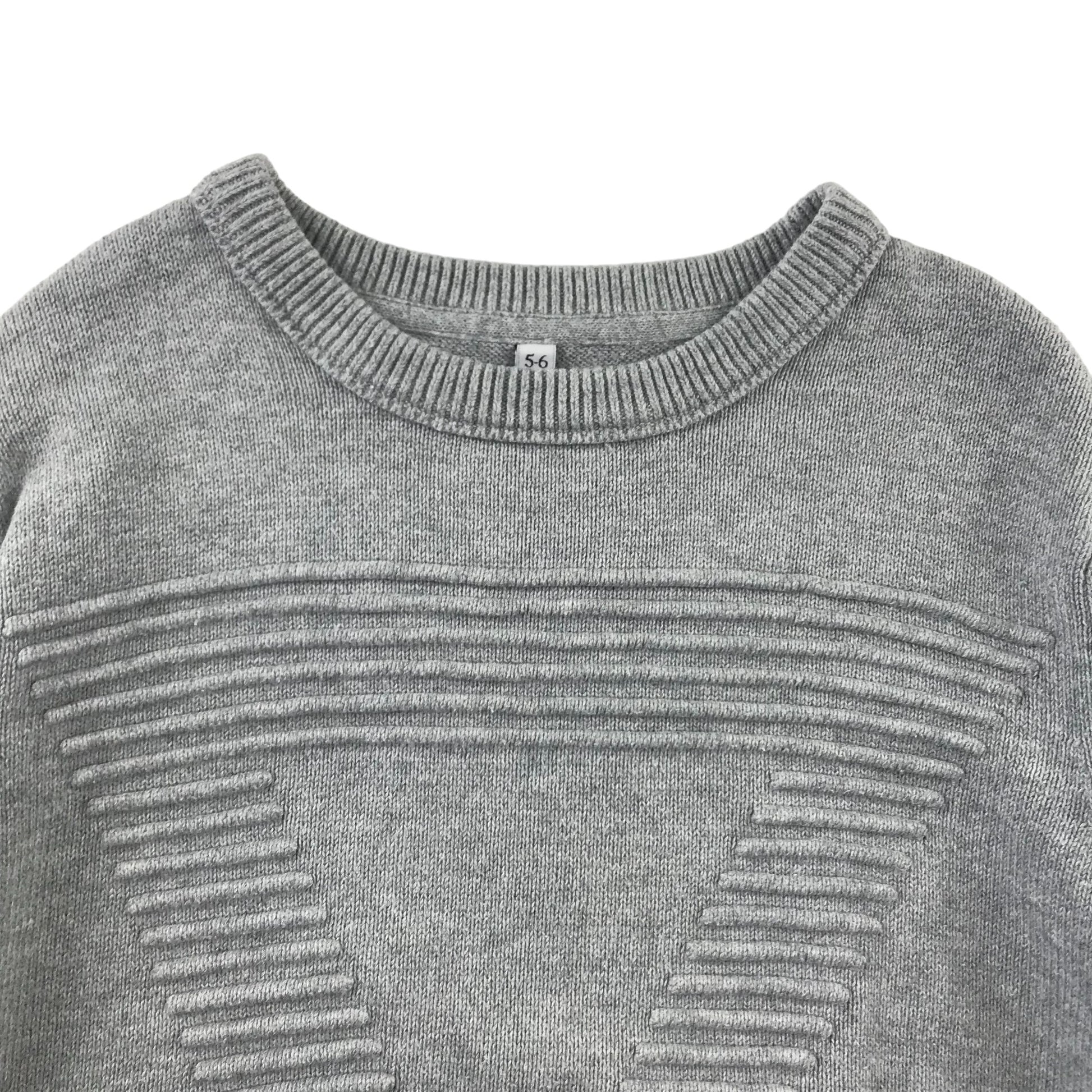 - Description: Long sleeve crew neck knitted jumper with cuffed arms, grey stripy triangle shape