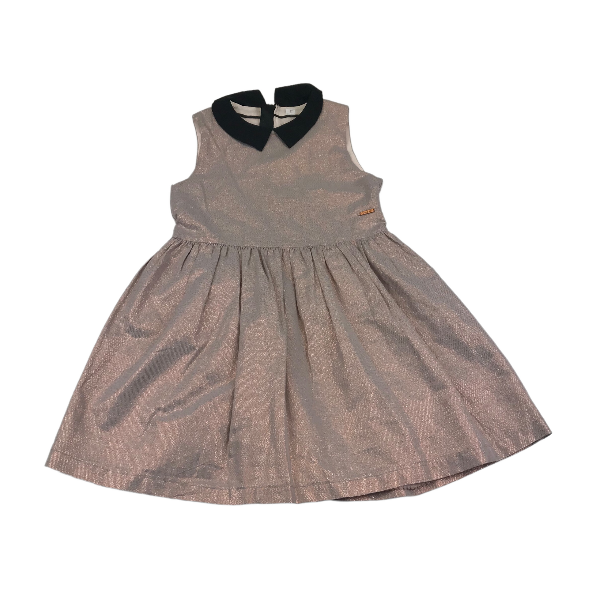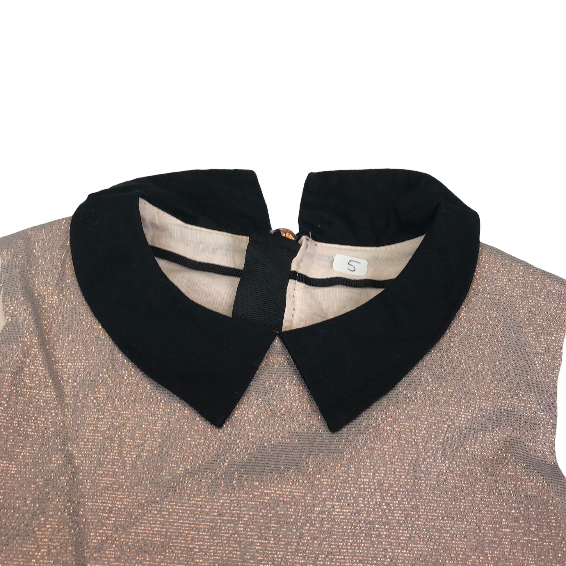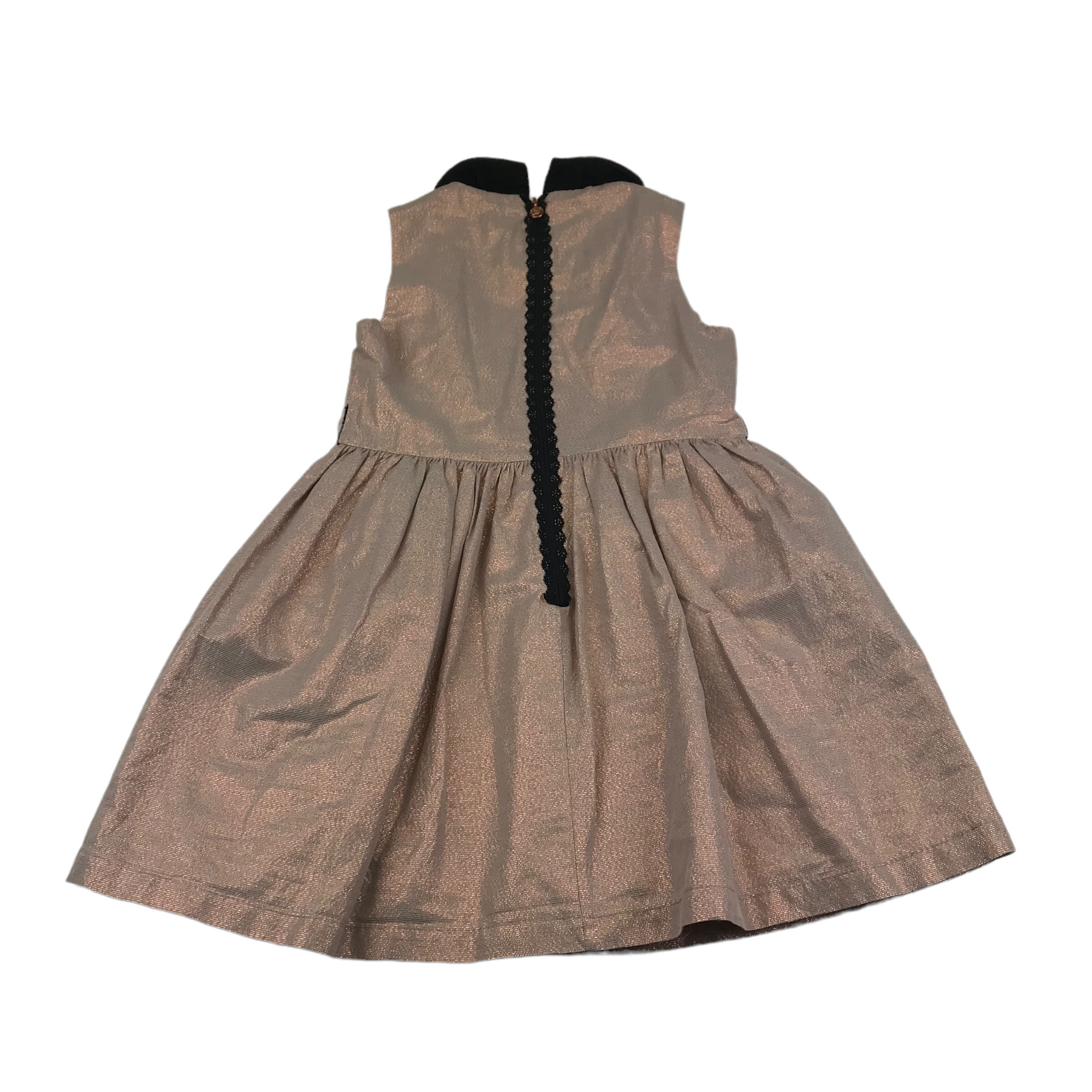 Metallic shine, vintage rose pink colour, black shirt collar, A-line style, zipper fastening in the back.