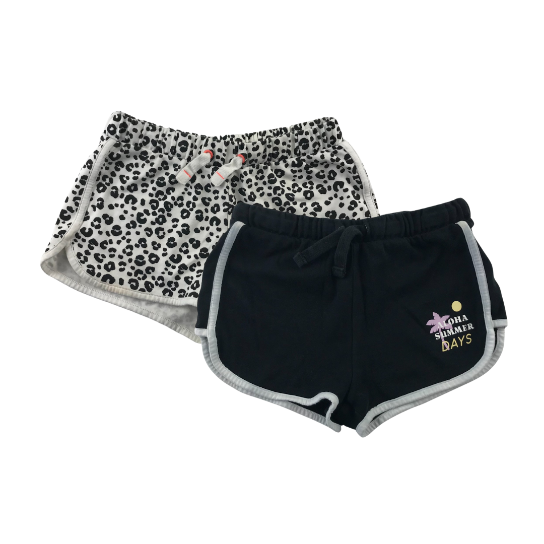 - Description: bundle of 2 pairs of jersey shorts with elasticated waistband and draw strings. One pair of black ones with Aloha print in the leg, and one pair of black and white leopard spots print pattern