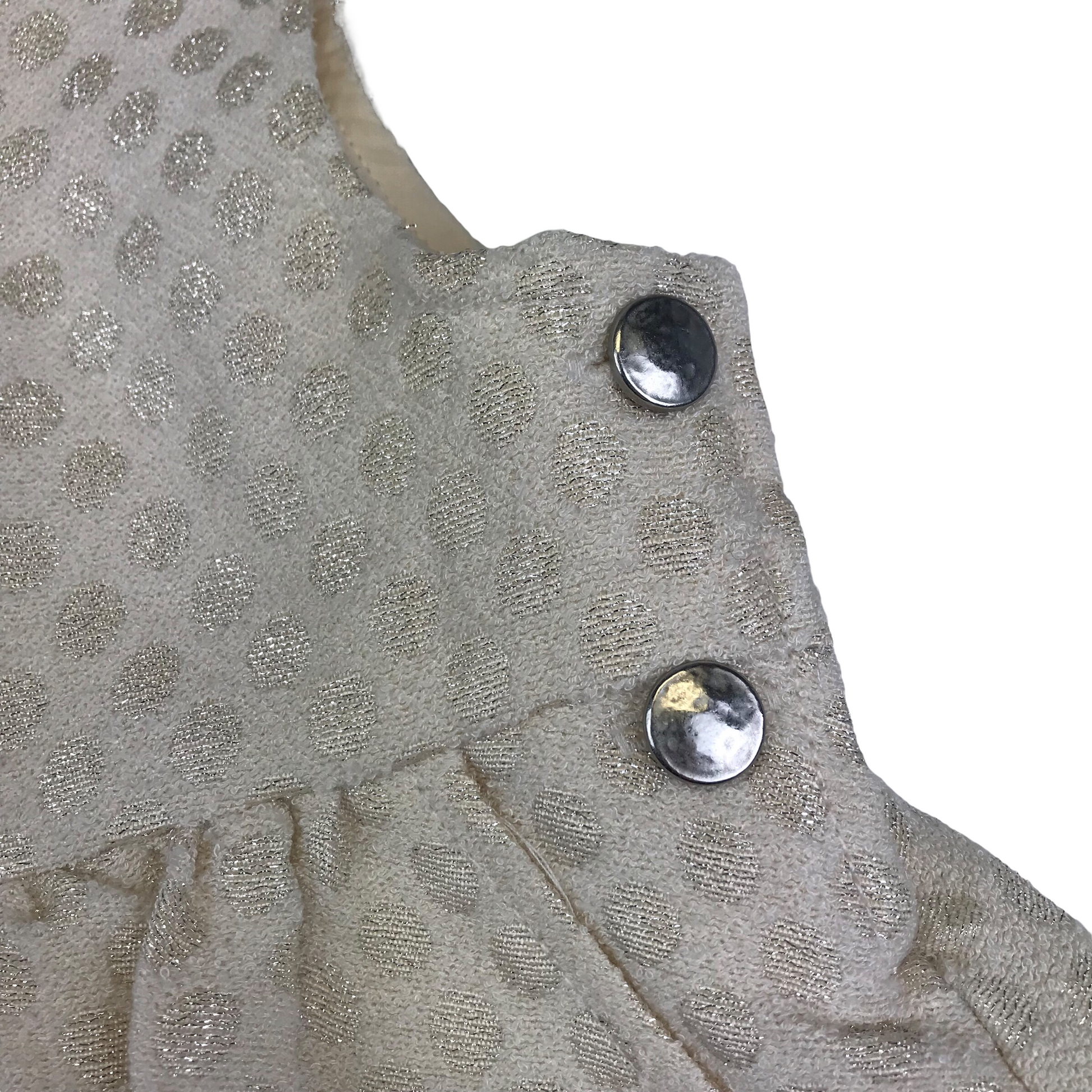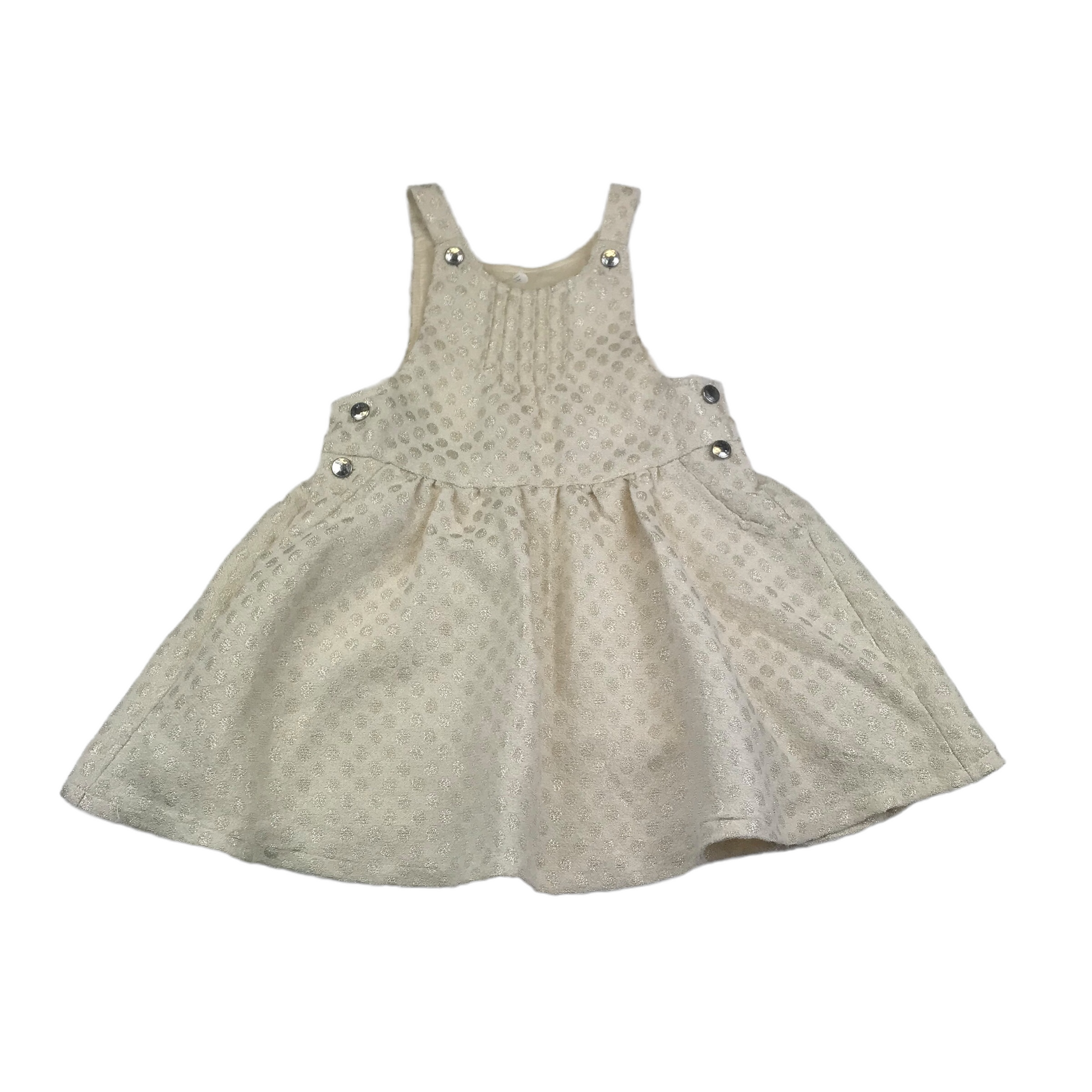 Sparkly golden polka dot pattern, side clip buttons and dungaree style button fastening on the shoulder straps