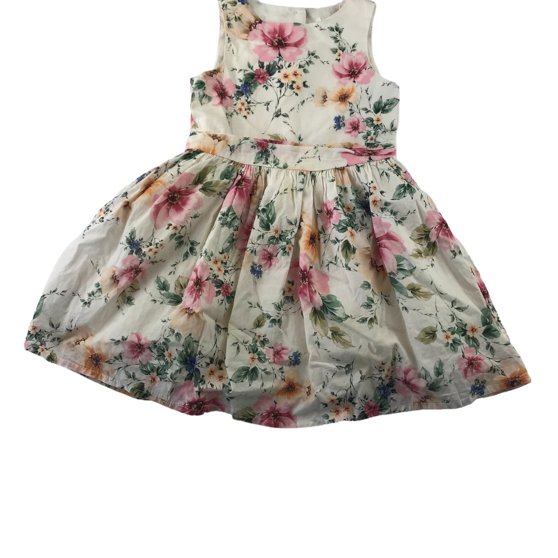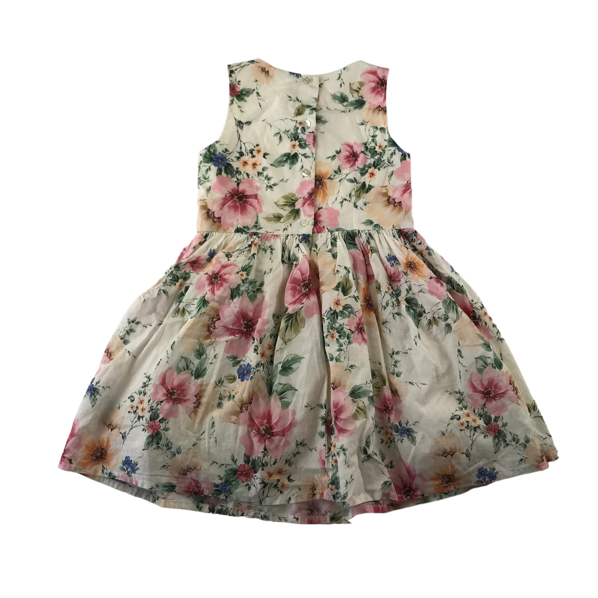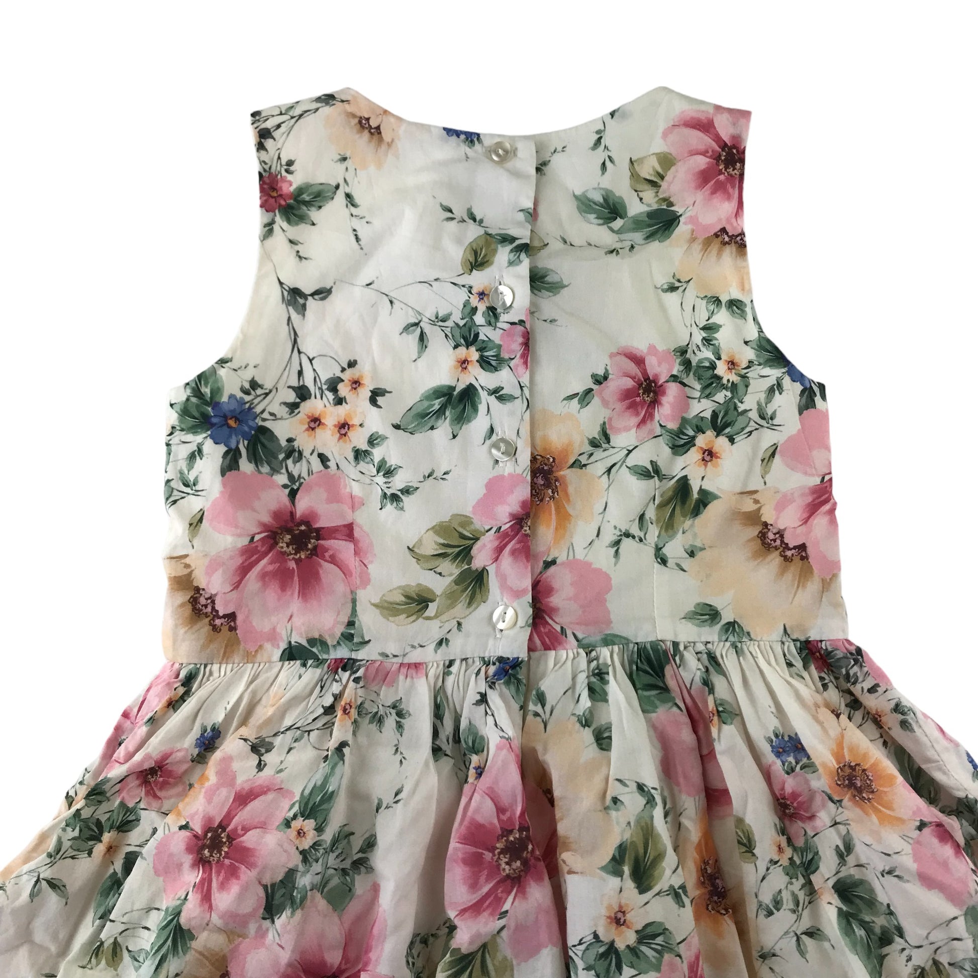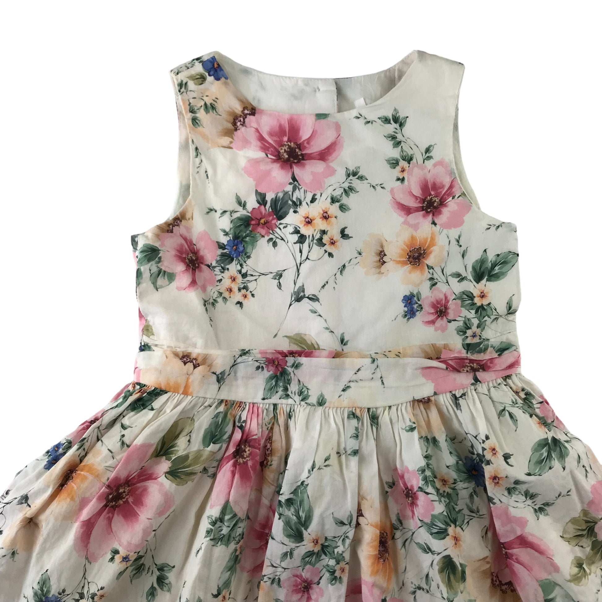 - Description: classic style summery dress with sleeveless fitted top and flared pleated skirt. large floral print pattern