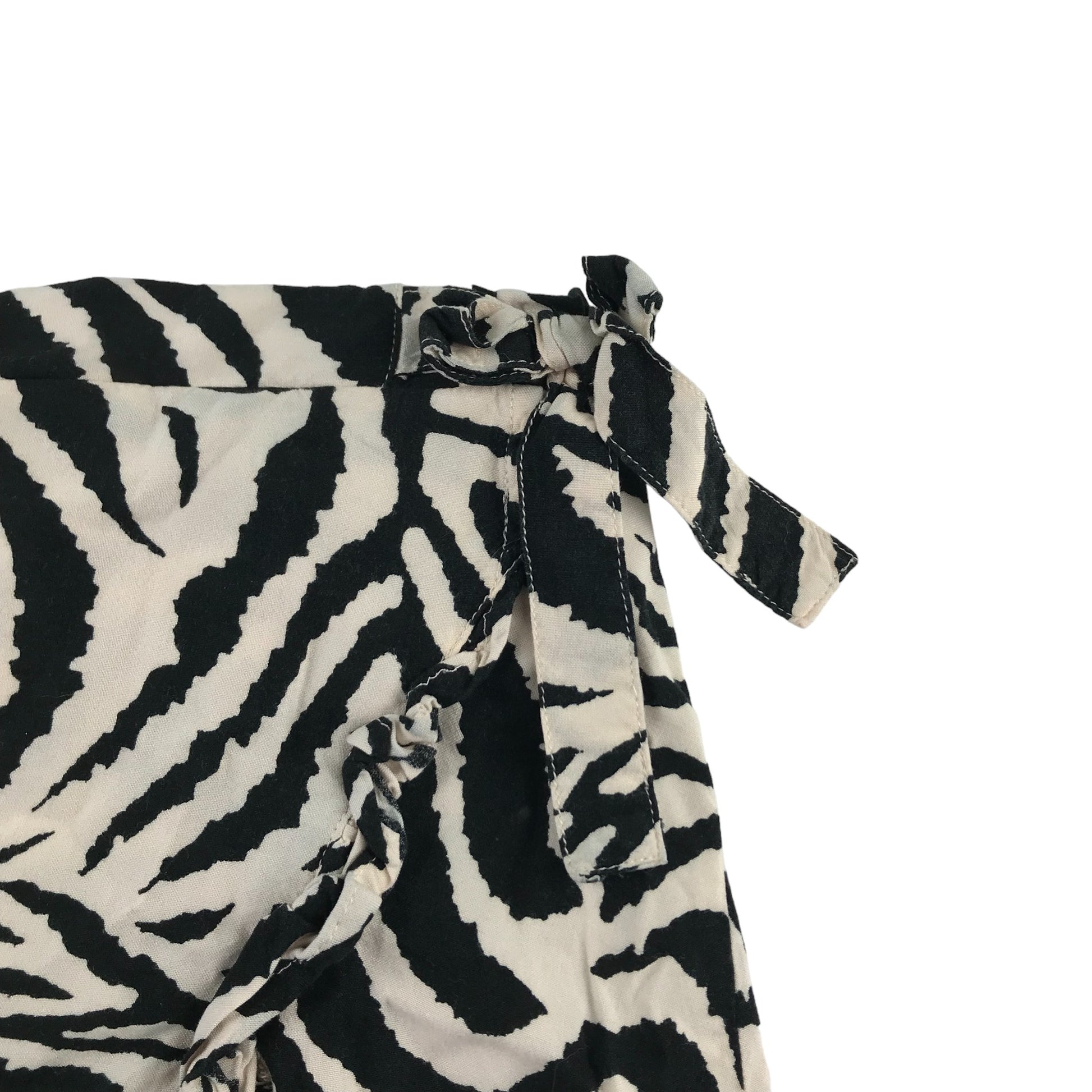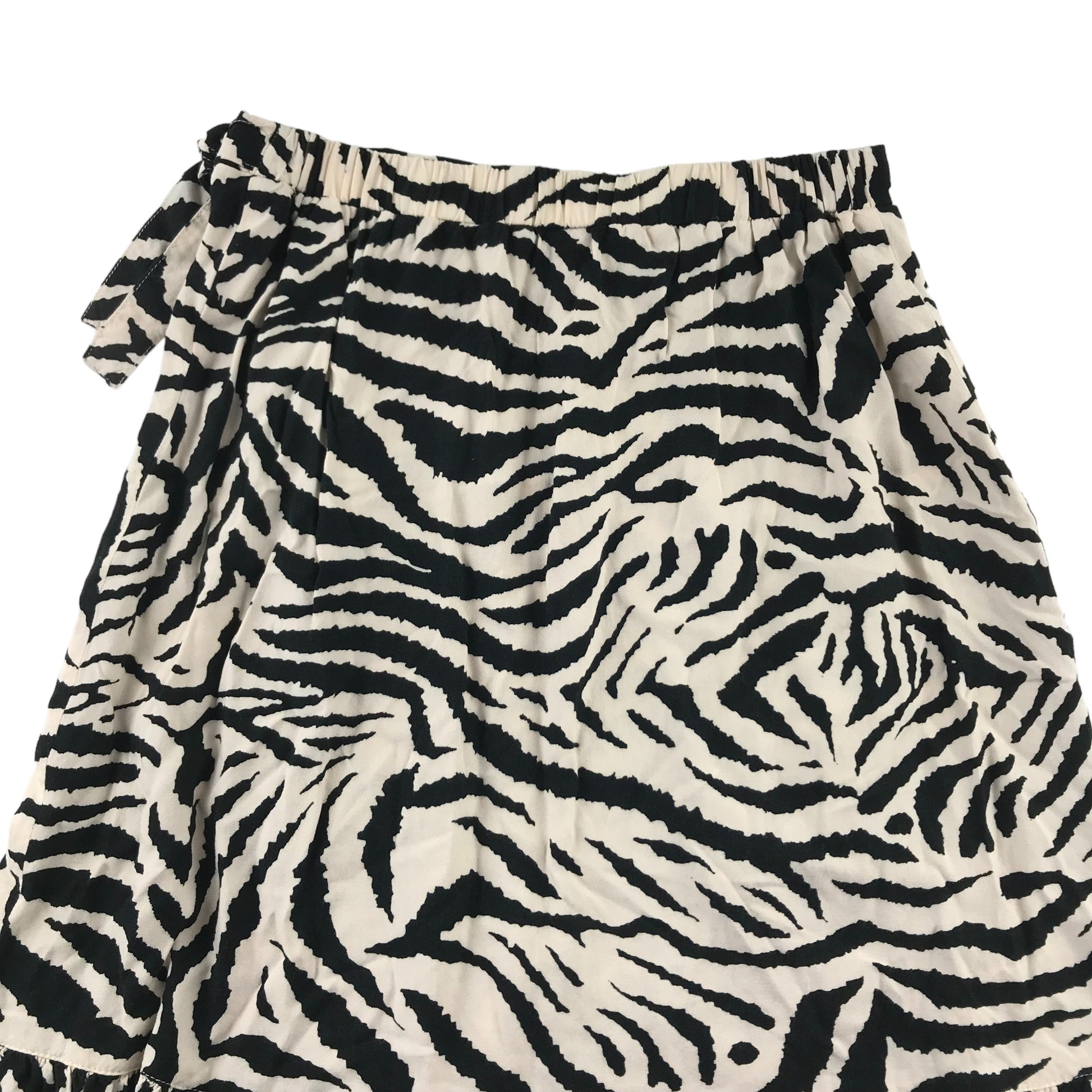 - Description: midi length tie skirt with zebra stripe pattern on a cream white