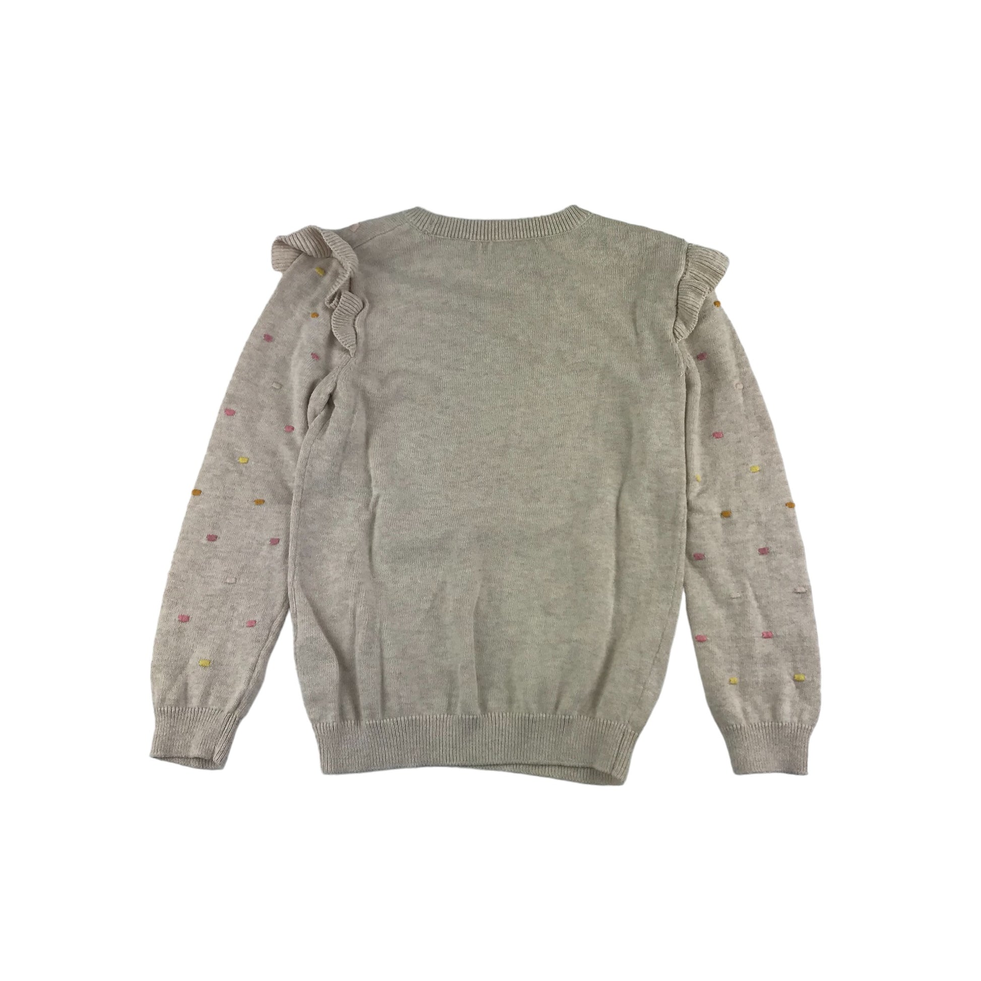- Description: Long sleeve crew neck jumper with frilled shoulder details and dotted pattern, knitted