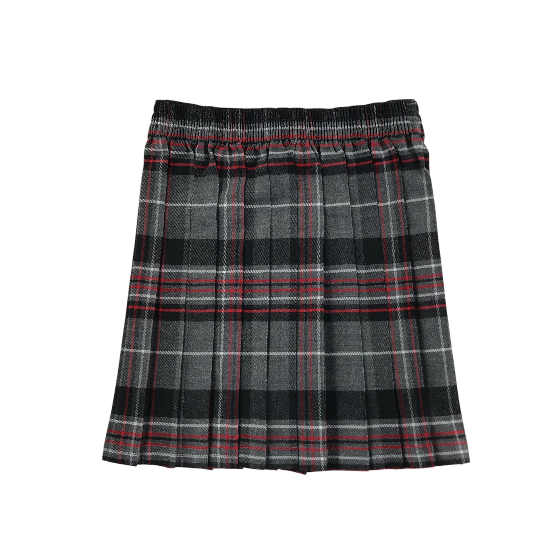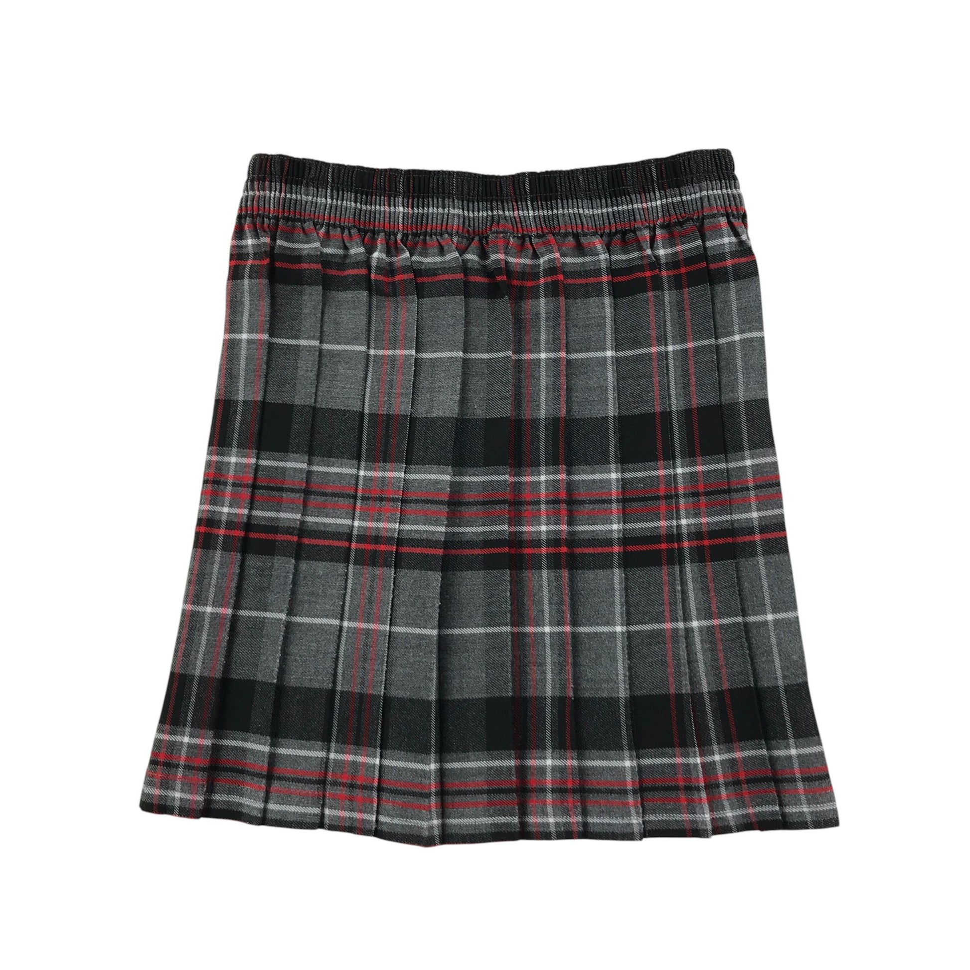 - Description: pleated school skirt with elasticated waist and grey, black red and white tartan pattern