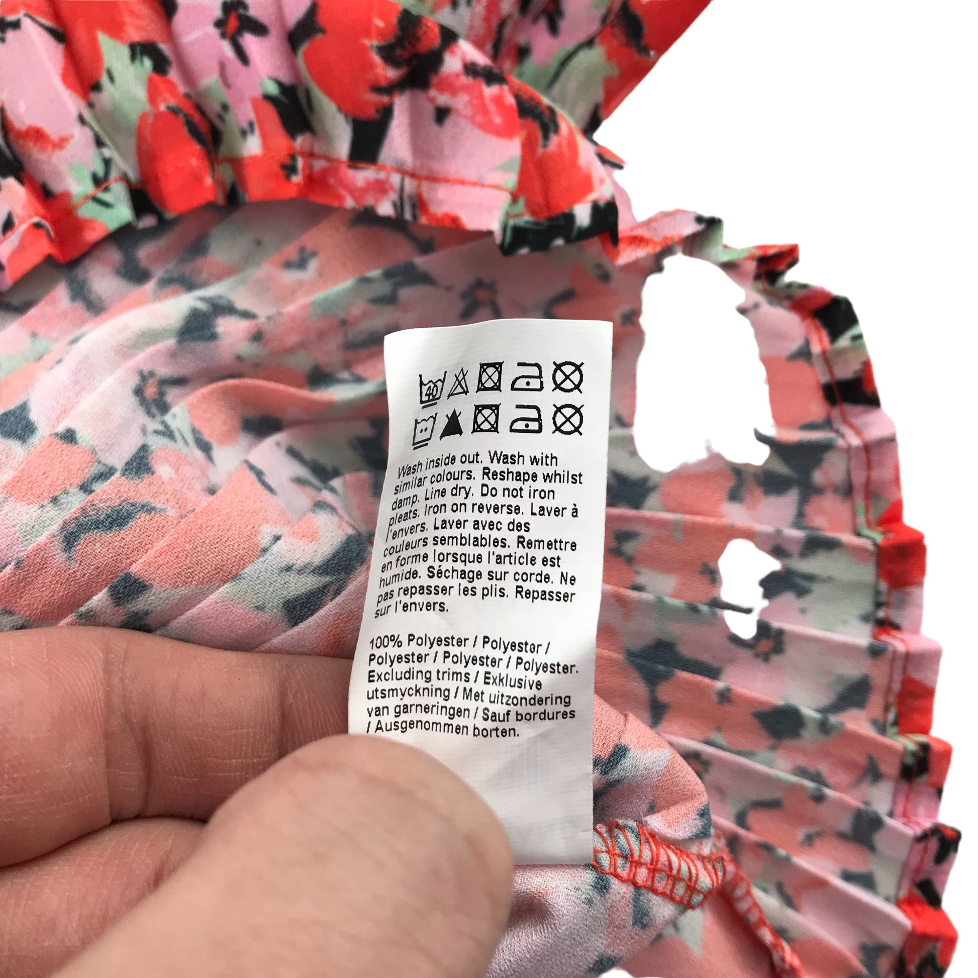 - Description: long sleeve slightly cropped summery blouse with pleated hem, crew neck, single button fastening in the back